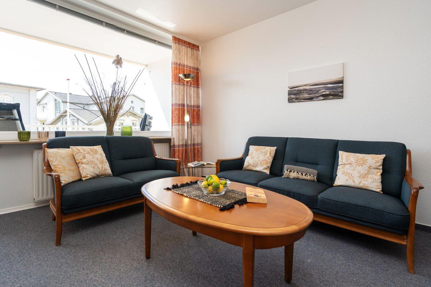 Gemütliche ca. 34 m² große Ferienwohnung für bis zu 2 Personen mit schönem Südbalkon in stadt- und strandnaher Lage. Inklusive WLAN, zugehörigem Tiefgaragenstellplatz sowie Fahrstuhl.