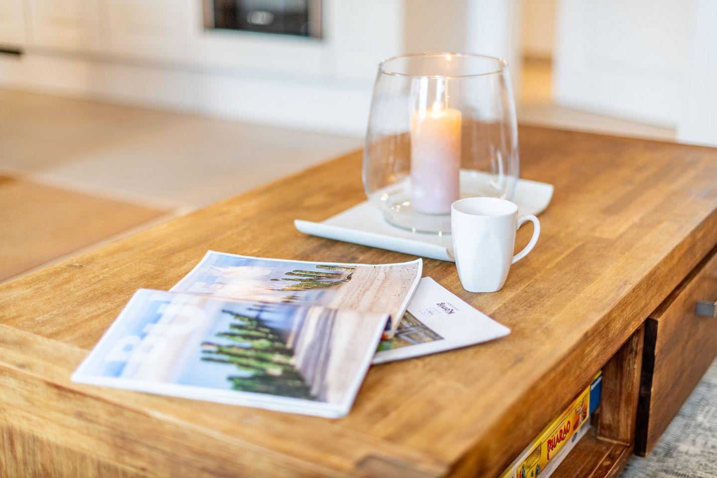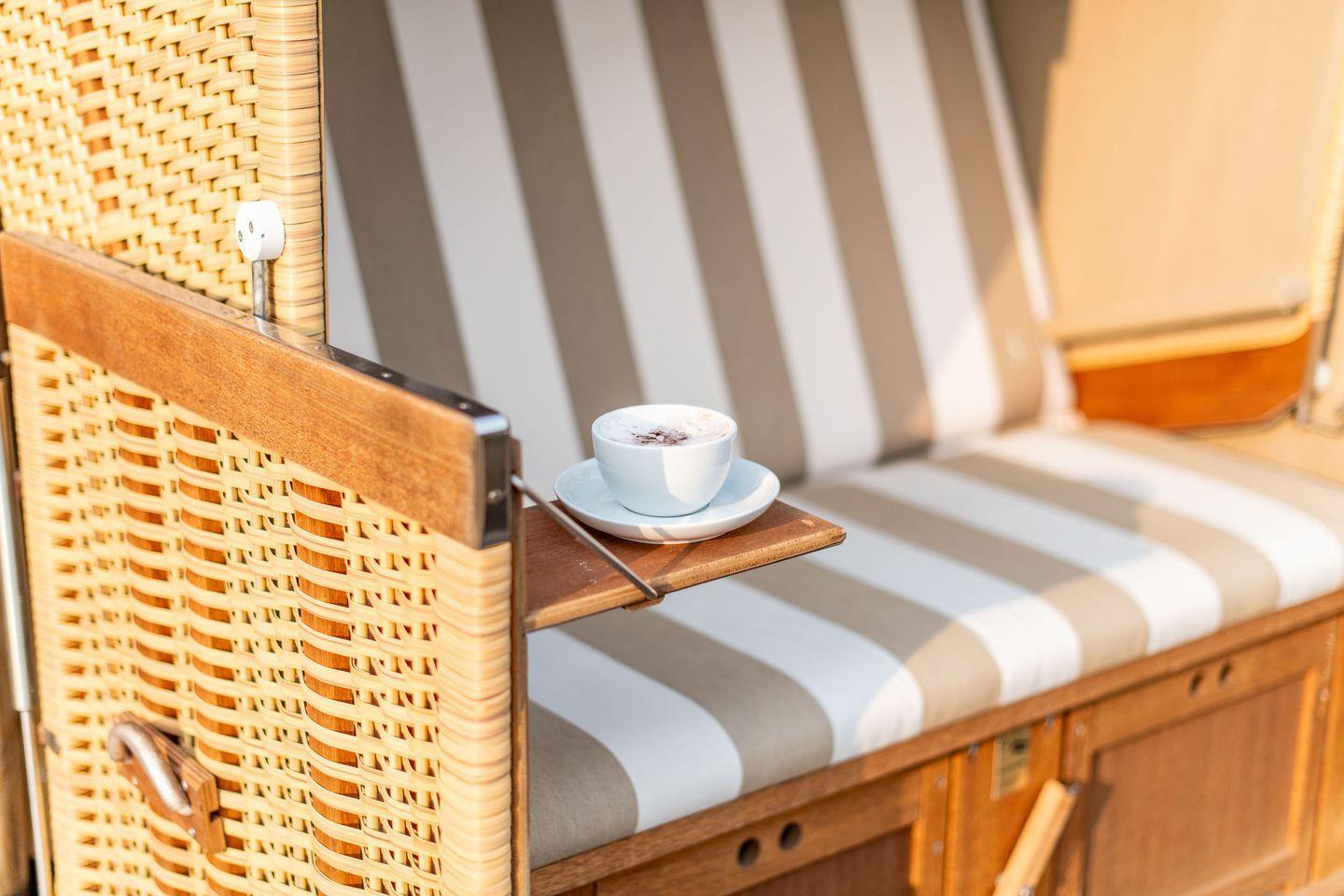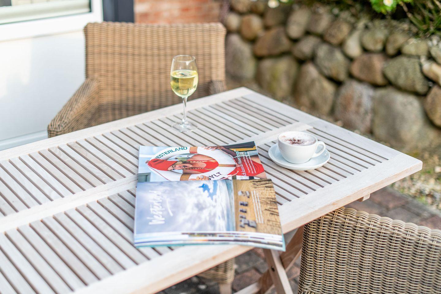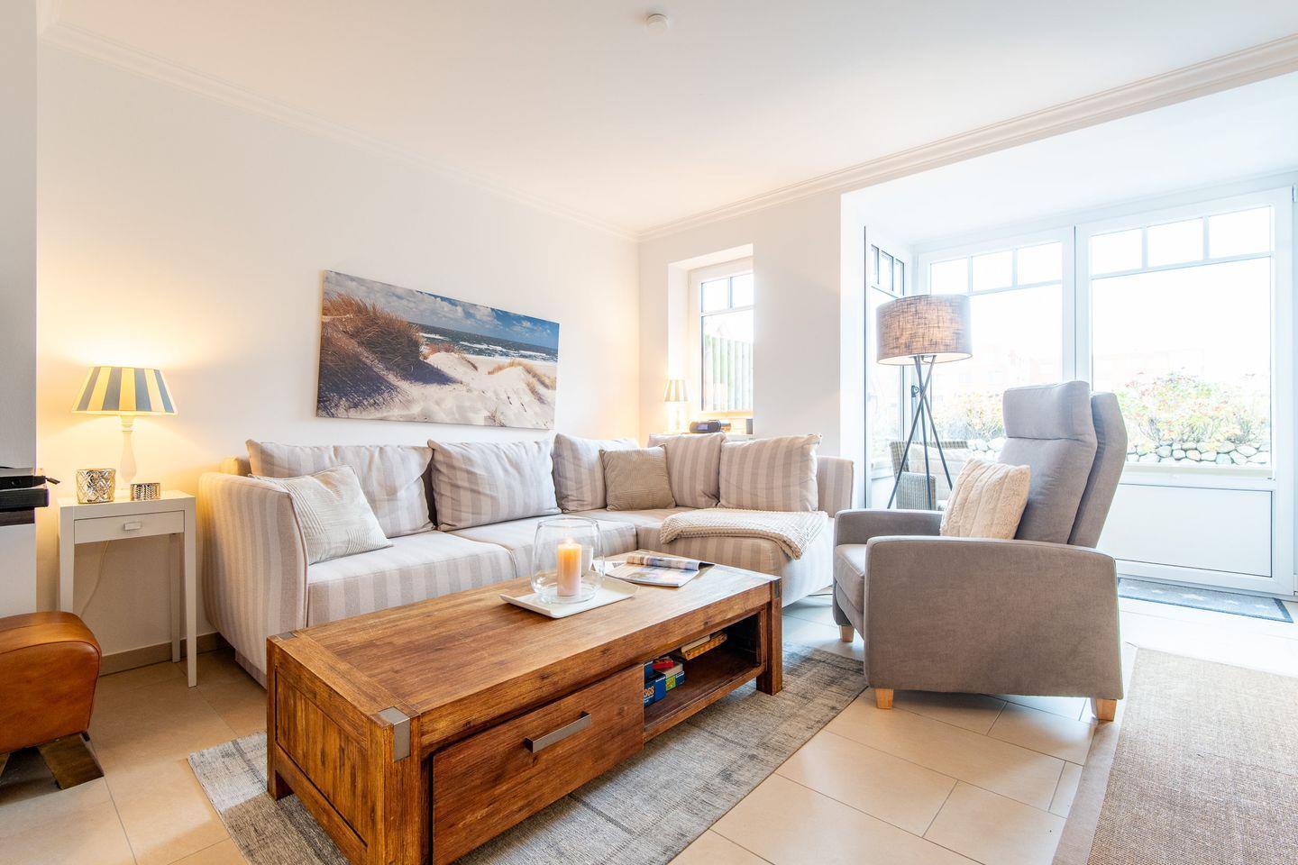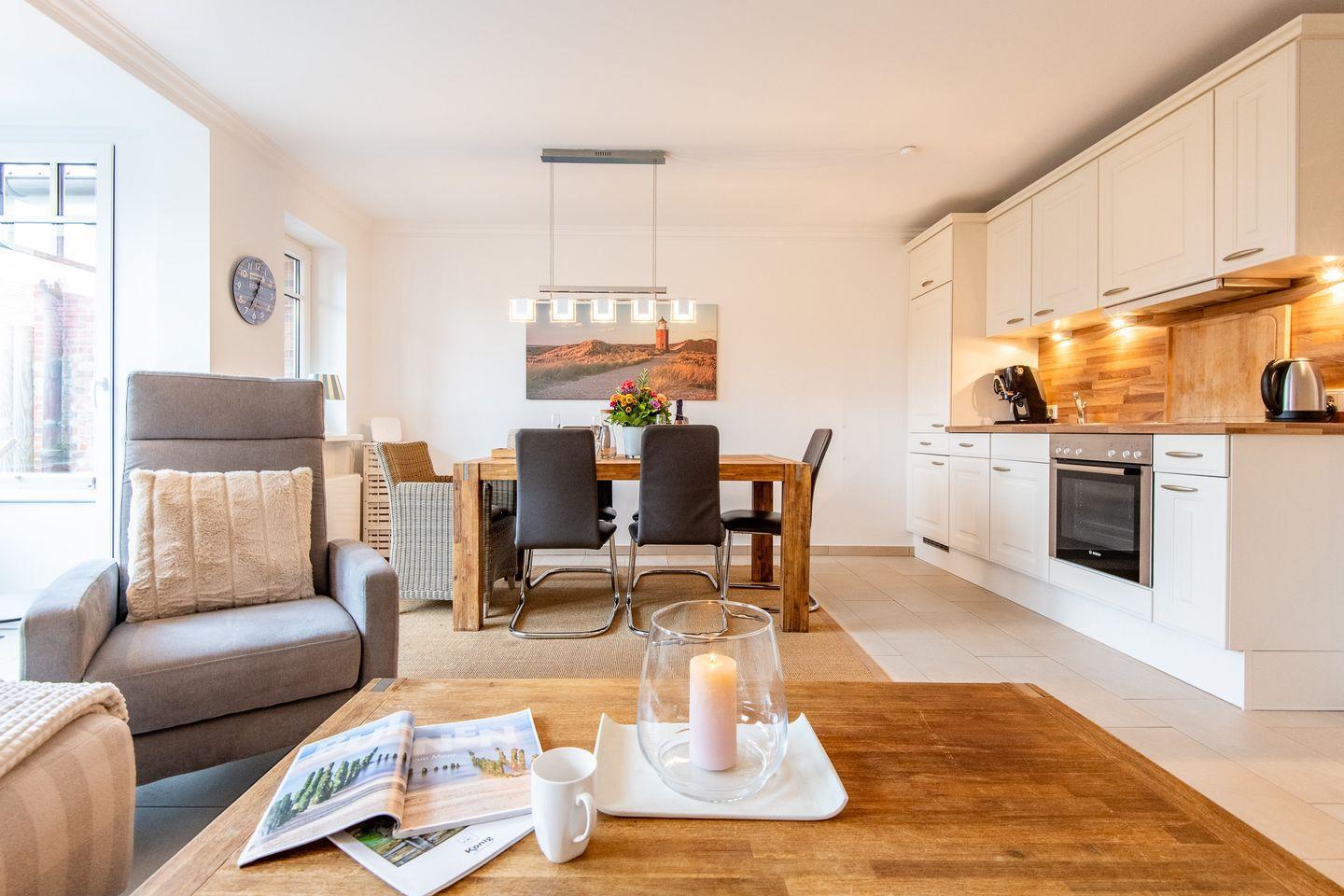 Der große Wohn- und Essbereich ist offen gestaltet und verfügt über eine gemütliche Sofaecke, einen Sessel, TV und einen Esstisch für gemeinsame Mahlzeiten. Von hier aus haben Sie direkten Zugang zur Terrasse nach Westen, die mit einem Strandkorb und Gartenanteil perfekt für entspannende Stunden im Freien ausgestattet ist.