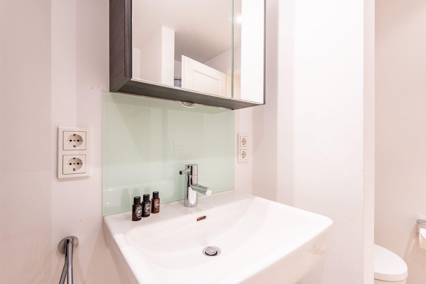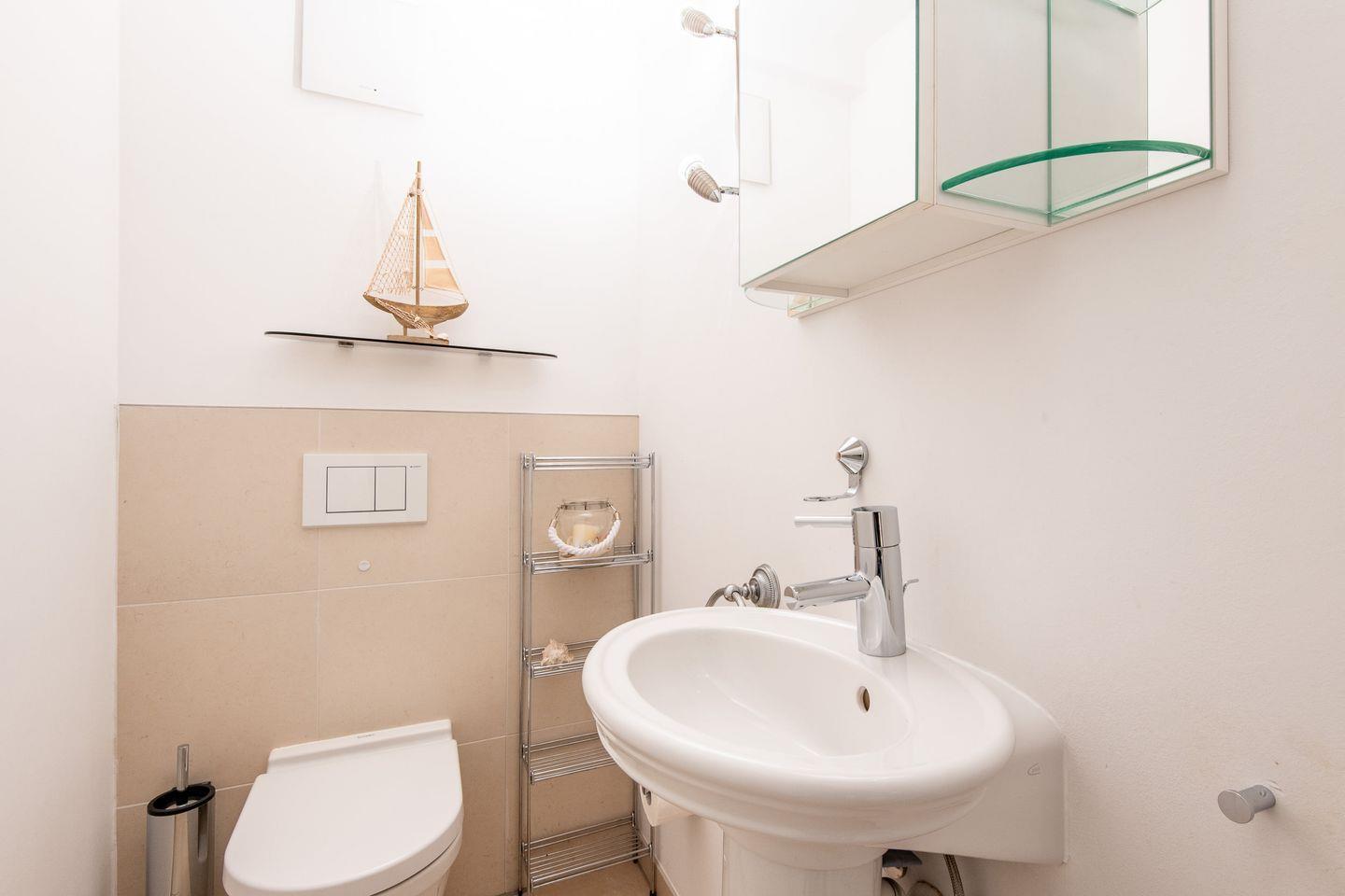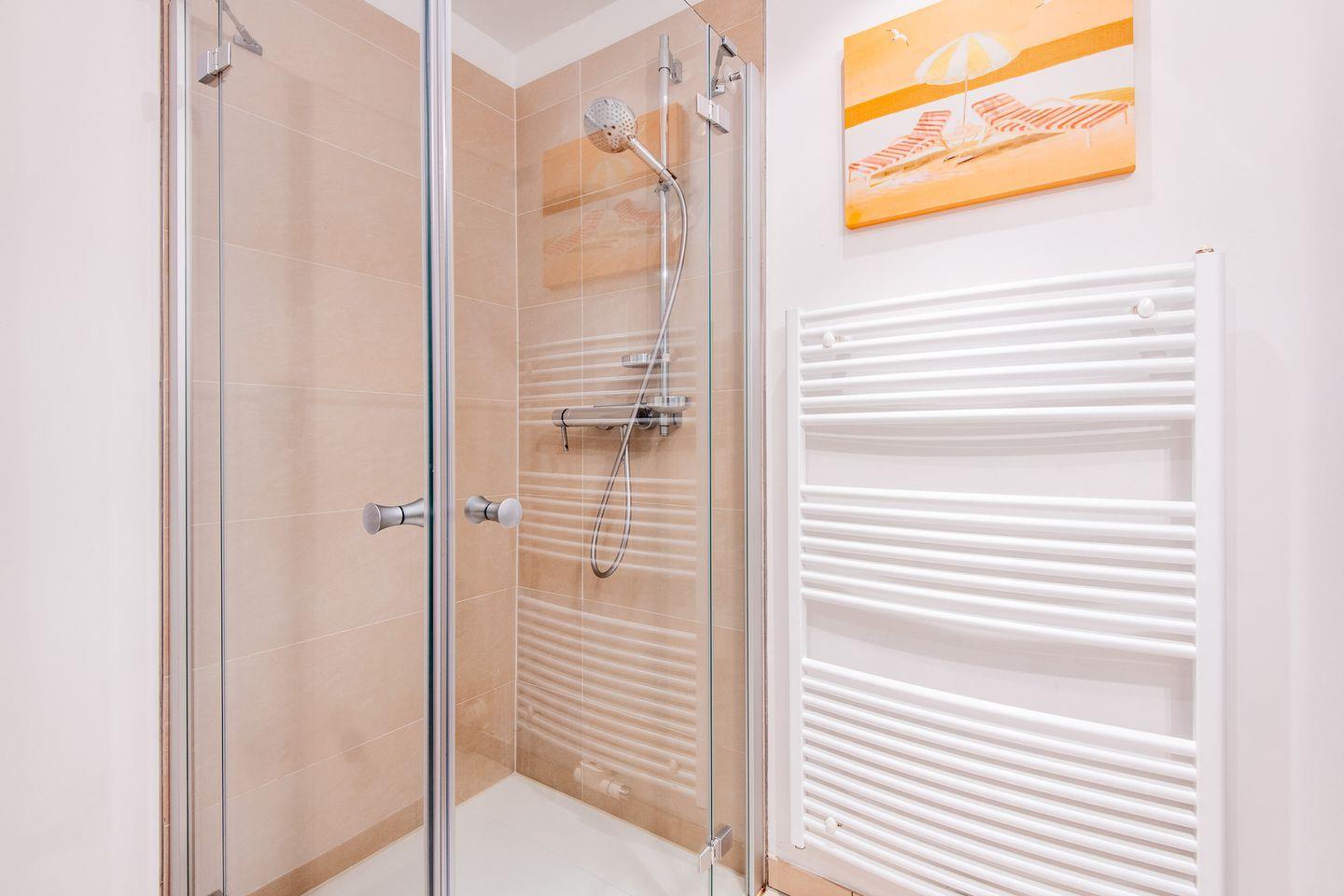 Das Badezimmer ist modern und mit einer ebenerdigen Dusche, WC, Handtuchwärmer, Fußbodenheizung und einem Föhn ausgestattet und bietet ein komfortables und freundliches Ambiente. Im Eingangsbereich befindet sich zusätzlich ein Gäste-WC für mehr Komfort.