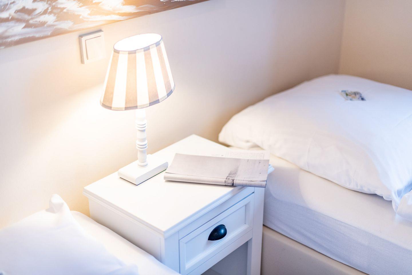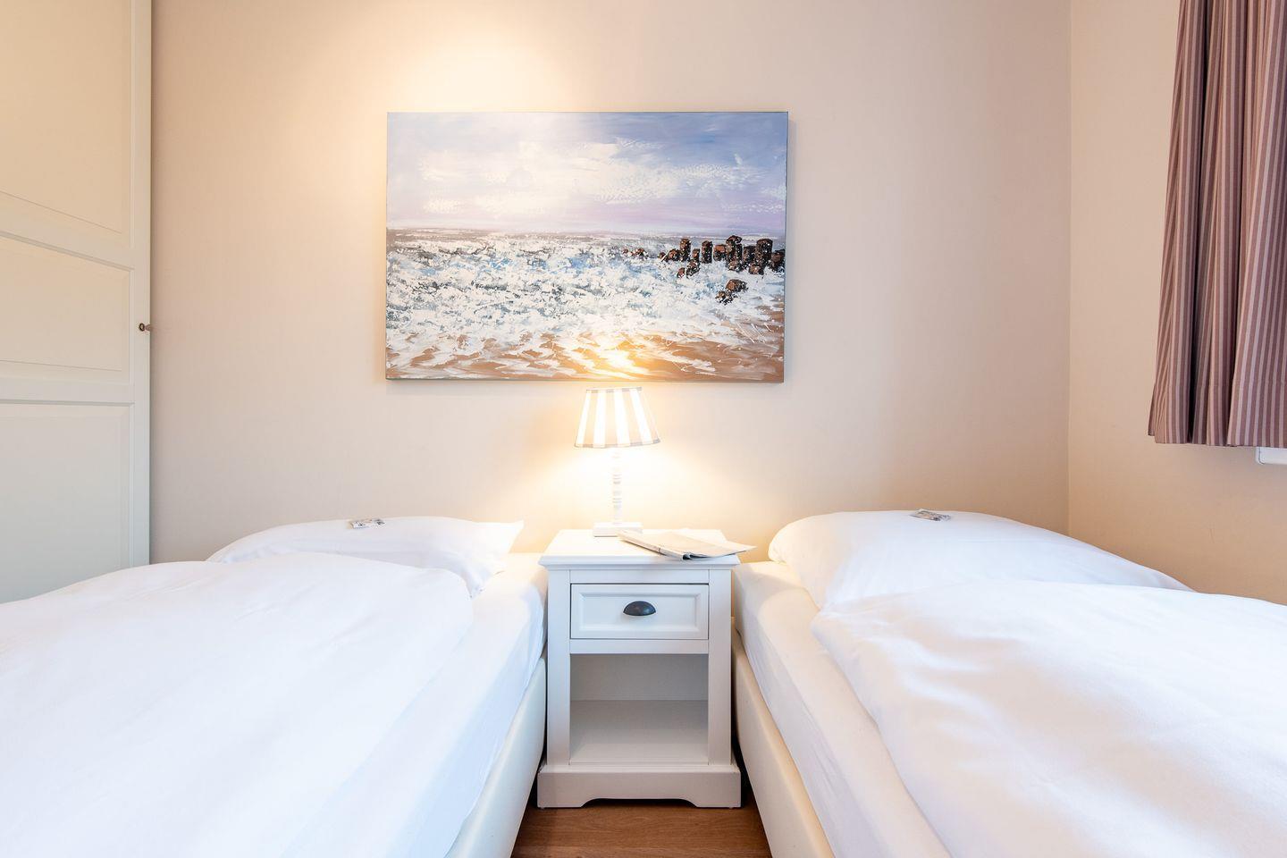 Das erste Schlafzimmer ist mit einem komfortablen Doppelbett (2x 90x200 cm), einem Kleiderschrank und einer Kommode ausgestattet, die viel Stauraum bieten. Das zweite Schlafzimmer verfügt über zwei Einzelbetten (je 80x200 cm), die auch zusammengeschoben werden können, sowie einen Kleiderschrank – ideal für flexibles Schlafen.