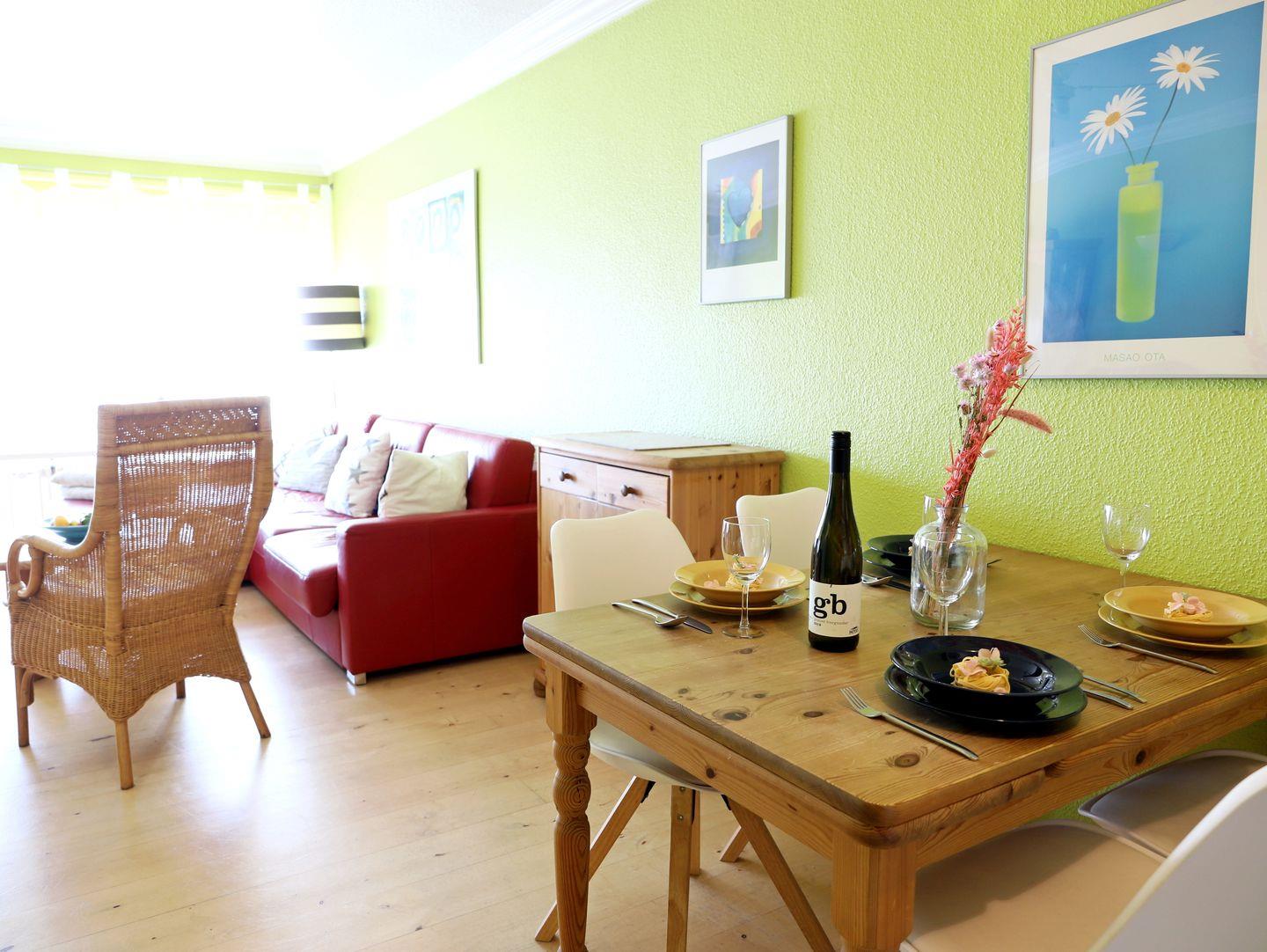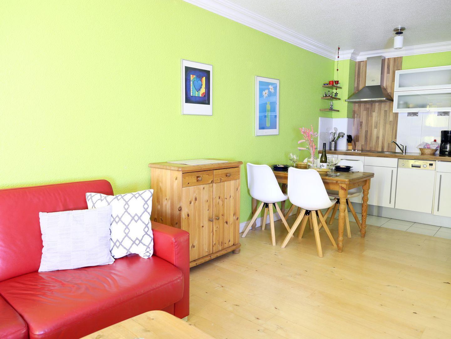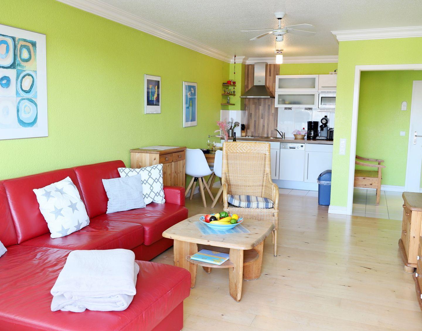 Erleben Sie einen entspannten Urlaub in diesem modernen 54 m² großen 2-Zimmer-Appartement im Herzen von Westerland. Es befindet sich in der 3. Etage eines zentral gelegenen Appartementhauses mit Schwimmbad und Sauna. Der Wohn-/Essbereich verfügt über eine Schlafcouch (150 x 190 cm) und eine offene, voll ausgestattete Küche mit Cerankochfeld, Spülmaschine und Mikrowelle. Im Schlafzimmer sorgt ein Doppelbett (180 x 200 cm) für erholsamen Schlaf. Das Badezimmer bietet Dusche und WC. Vom nach Westen ausgerichteten Balkon genießen Sie sonnige Stunden. Ein Tiefgaragenstellplatz (Park-Combilift) steht zur Verfügung – bitte beachten Sie die Maße für Ihr Fahrzeug (Länge: 5,0 m, Breite: 1,85 m, Höhe: 1,7 m). Zusätzlich gibt es einen Fahrradkeller ohne garantierten Stellplatz. Waschmaschine, Trockner und Sauna sind gegen Münzeinwurf nutzbar. Haustiere sind herzlich willkommen.