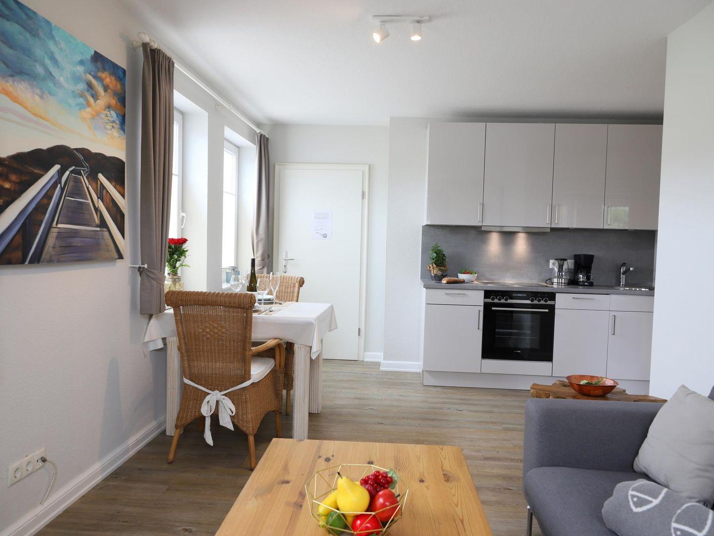 Helle 2-Zimmer-Wohnung in Westerland mit indirektem Stellplatz und Hund erlaubt. Nur wenige Minuten zum Strand. Ideal für 2 Personen, mit Doppelbett und moderner Küche.