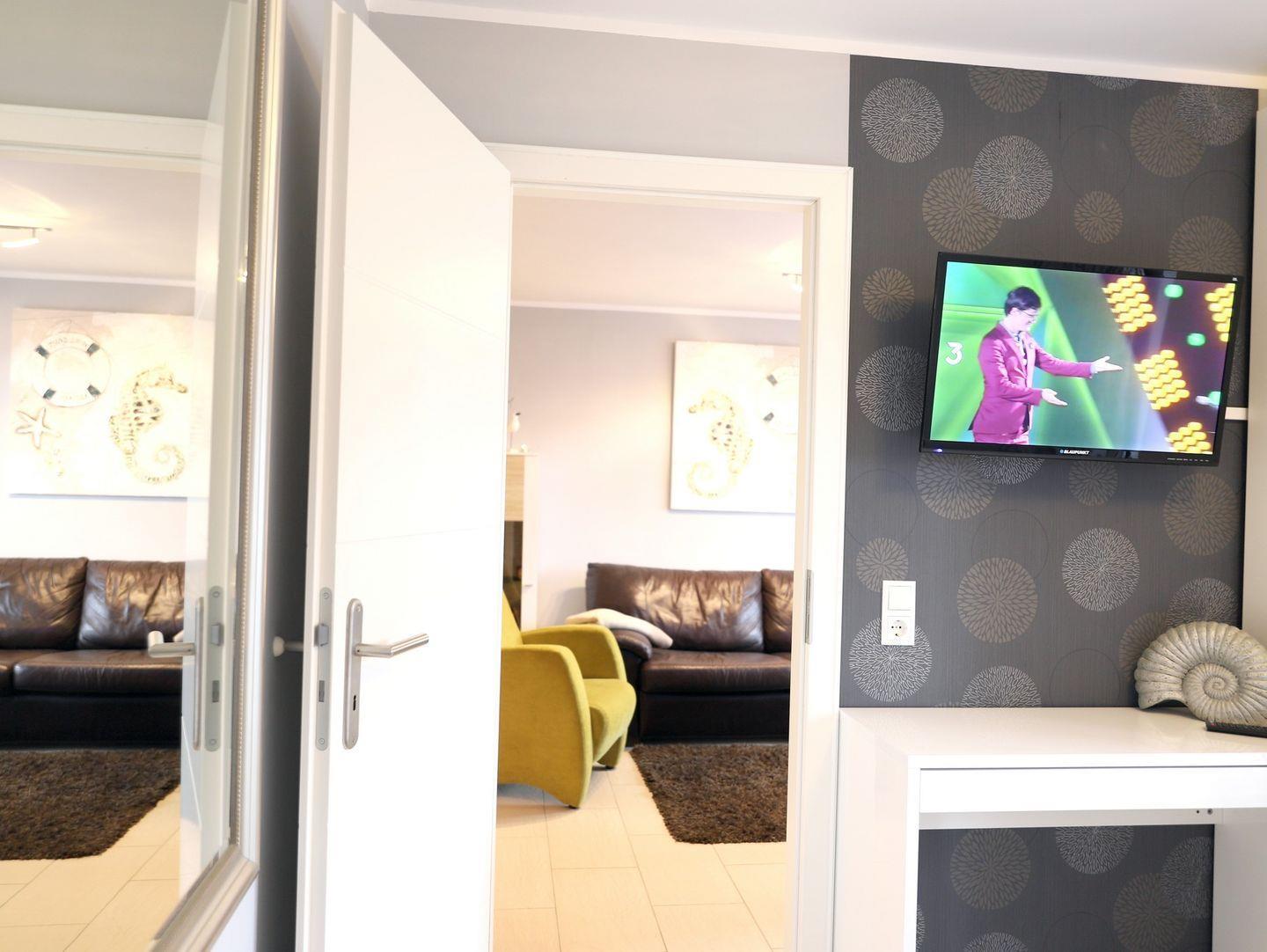 Dieses moderne 48 m² große Appartement in zentraler Lage von Westerland bietet Komfort für bis zu 3 Personen. Es befindet sich im 5. Stock des Hauses (Haus Ankerlicht) und ist bequem mit dem Fahrstuhl erreichbar. Vom West-Balkon aus genießen Sie einen wunderbaren Blick auf den Rathausmarkt. Der Wohnbereich ist stilvoll eingerichtet mit einem Ledersofa, Flat-TV, Stereoanlage und einem gemütlichen Esstisch. Hier steht auch ein Schlafsofa (140 x 200 cm) für eine dritte Person bereit. Die integrierte Küche bietet modernen Komfort für eine angenehme Selbstversorgung. Das separate Schlafzimmer verfügt über ein komfortables Doppelbett (180 x 200 cm) und einen zusätzlichen Flat-TV. Zur Wohnung gehört ein Tiefgaragenstellplatz (max. Durchfahrtshöhe 1,8 m). Ein Abstellraum für Fahrräder sowie eine Waschküche mit Münz-Waschmaschine und -Trockner sind ebenfalls vorhanden. Haustiere sind herzlich willkommen. Genießen Sie die zentrale Lage und kurze Wege zu Strand, Restaurants und Einkaufsmöglichkeiten!