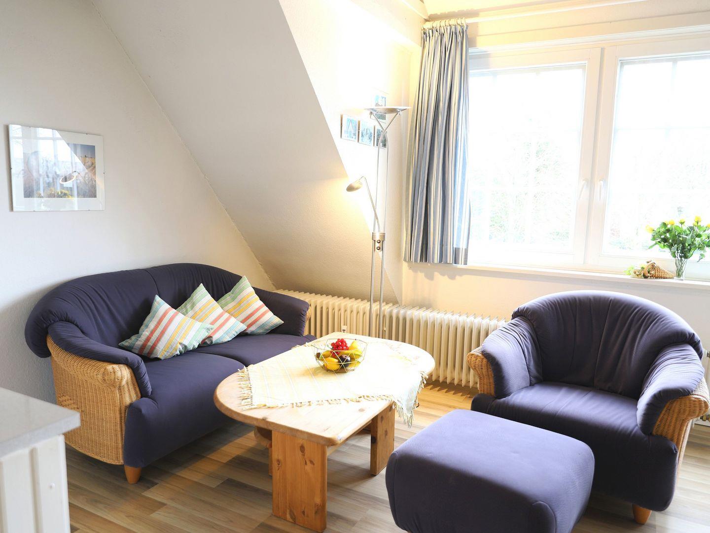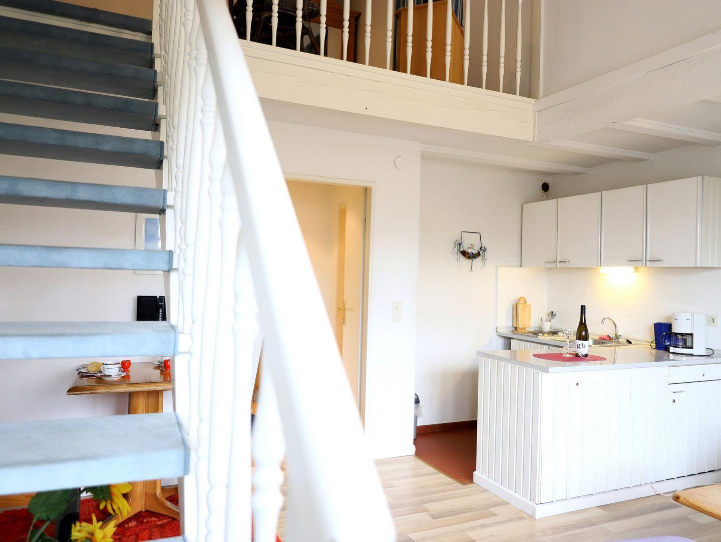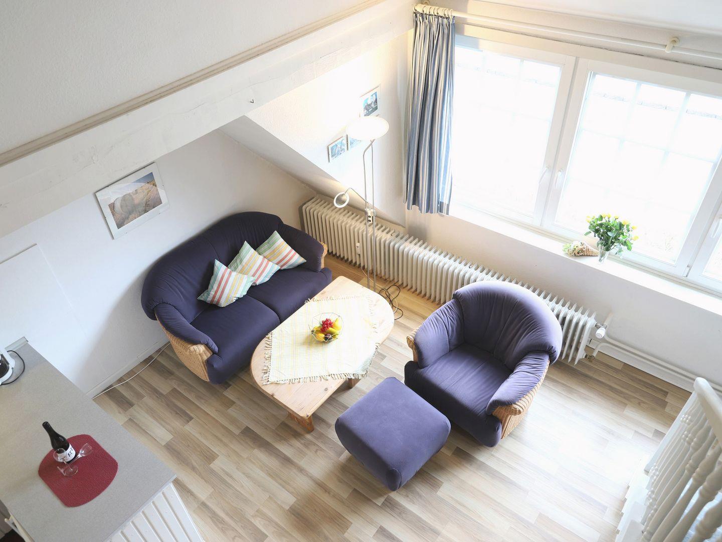 Diese 30?m² große Ferienwohnung für 2 Personen ist sehr einfach und funktional ausgestattet, ideal für Gäste, die eine praktische Unterkunft suchen, zum Beispiel auch für Handwerksfirmen oder Monteure. Sie befindet sich im Obergeschoss/Dachgeschoss eines ruhigen Hauses in Alt-Westerland. Der Wohnbereich bietet eine Couchgarnitur, einen Essplatz, einen Flatscreen-TV und eine Stereoanlage. Die offene Küchenzeile ist mit einem 2-Plattenherd und einem Kühlschrank ausgestattet. Über eine offene Treppe gelangt man ins Dachgeschoss mit einem offenen Schlafbereich und einem Doppelbett (180?x?200?cm). Ein Kleiderschrank und eine kleine Abseite bieten Stauraum. Das Badezimmer ist mit Badewanne und WC ausgestattet. Ein kostenloser Parkplatz befindet sich direkt vor dem Haus. Die Wohnung liegt ruhig, gegenüber der alten Dorfkirche von Westerland. Strand, Zentrum, Restaurants und Einkaufsmöglichkeiten sind in wenigen Minuten erreichbar. Haustiere sind nicht erlaubt.