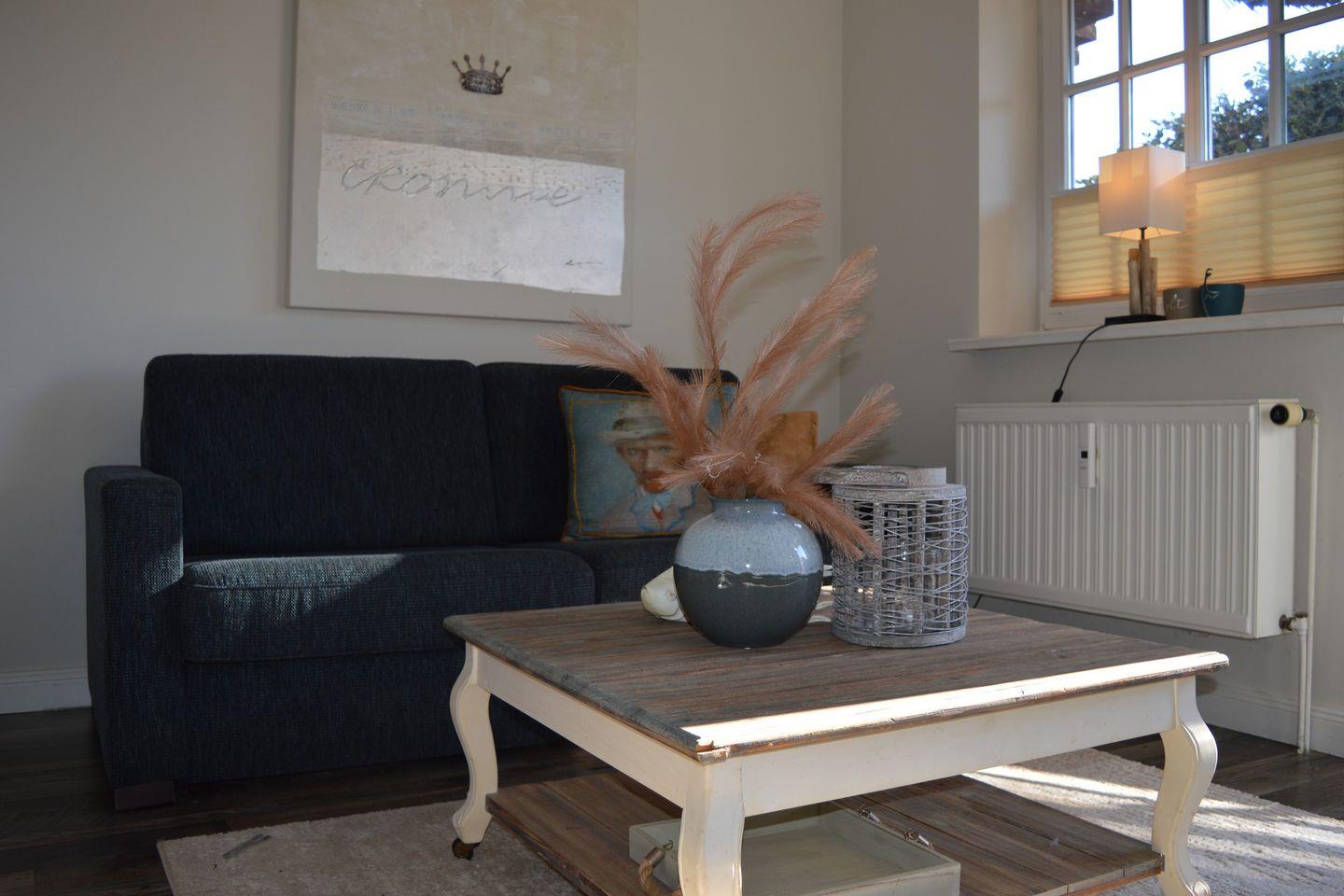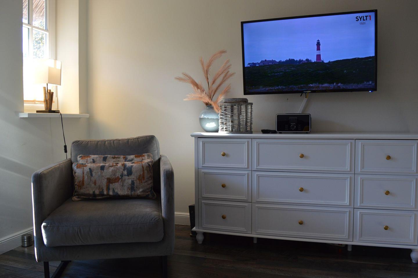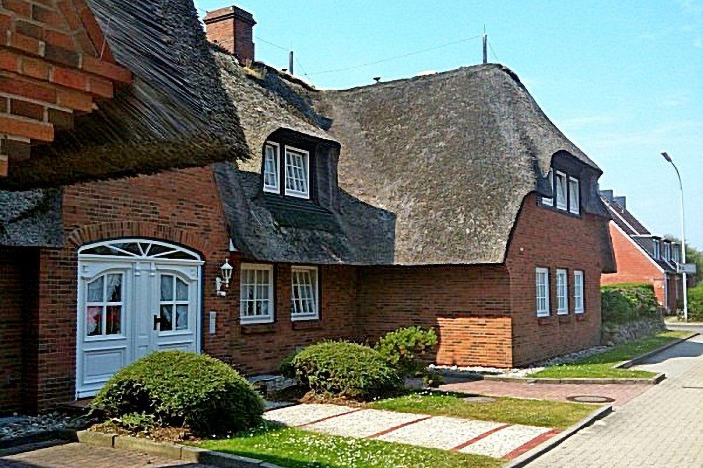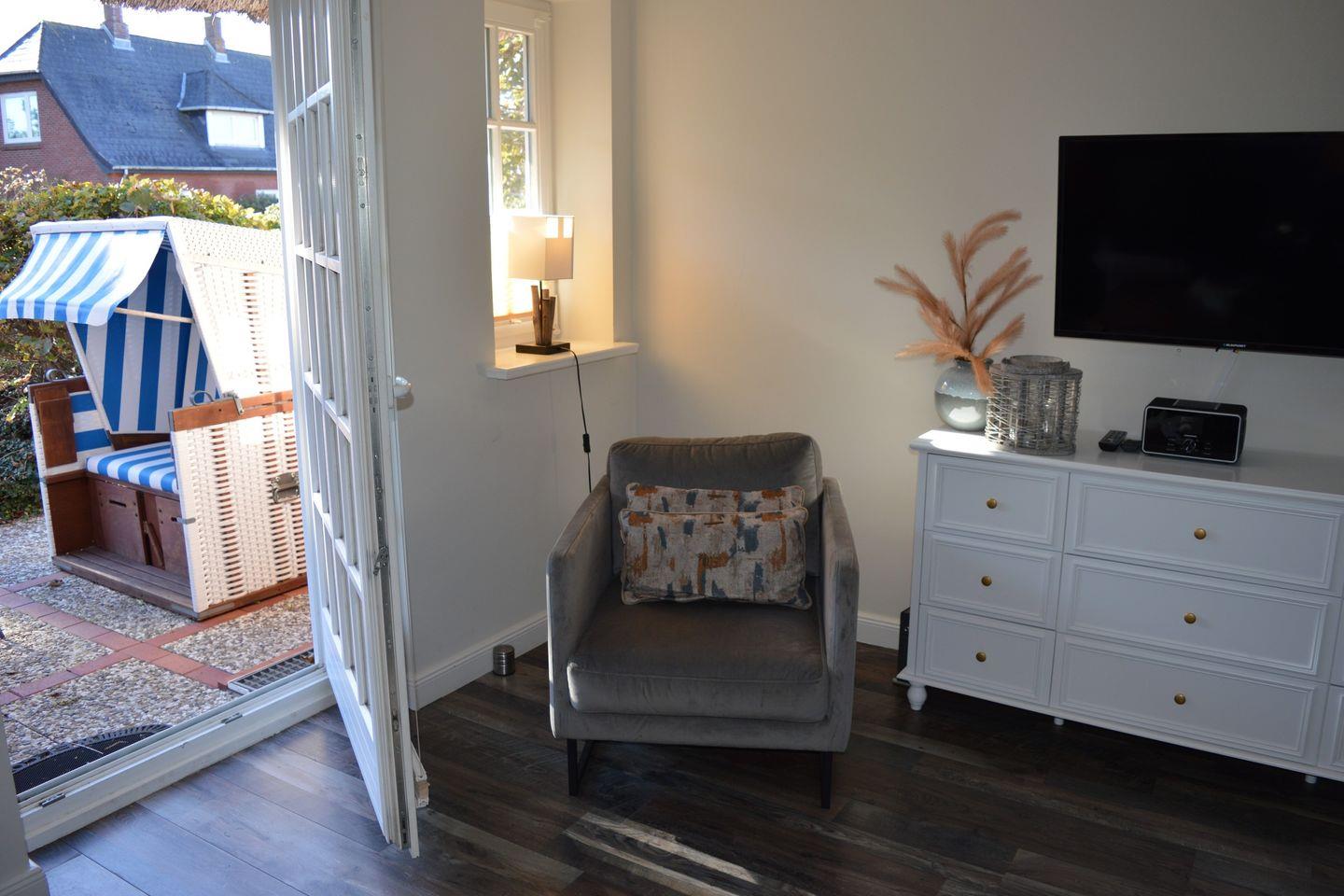 Diese geschmackvoll eingerichtete 45 m² große 2-Zimmer-Wohnung im Erdgeschoss eines typisch sylter Reetdachhauses bietet Platz für bis zu 3 Personen. Das helle Wohn- und Esszimmer mit moderner Küchenzeile lädt zu gemütlichen Stunden ein. Es verfügt über ein Schlafsofa (140 x 190 cm) und ist der ideale Ort, um nach einem langen Tag zu entspannen.
