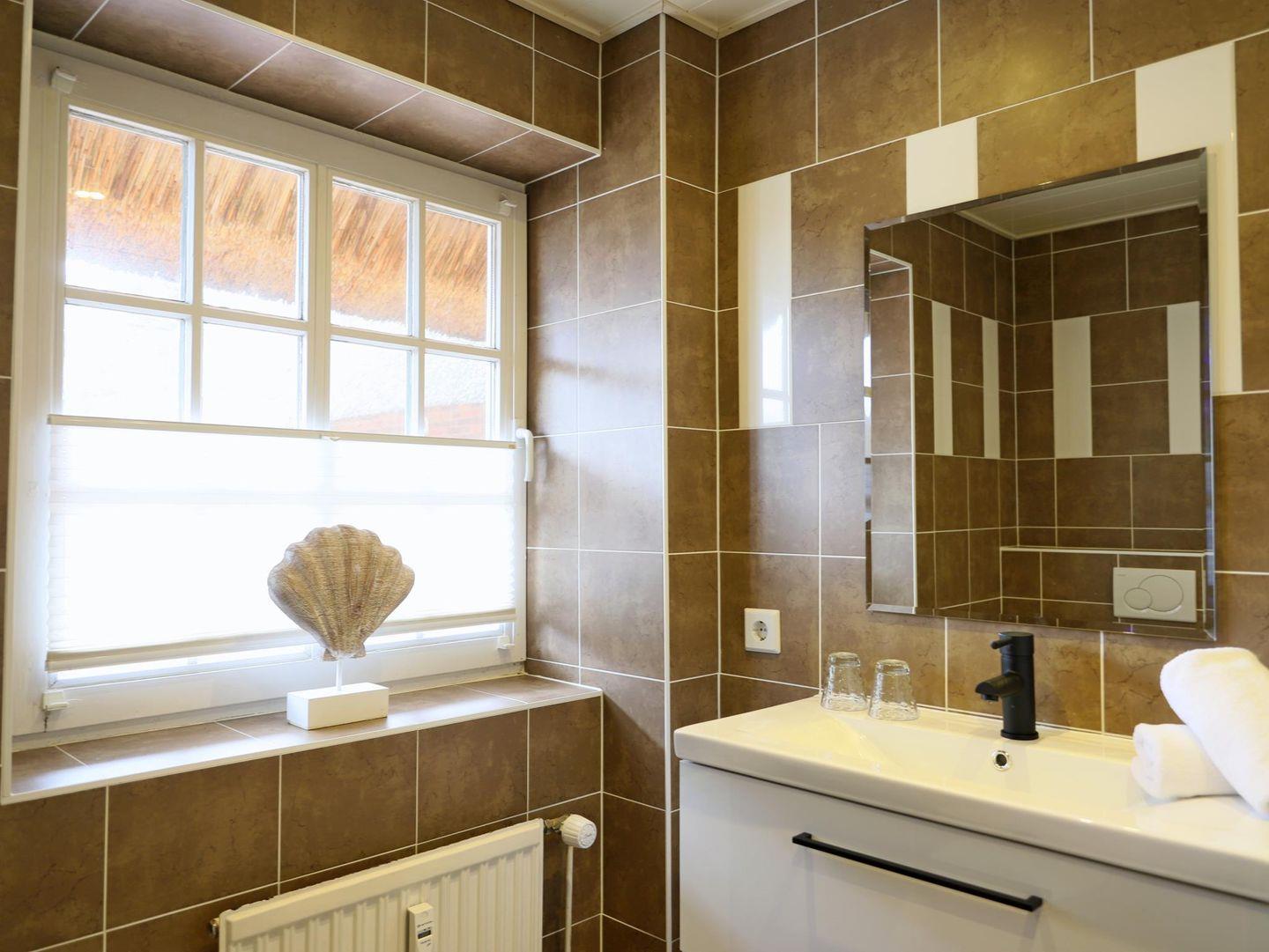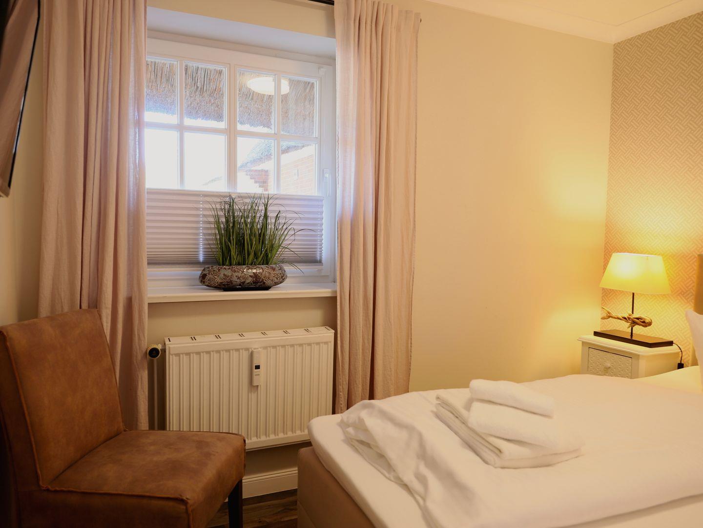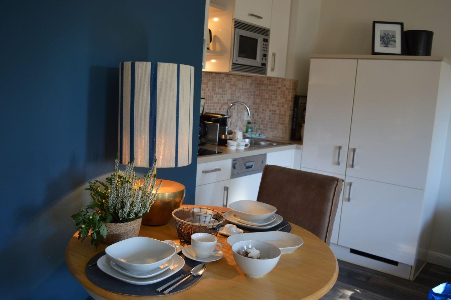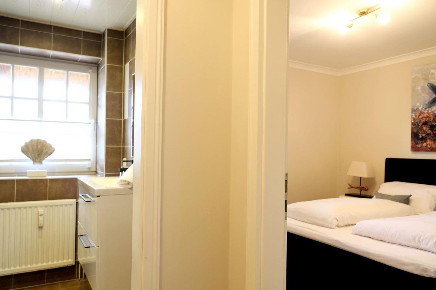 Diese geschmackvoll eingerichtete 45 m² große 2-Zimmer-Wohnung im Erdgeschoss eines typisch sylter Reetdachhauses bietet Platz für bis zu 3 Personen. Das helle Wohn- und Esszimmer mit moderner Küchenzeile lädt zu gemütlichen Stunden ein. Es verfügt über ein Schlafsofa (140 x 190 cm) und ist der ideale Ort, um nach einem langen Tag zu entspannen.
