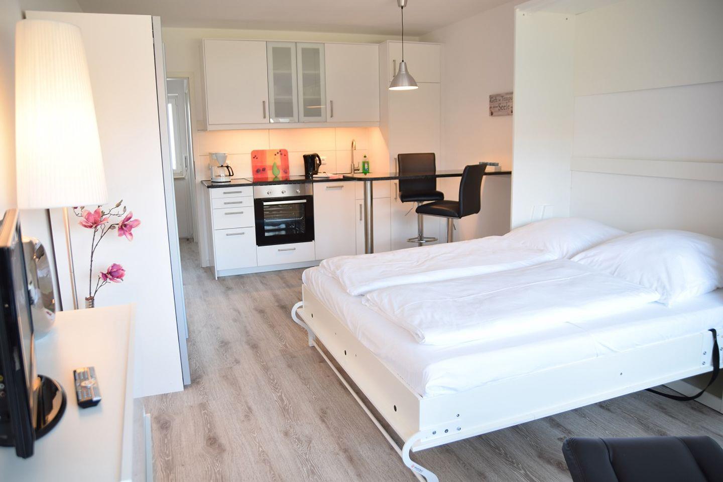 Dieses helle, neu renovierte 1-Zimmer-Appartement bietet auf 36 m² ein gemütliches Zuhause für bis zu 2 Personen. Der Wohn-/Schlafbereich ist liebevoll eingerichtet und verfügt über eine komfortable Sitzecke mit zwei Dreh-Kippsesseln. Das Schrankbett (160 x 200 cm) lässt sich tagsüber platzsparend hochklappen und bietet auch im geöffneten Zustand ausreichend Platz. Die offene Küche ist gut ausgestattet und lädt zum Kochen ein. Das moderne Bad mit Dusche und WC verfügt über ein Fenster. Genießen Sie den großzügigen Südbalkon mit Gartentisch und Stühlen – ideal für entspannte Stunden. Ein kostenfreier Stellplatz ist vorhanden. Im Keller stehen Ihnen eine Waschmaschine und ein Trockner mit Münzzähler zur Verfügung. Die zentrale Lage bietet fußläufigen Zugang zu Bäckereien und Supermärkten. Haustiere sind herzlich willkommen!