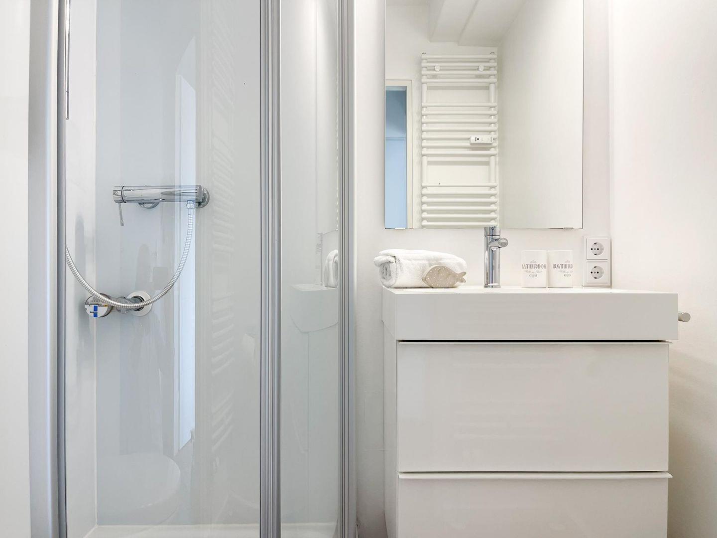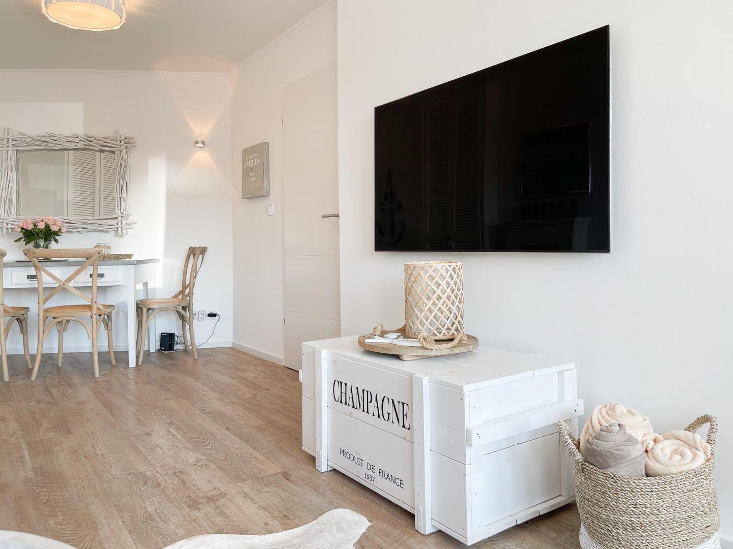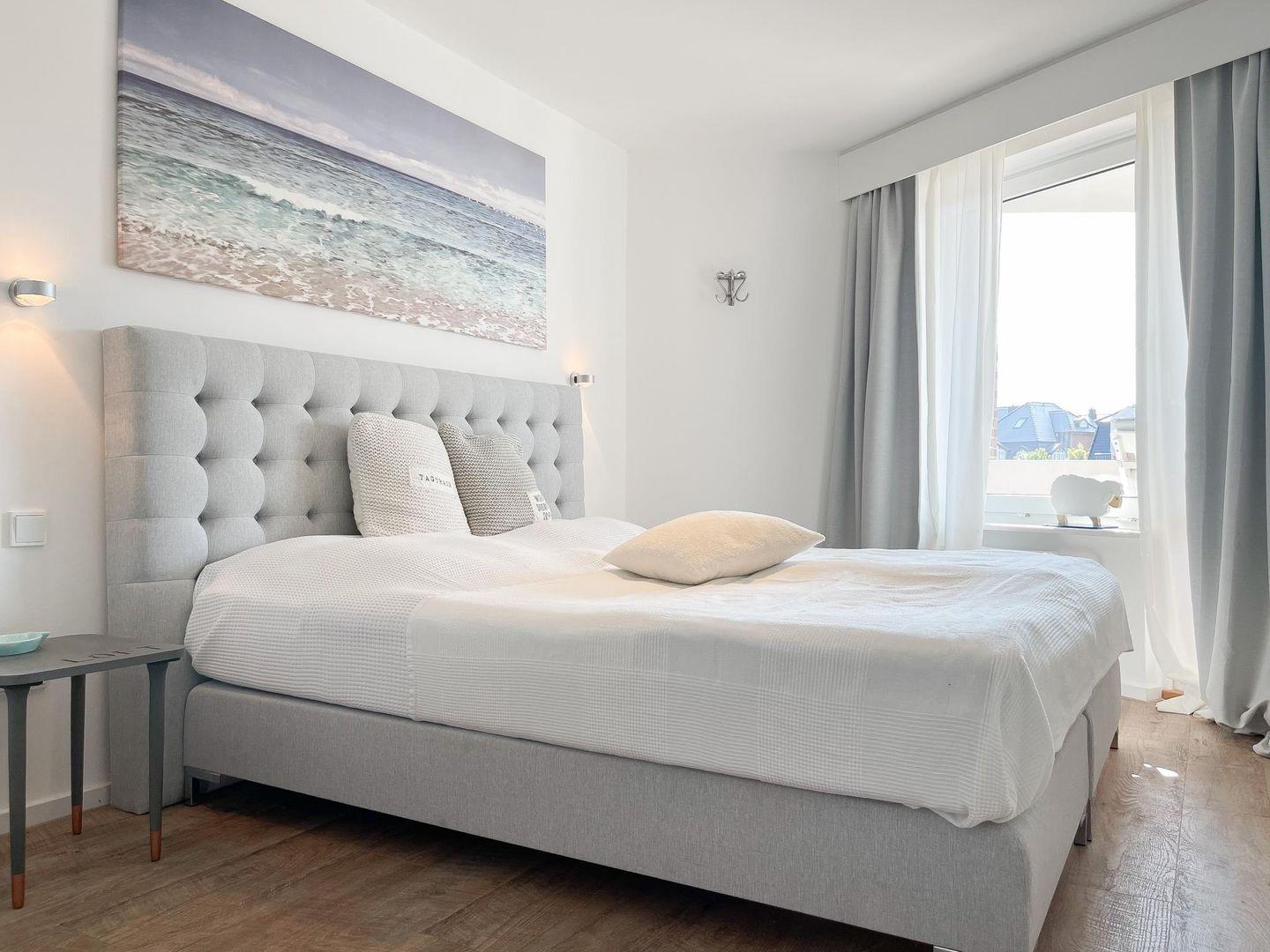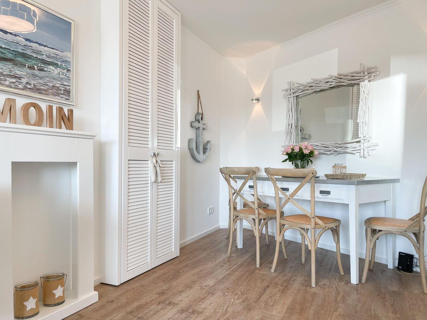 Diese exklusive, renovierte Wohnung (ca. 51 m²) in Westerland bietet einen stilvollen Rückzugsort für bis zu 3 Personen. Sie befindet sich im Hochparterre einer gepflegten, ruhig gelegenen Wohnanlage, nur 350 Meter vom Strand entfernt. Die geschmackvolle Einrichtung mit viel Liebe zum Detail sorgt für eine angenehme Atmosphäre. Das Wohn-/Esszimmer ist mit einem Schlafsofa (160 x 190 cm), TV, Bluetooth-Lautsprecher und WLAN ausgestattet. Der gemütliche Essbereich bietet Platz für 4 Personen. Der große Westbalkon lädt zum Entspannen ein und ermöglicht den Genuss des nahegelegenen Meeresrauschens. Die neue Einbauküche verfügt über eine Spülmaschine und Mikrowelle. Das separate Schlafzimmer ist mit einem Boxspringbett (180 x 200 cm), einem Einbauschrank und TV ausgestattet. Das moderne Duschbad rundet das Angebot ab. Zur gemeinschaftlichen Nutzung stehen eine Waschmaschine und ein Trockner (Münzgeräte) im Keller zur Verfügung. Eine Parkgarage gehört zur Wohnung, Maße: Höhe 2m, Breite 2,4m, Länge 5,7m.