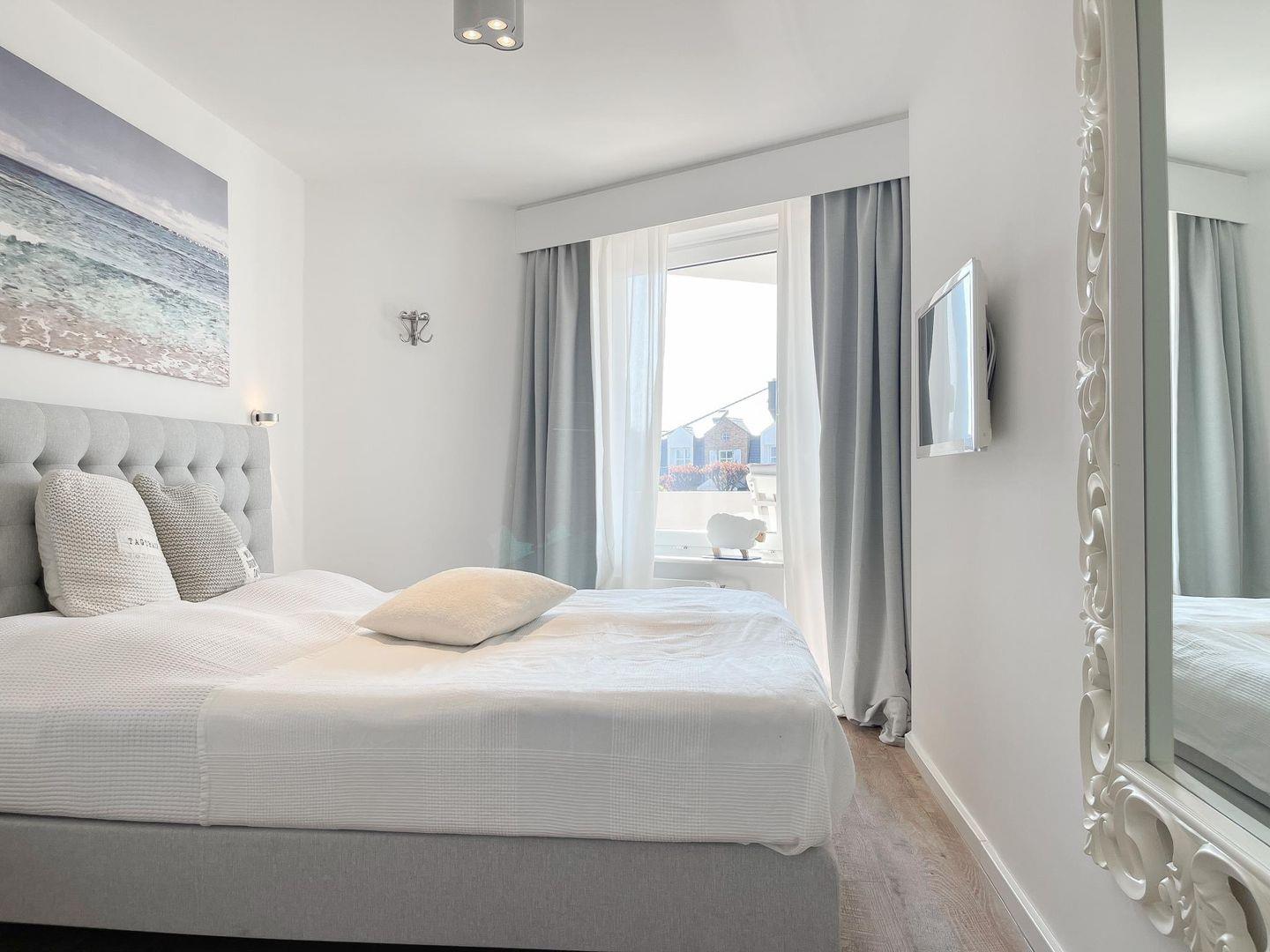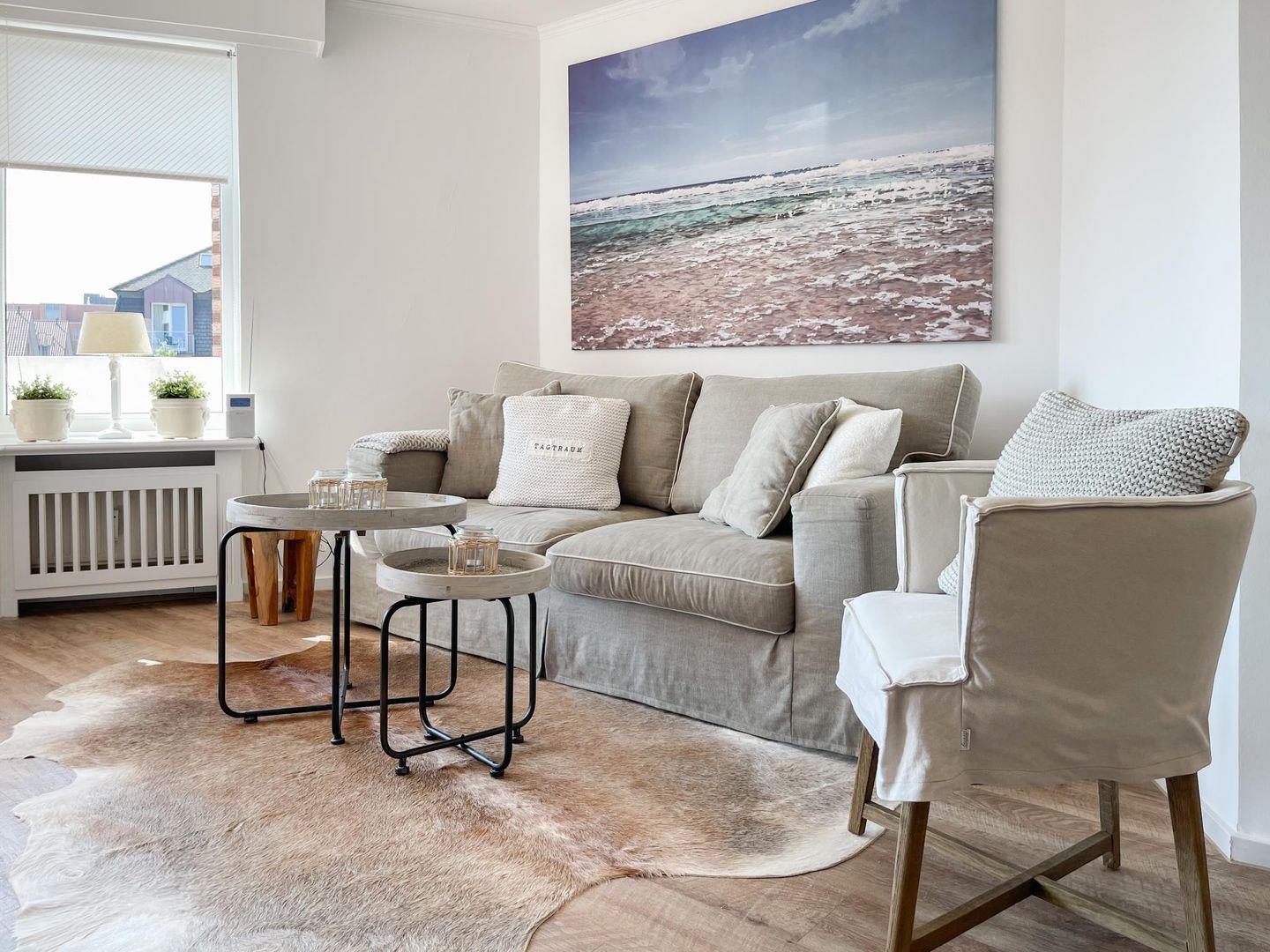 Stilvolle Wohnung (ca. 51 m²) in Westerland für bis zu 3 Personen. 1 Schlafzimmer, 1 Badezimmer, Schlafsofa im Wohnzimmer. Westbalkon, Parkgarage (Höhe 2m, Breite 2,4m, Länge 5,7m). WLAN, Waschmaschine und Trockner zur gemeinschaftlichen Nutzung. Haustiere sind nicht gestattet.