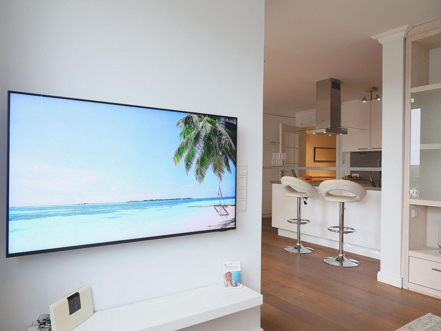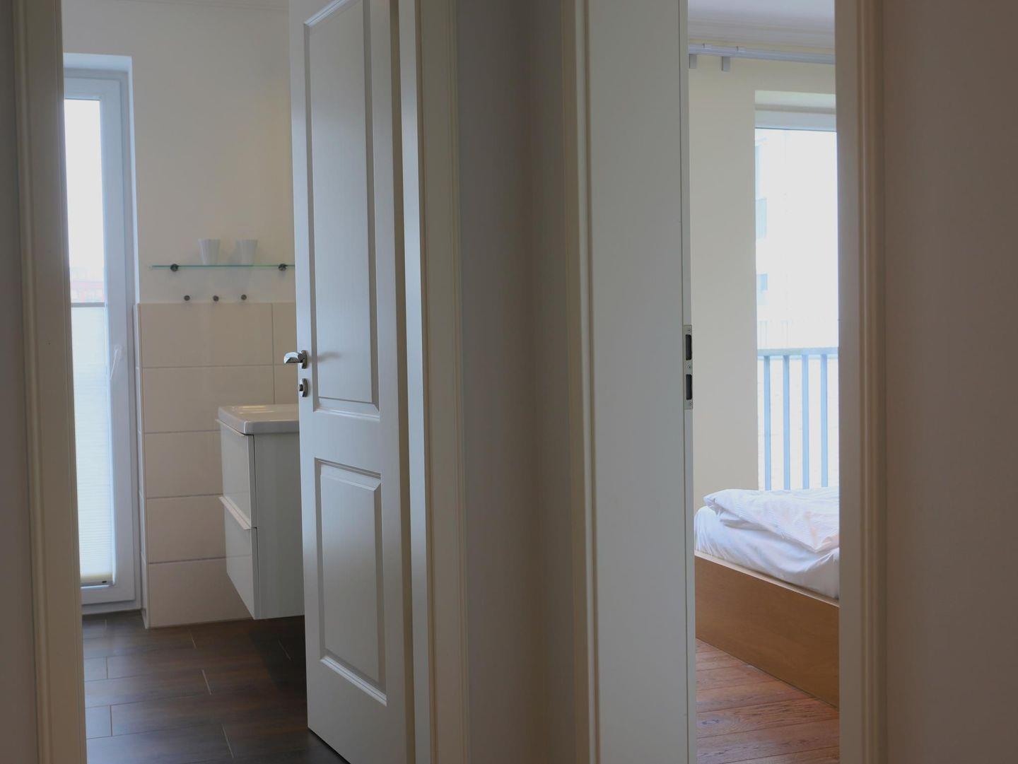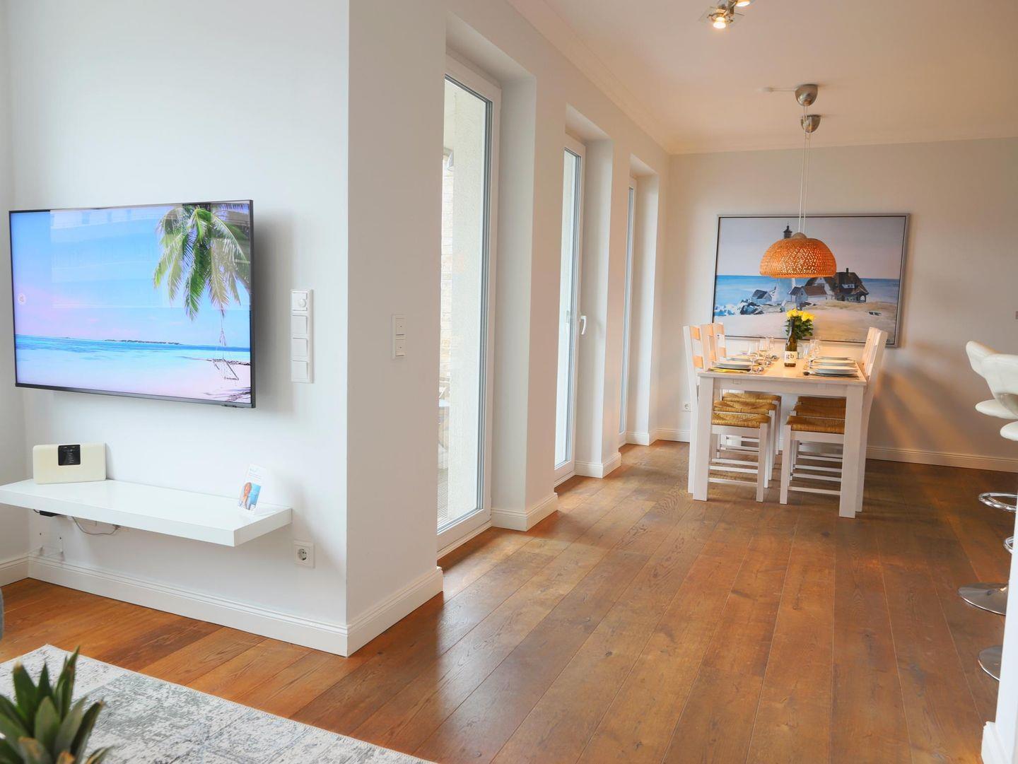 Helle, barrierefreie Neubau-Wohnung (83 m²) im 2. Stock mit West-Balkon, 2 Schlafzimmern, 2 Bädern und voll ausgestatteter Küche. In nächster Strandlage, nahe Fußgängerzonen. Mit kostenfreiem WLAN, TV, Musikanlage, Waschmaschine und Trockner. Haustiere auf Anfrage, Nichtraucherwohnung. Tiefgaragenstellplatz (max. Fahrzeuglänge: 5,0 m, Breite: 1,9 m, Höhe: 1,5 m) auf eigene Verantwortung.