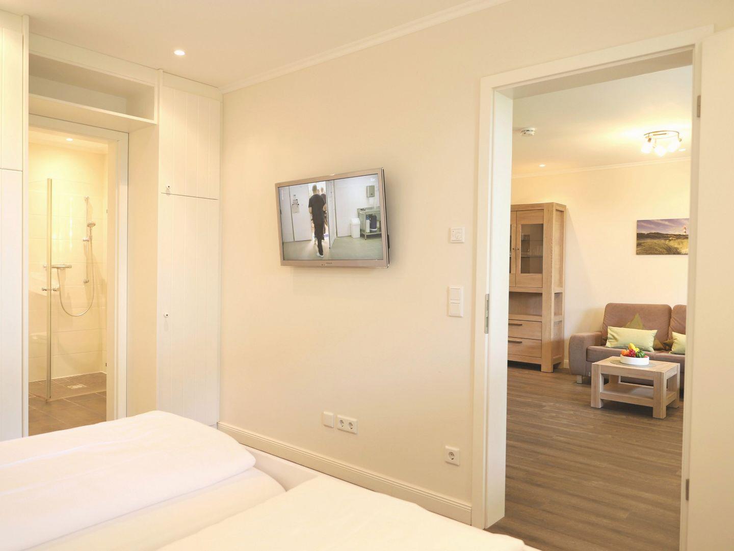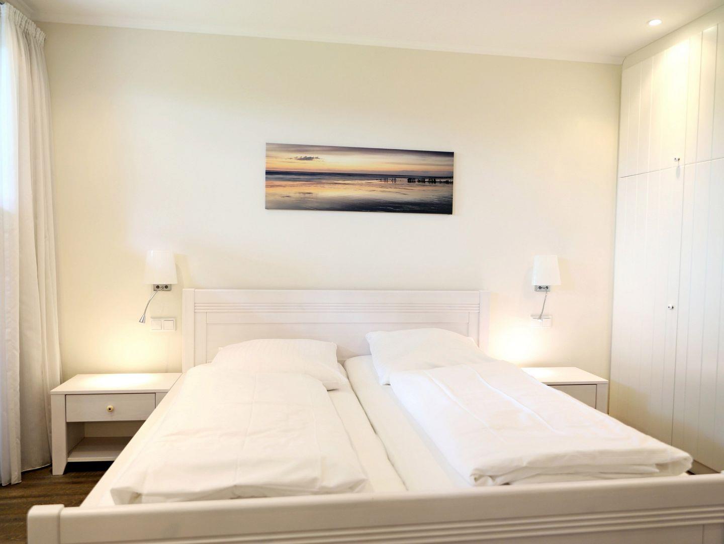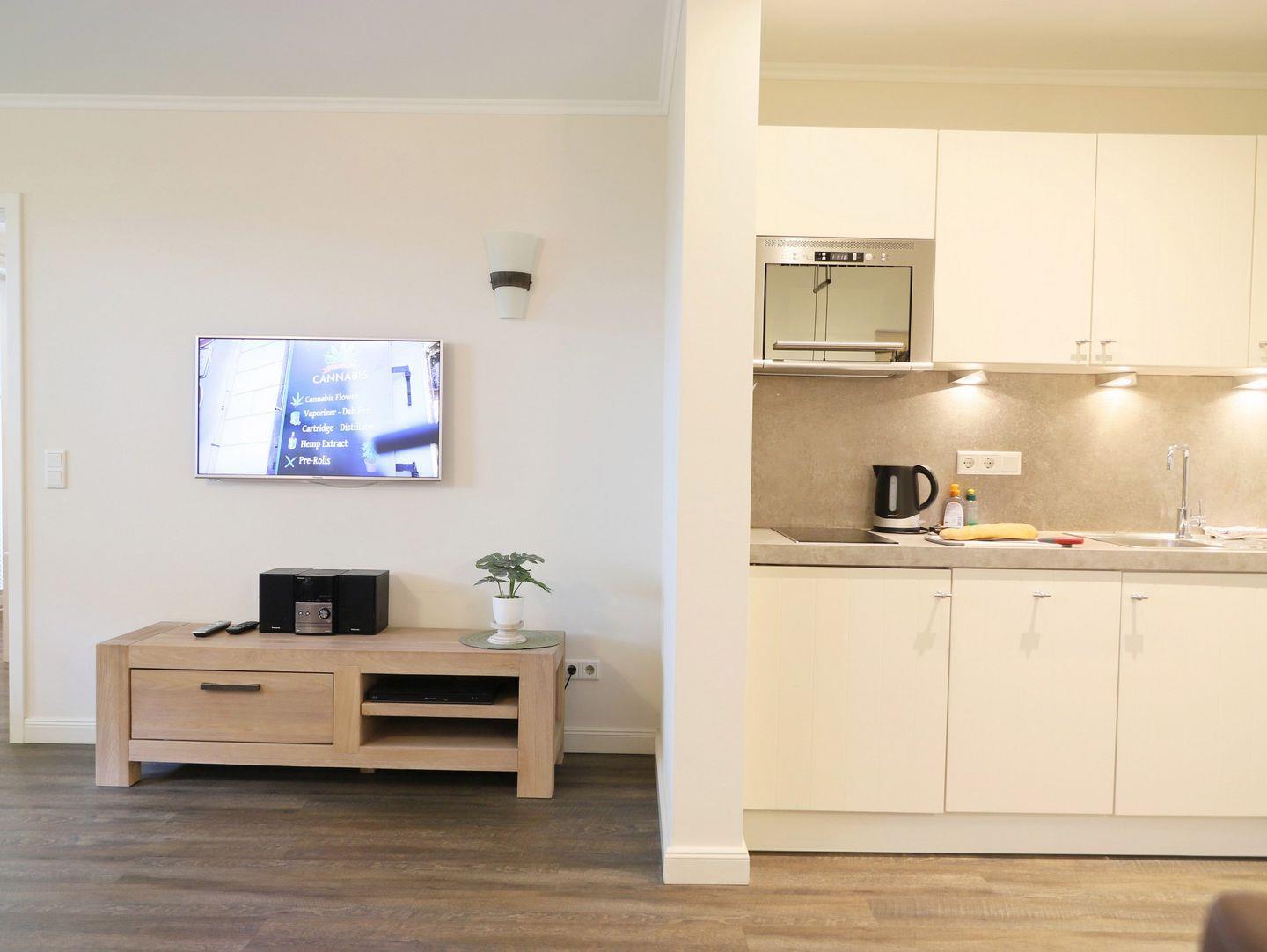 Diese modern eingerichtete 2-Zimmer-Nichtraucherwohnung befindet sich im Erdgeschoss und bietet ca. 68 m² Wohnfläche. Der Wohnbereich ist offen gestaltet und mit einer Küche inklusive Geschirrspüler ausgestattet. Das Schlafzimmer mit Doppelbett (180 x 200 cm) und Kabel-TV hat direkten Zugang zur großen Westterrasse. Ein Badezimmer mit bodenebener Dusche und ein separates Gäste-WC sorgen für zusätzlichen Komfort. Die ruhige Lage ist nur wenige Gehminuten von der Innenstadt und dem Strand entfernt. Ein Garagenstellplatz sowie Münz-Waschmöglichkeiten im Keller sind vorhanden. WLAN inklusive, Kinder und Haustiere sind nicht erwünscht.