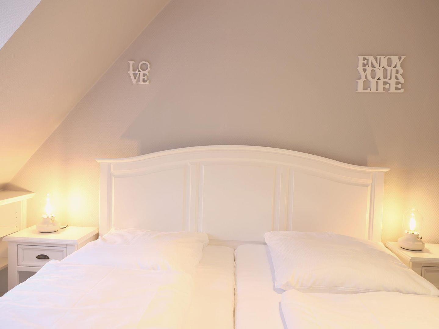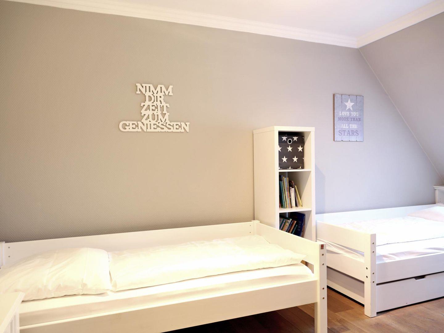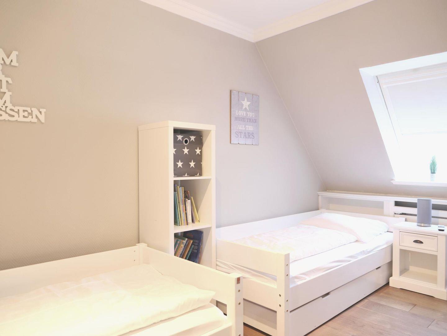 70 m² große 3-Zimmer-Wohnung im 2. Obergeschoss für bis zu 5 Personen. 1 Schlafzimmer mit Doppelbett (180 x 200 cm), 1 Schlafzimmer mit 2 Einzelbetten (90 x 200 cm) und einem weiteren Bett (80 x 200 cm). Balkon, Waschmaschine und Trockner im Haus. Haustiere willkommen.