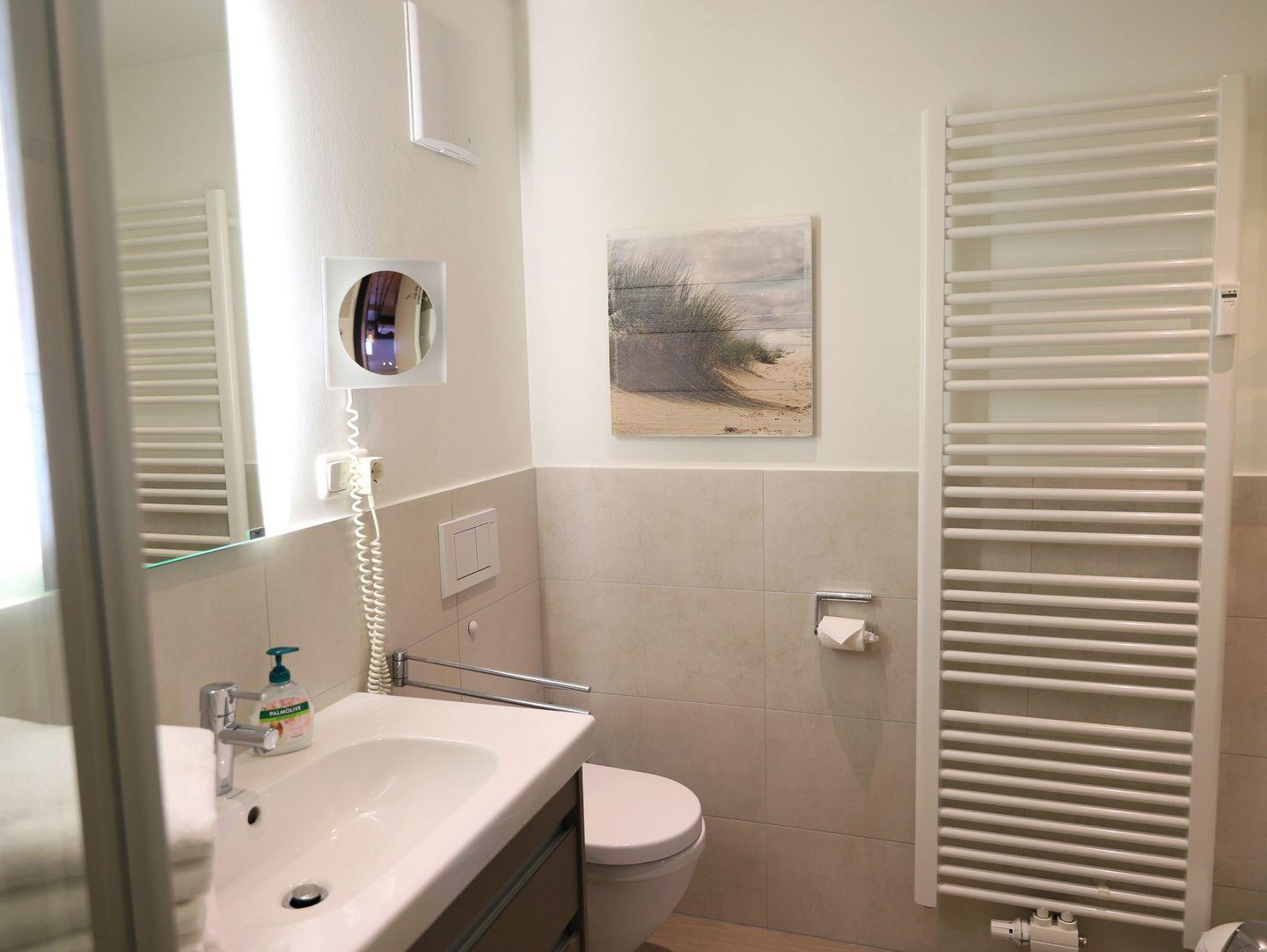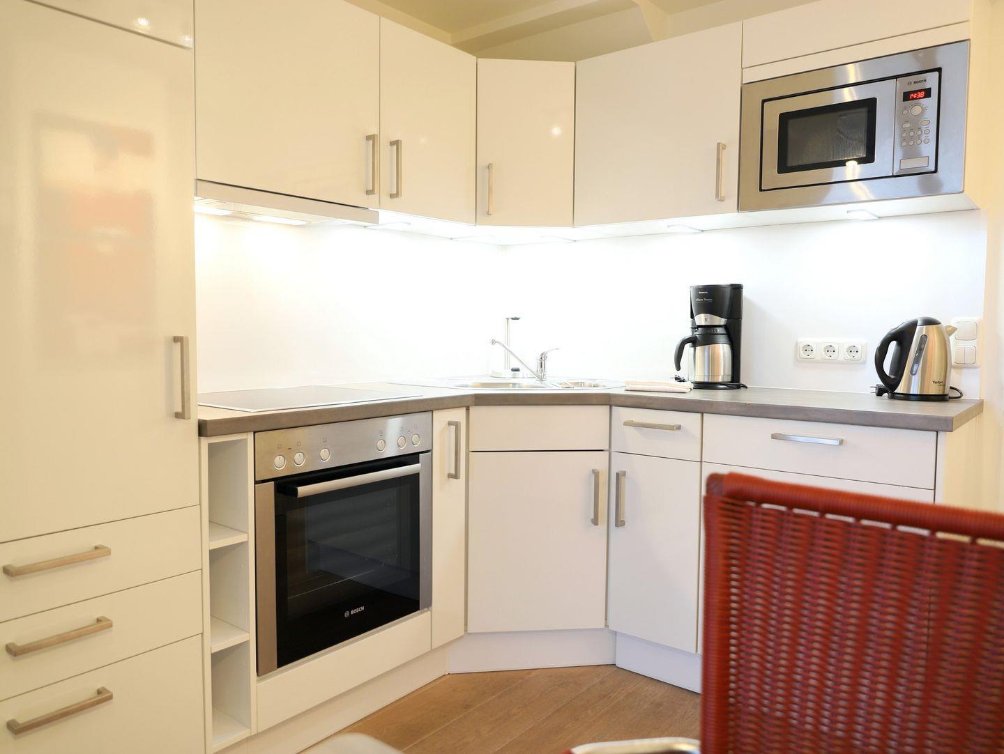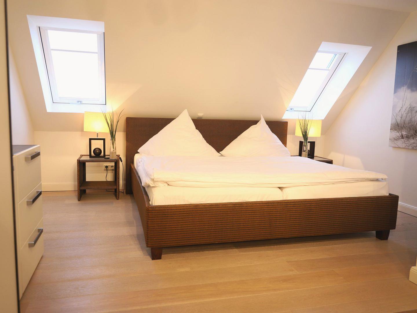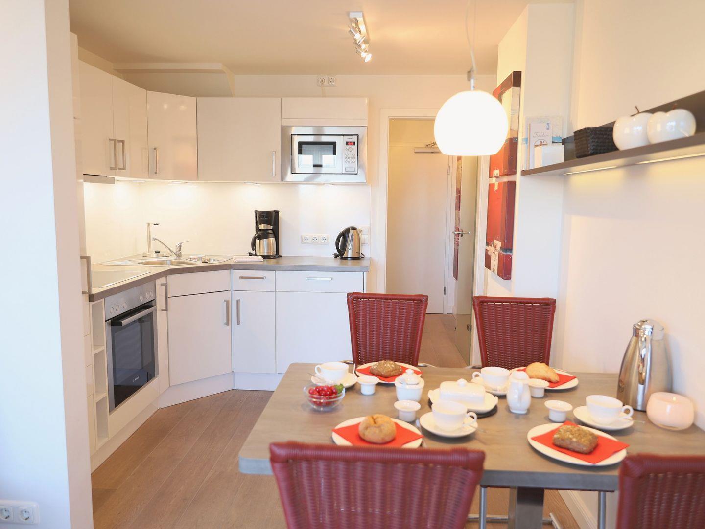 Diese moderne 2-Zimmer-Wohnung im 2. Obergeschoss bietet auf 60 m² Platz für bis zu 4 Personen. Der lichtdurchflutete Wohnbereich verfügt über eine Schlafcouch (160 x 190 cm), Kabel-TV mit DVD-Player sowie ein Bose Radio/CD-Player mit Connect-Kit für iPhone und iPod. Die offene Einbauküche ist mit Glaskeramik-Kochfeld, Backofen, Mikrowelle, Geschirrspüler und einer Nespresso-Maschine ausgestattet. Das Schlafzimmer bietet ein komfortables Doppelbett (200 x 200 cm) und Kabel-TV. Im modernen Badezimmer sorgen Fußbodenheizung, eine bodengleiche Dusche und ein beleuchteter Spiegel für Komfort. Der 12 m² große Ost-Balkon lädt mit einem Strandkorb und Terrassenmöbeln zum Entspannen ein. Ein Tiefgaragenstellplatz (Durchfahrtshöhe 2,0 m) und ein Fahrstuhl sind vorhanden. Gemeinschaftliche Münzwaschmaschine und Trockner befinden sich im Untergeschoss. Strand und Zentrum sind fußläufig erreichbar. Raucher werden gebeten, ausschließlich auf dem Balkon zu rauchen. Haustiere sind nicht gestattet.