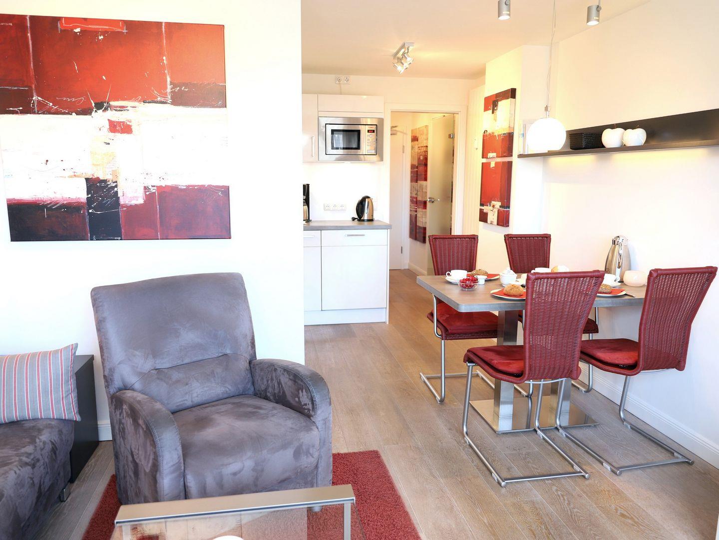 Hochwertige 2-Zimmer-Wohnung (60 m²) für bis zu 4 Personen in Westerland. Mit Ost-Balkon, Tiefgaragenplatz, Fahrstuhl, WLAN und moderner Ausstattung. Nur 600 m zum Strand, Haustiere nicht erlaubt.