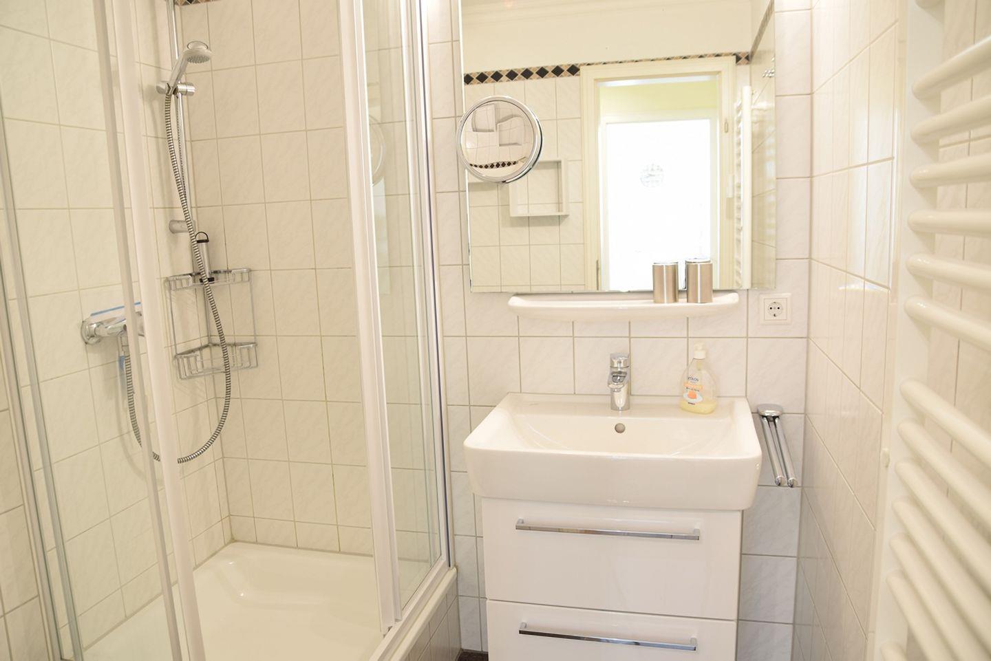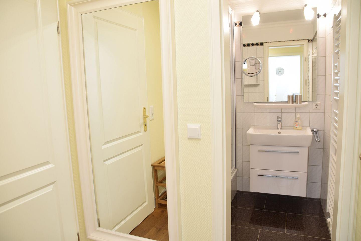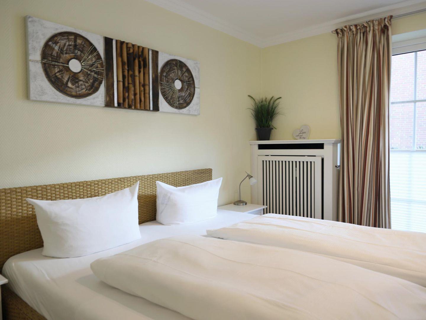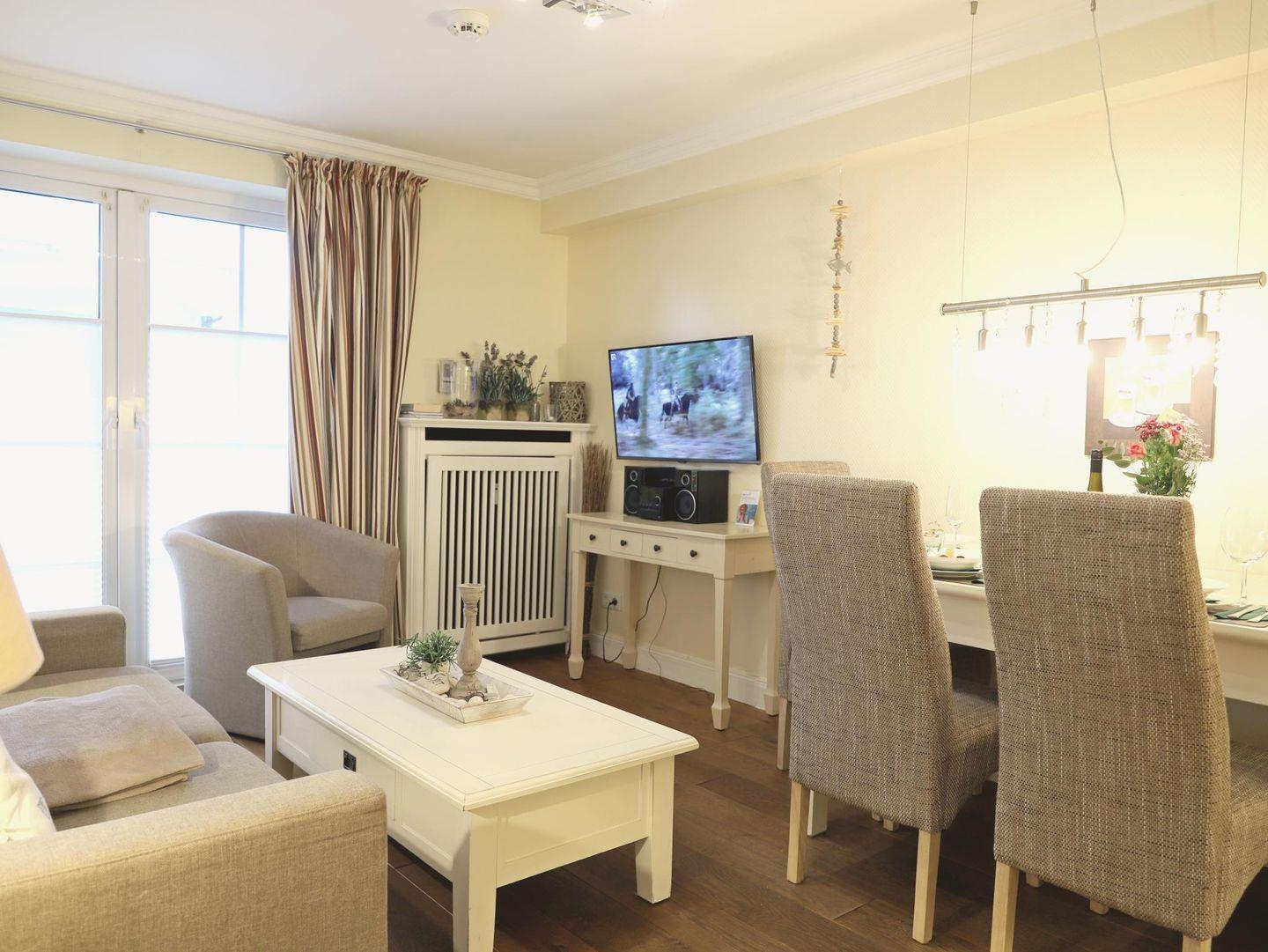 Diese komfortable 2-Zimmer-Erdgeschosswohnung bietet auf 45 m² Platz für bis zu 4 Personen. Das Wohnzimmer ist mit einem gemütlichen Schlafsofa (160 x 200 cm), Flatscreen-TV und Stereoanlage ausgestattet. Die moderne Küchenzeile verfügt über ein 4-Platten-Cerankochfeld, Mikrowelle, Geschirrspüler, Kühlschrank und Kaffeemaschine. Das separate Schlafzimmer bietet ein Doppelbett (180 x 200 cm) und ebenfalls einen Flatscreen-TV. Das Badezimmer überzeugt mit einer Dusche und WC. Genießen Sie entspannte Stunden auf der sonnigen Süd-Terrasse mit Gartentisch, Stühlen und eigenem Strandkorb. Im Gemeinschaftskeller stehen Ihnen eine Sauna (gegen Münzeinwurf) sowie Waschmaschine und Trockner zur Verfügung. Ein kostenfreier Stellplatz befindet sich direkt auf dem Grundstück. Fahrradständer sind vorhanden (ohne Platzgarantie). Haustiere sind nicht erlaubt.