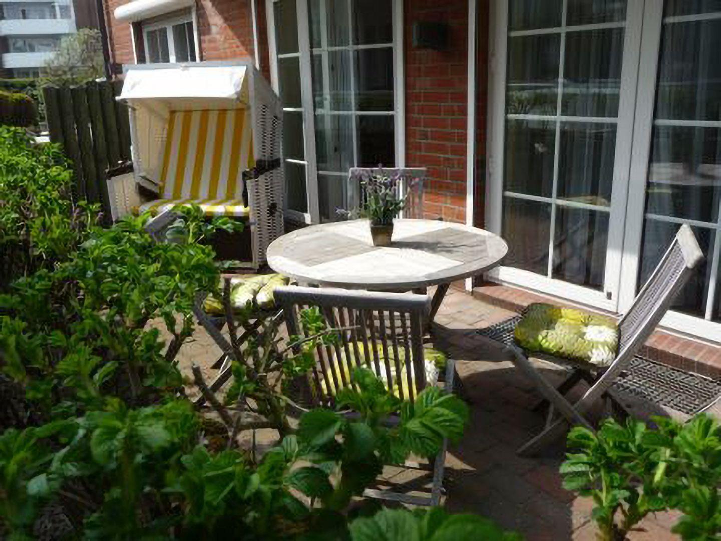 Hochwertige 45 m² Erdgeschosswohnung für 4 Personen in Westerland. Süd-Terrasse mit Strandkorb, Sauna, Waschmöglichkeiten, kostenfreier Parkplatz. Keine Haustiere.