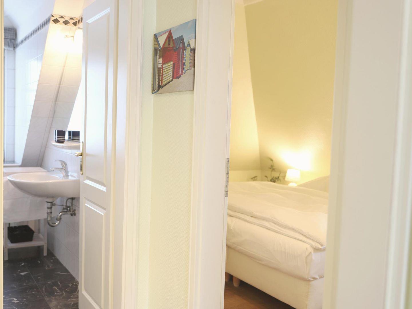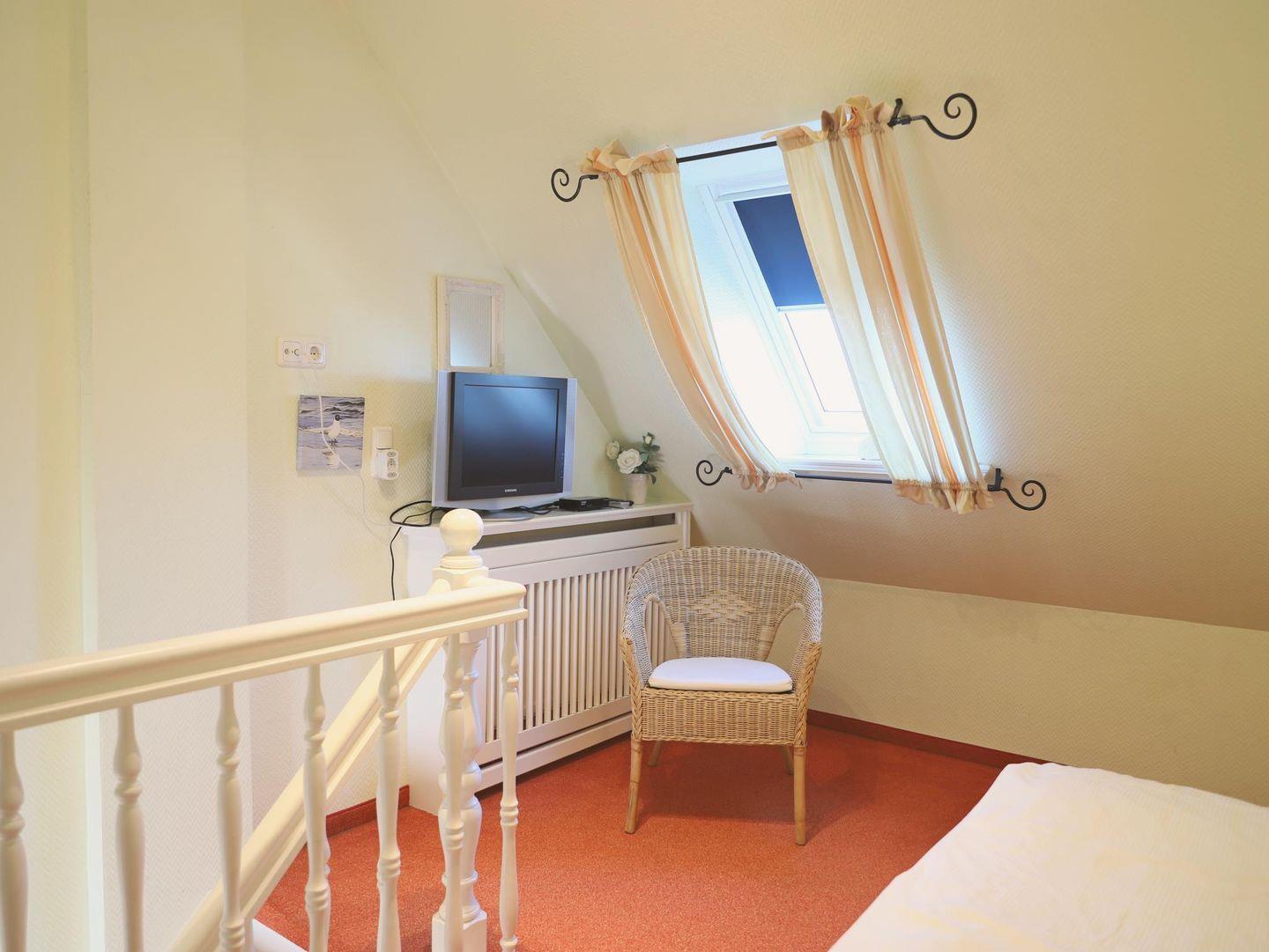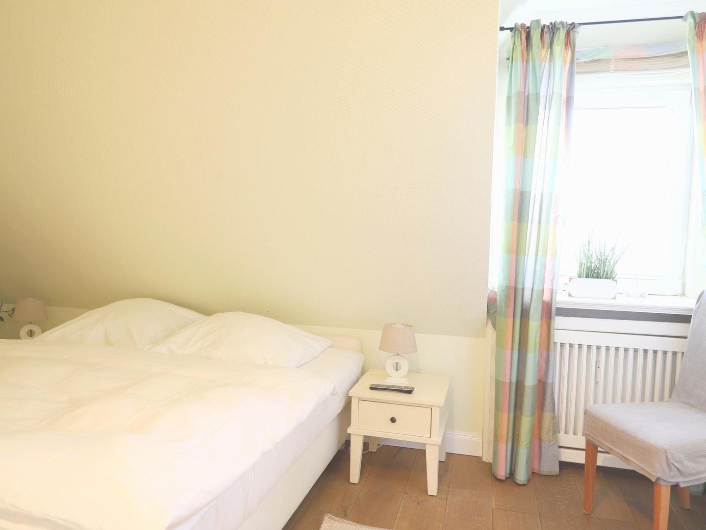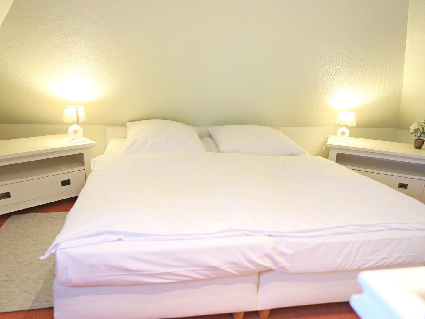 Das Schlafzimmer 1 bietet ein Doppelbett (180 x 200 cm) und einen Flatscreen-TV. Das zweite Schlafzimmer im Spitzboden verfügt ebenfalls über ein Doppelbett (180 x 200 cm) und einen Flatscreen-TV. Das Badezimmer ist mit einer Dusche und WC ausgestattet. Genießen Sie den kleinen Süd-Balkon oder entspannen Sie im schön angelegten Gemeinschaftsgarten mit Strandkörben. Ein kostenfreier Stellplatz ist auf dem Grundstück verfügbar, ebenso ein Fahrradständer. Im Untergeschoss können die Sauna (mit Münzautomat), Waschmaschine und Trockner im Münzbetrieb genutzt werden. Haustiere sind willkommen.