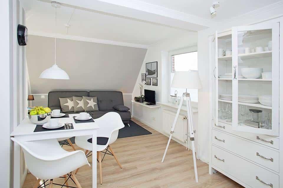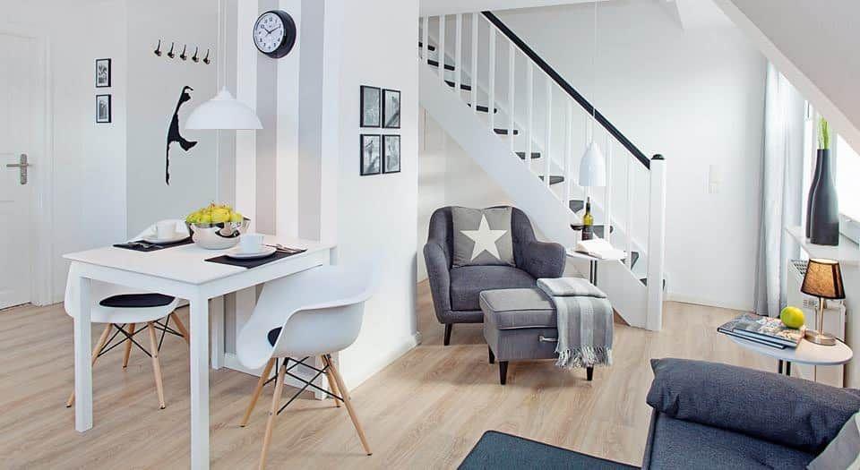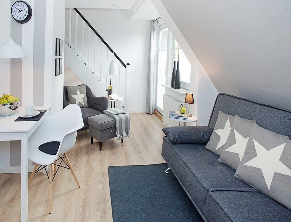 Auf etwa 45 m² bietet die Wohnung Platz für bis zu drei Personen. Der Wohnbereich ist offen und lichtdurchflutet gestaltet. Sofa und Essplatz bilden einen stimmigen Mittelpunkt für gemeinsame Zeit – ruhig, entspannt und mit einer Atmosphäre, die sofort ankommen lässt.