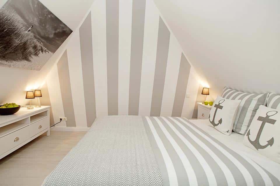 Über eine Holztreppe gelangt man in das separate Schlafzimmer mit Doppelbett und großzügigen Einbauschränken. Ein ruhiger Rückzugsort, der Raum für erholsame Nächte bietet.
