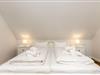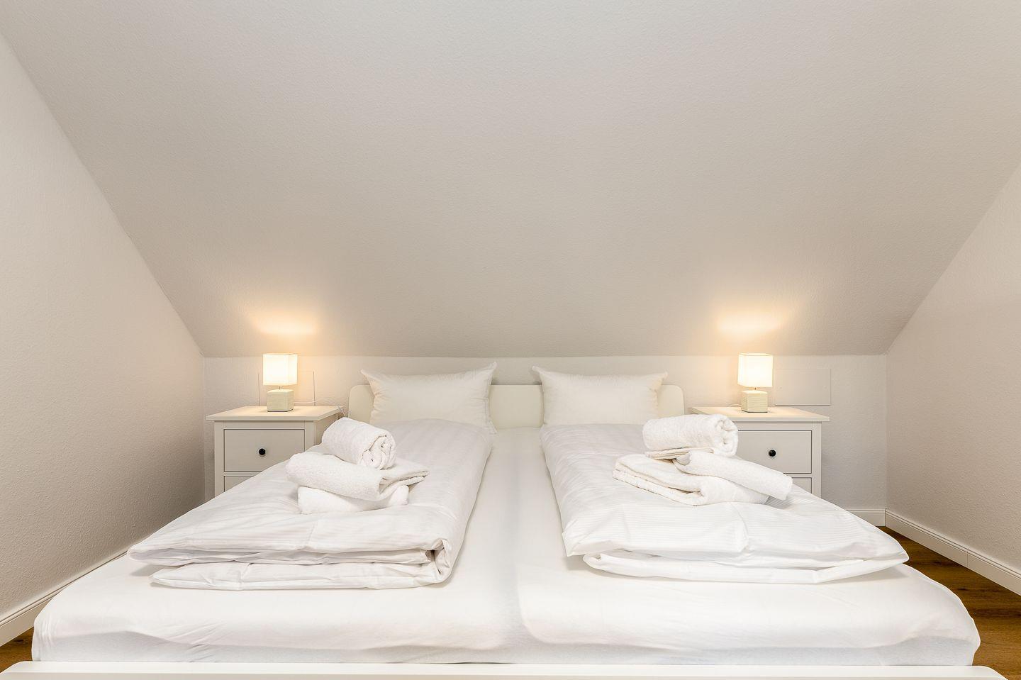 Im Wohnbereich ist allerdings noch viel Luft nach oben, denn über die Treppe geht es direkt ins ganz in Weiß gehaltene Schlafzimmer. Dort wartet ein gemütliches Doppelbett auf seine nächtlichen Besucher. Ein Einzelbett kann auf Anfrage für kleine Kinder hergerichtet werden.