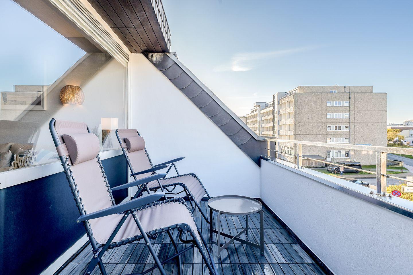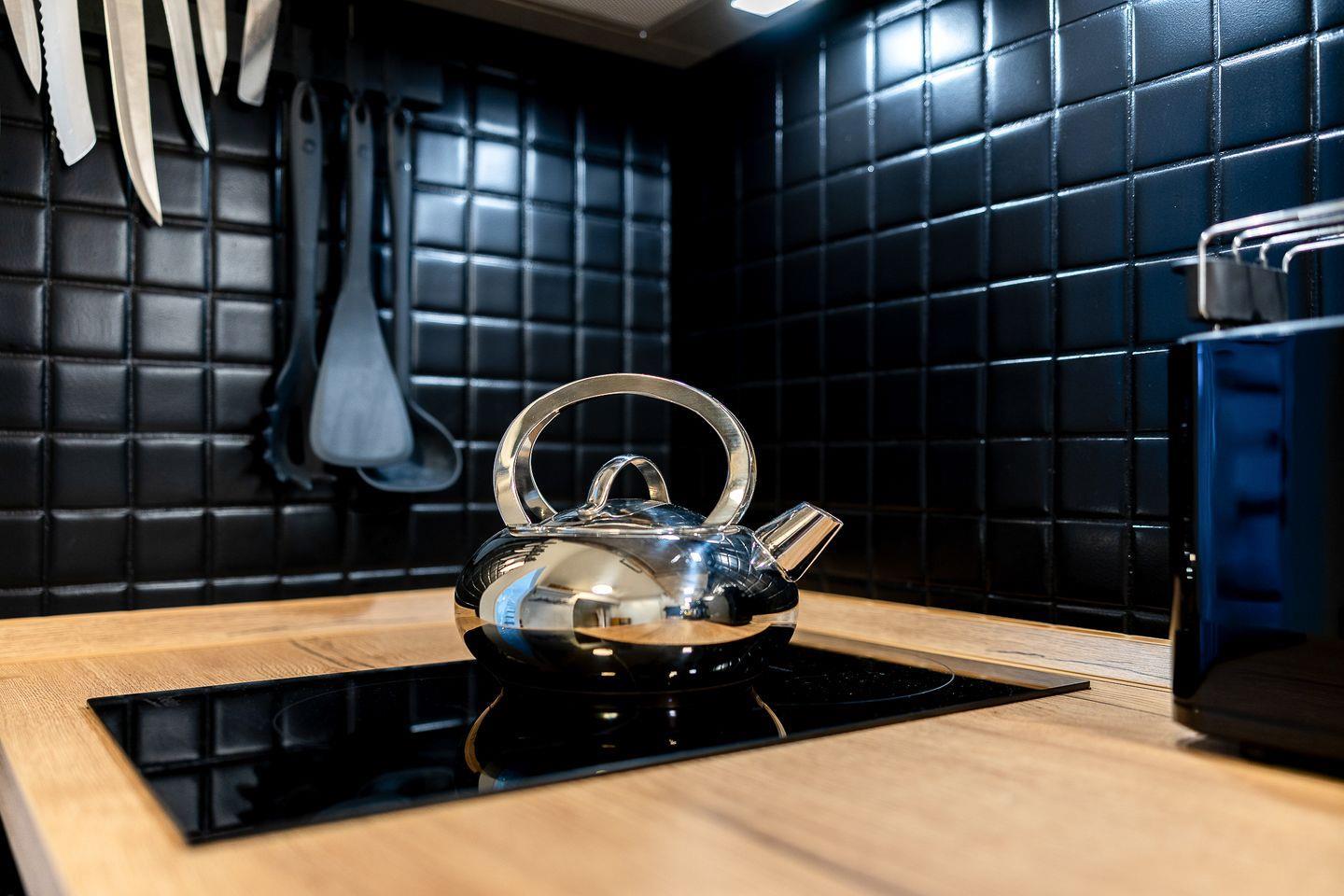 Schön, wenn sich alles so gut zusammenfügt. Im Fall des Appartements Jonathan ist es der großzügige und offene Wohnbereich in dem sich eine chillige Couch, ein Esstisch sowie die Küche versammelt haben. Letztere fällt nicht nur durch ihre gute Ausstattung sondern auch durch die coolen schwarzen Fliesen auf, die perfekt mit der Arbeitsplatte aus Holz und den weißen Schränken harmonieren. Nicht zu vergessen, der Westbalkon nebst Tisch und Stühlen und toller Aussicht sowie das geräumige Duschbad.