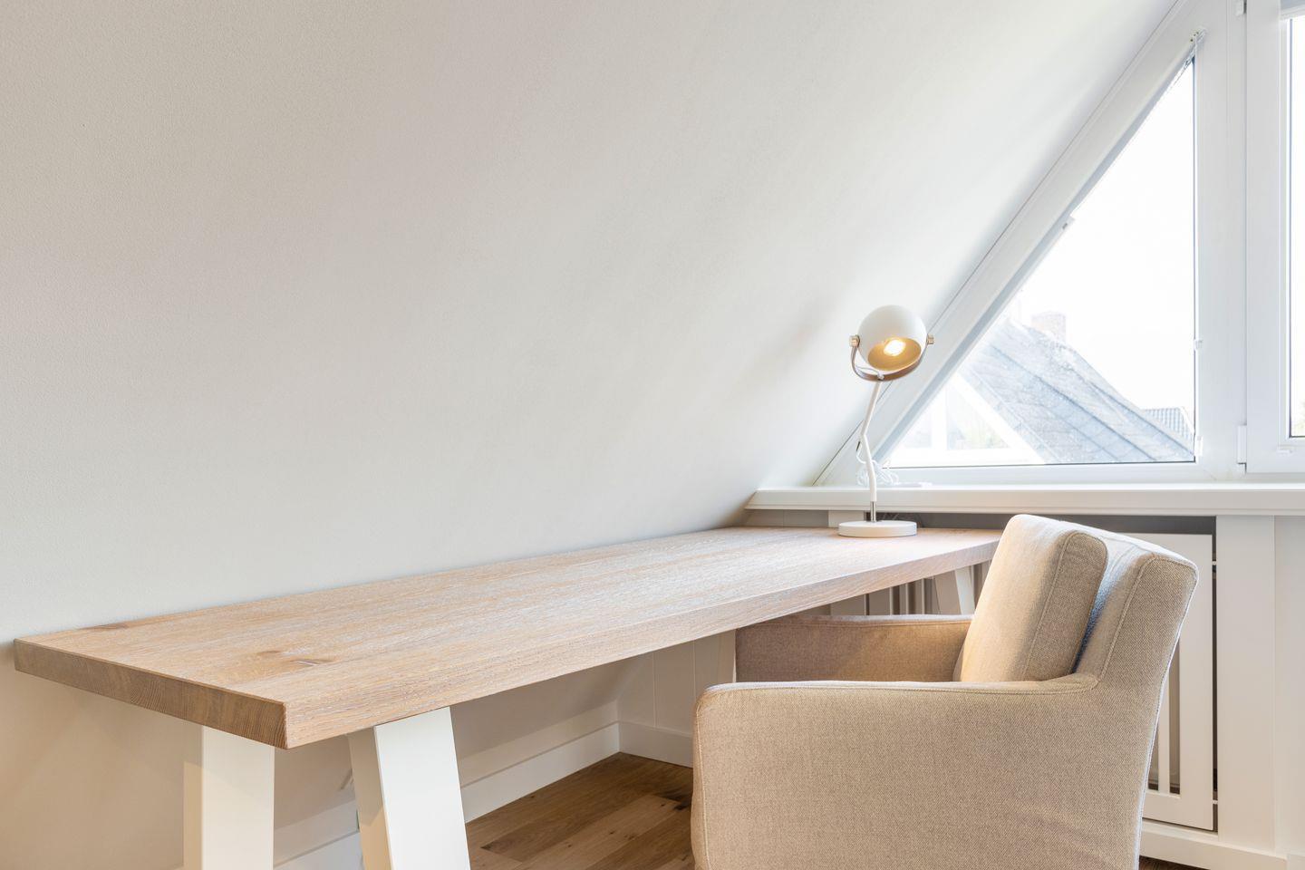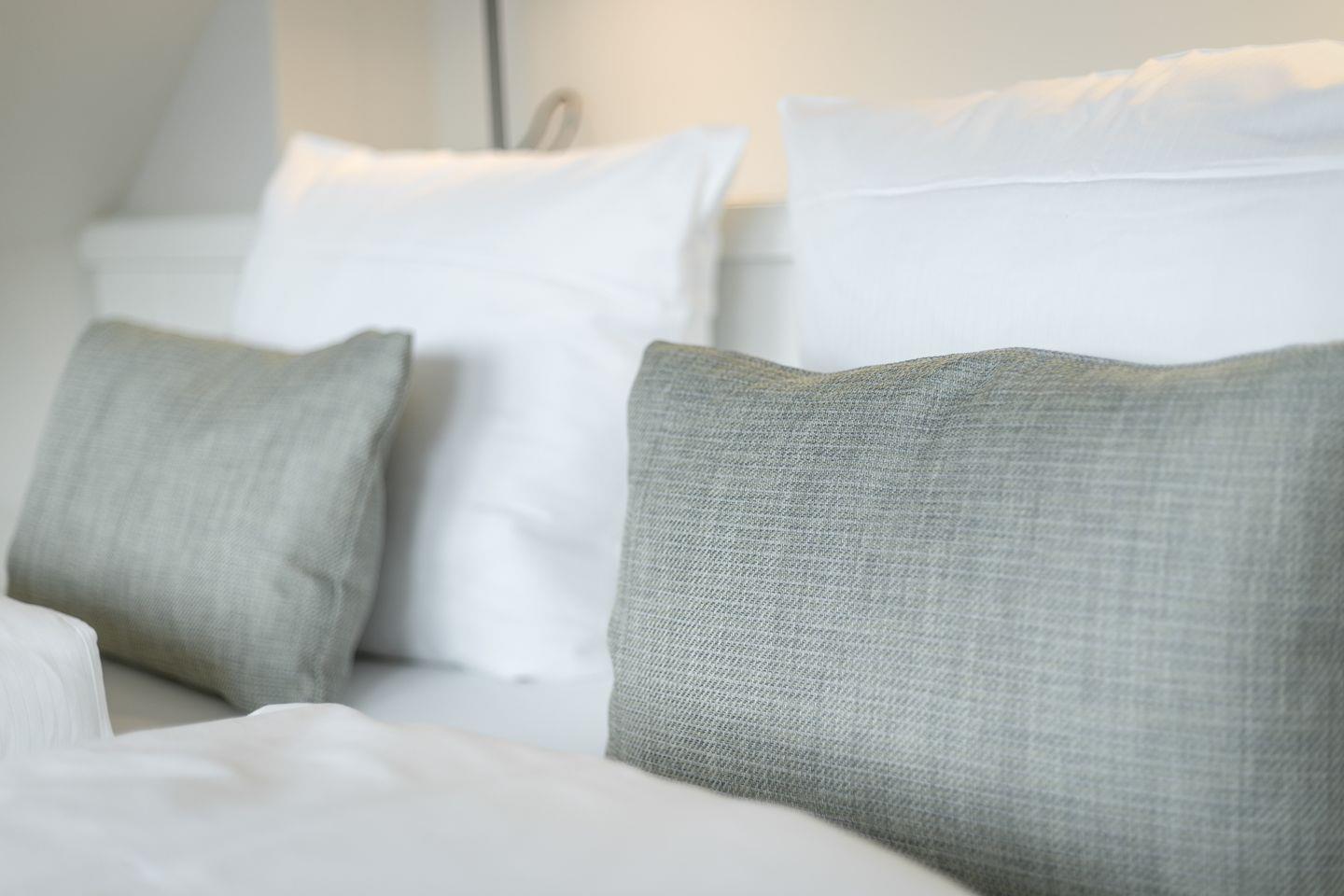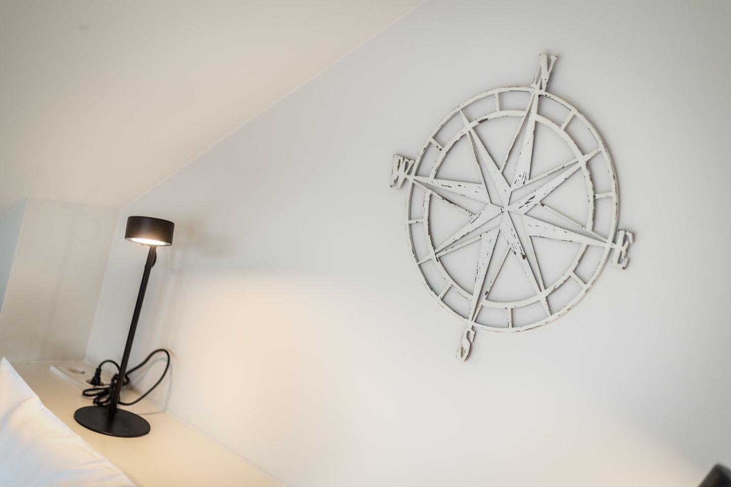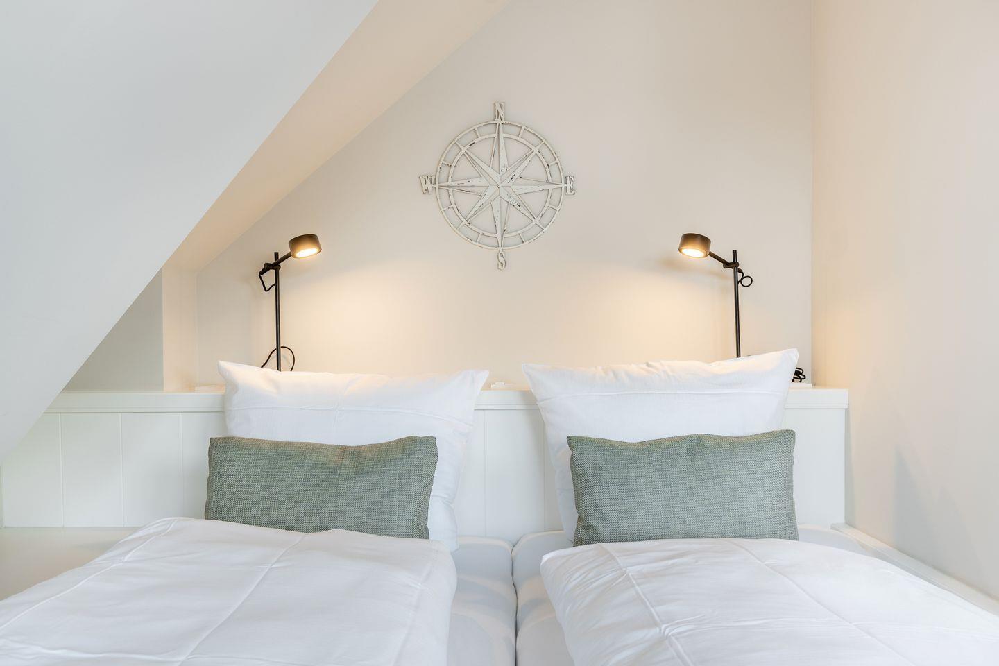 Ebenfalls im Obergeschoss befindet sich auch eins der insgesamt zwei Schlafzimmer mit komfortablen Polsterbett sowie hochwertigen Einbauschränken für die Urlaubsgarderobe. Gleich nebenan dann das ganz in Weiß gehaltene Duschbad für den perfekten Start in den Tag.