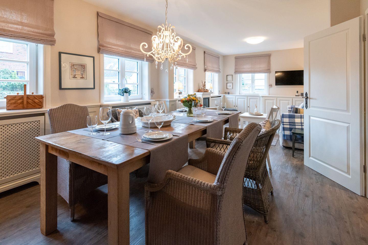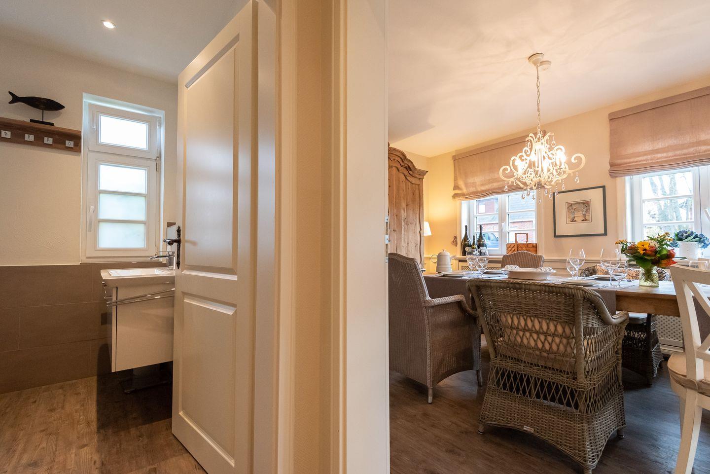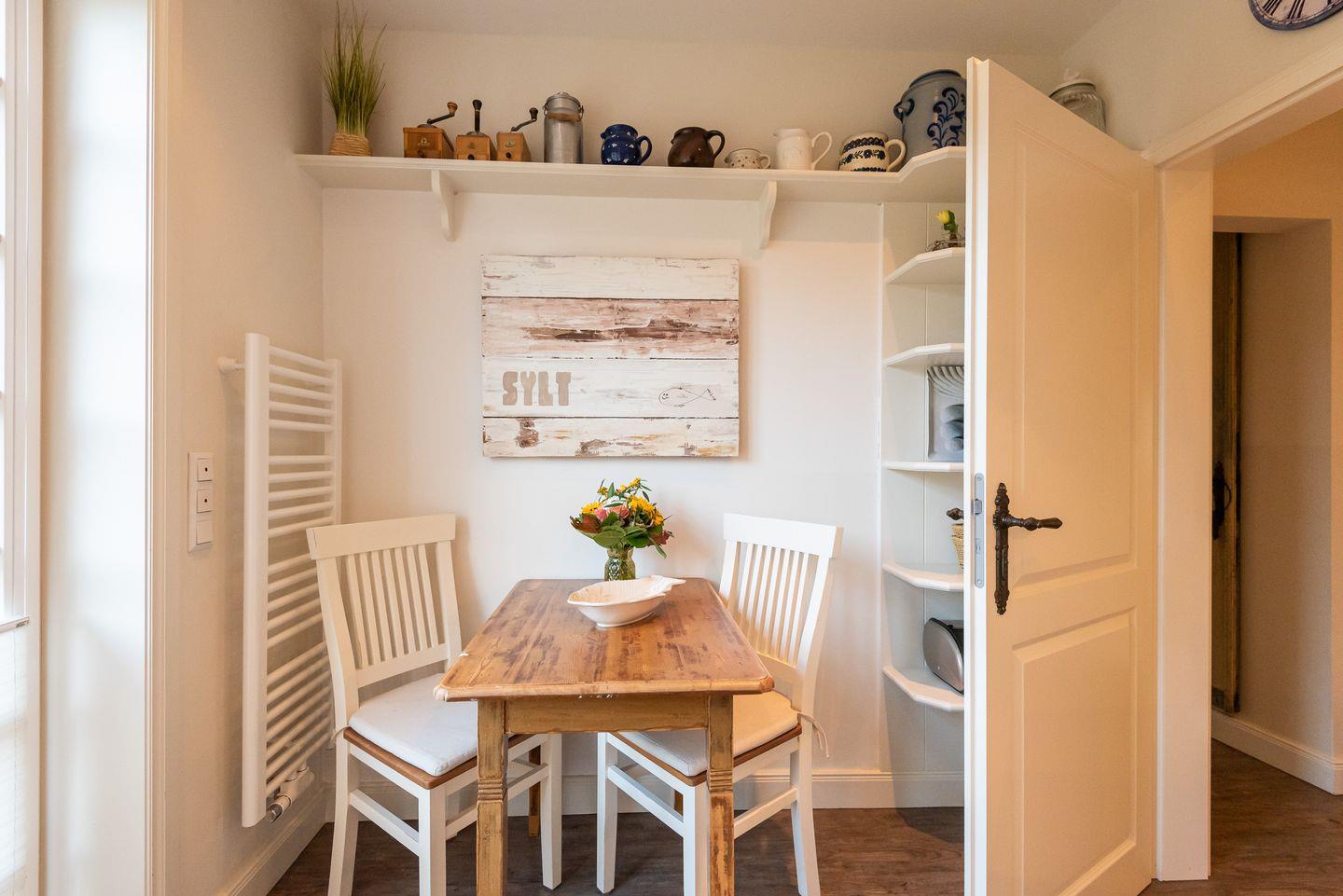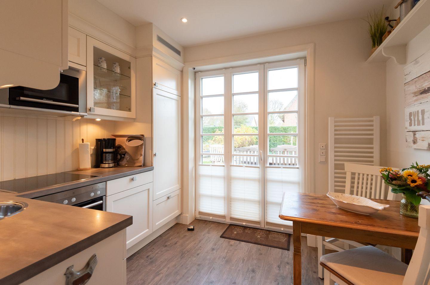 Küche: Gut ausgestattete Küche im Landhausstil mit einem weiteren kleinen Essbereich für zwei Personen. Von der Küche gelangen Sie auf die schöne Ost-Terrasse mit Gartenmöbeln. Zusätzlich steht Ihnen auf dem Grundstück ein weiterer Außenbereich zur exklusiven Nutzung mit gemauertem Holzkohlegrill, Strandkorb und Gartenliegen zur Verfügung.