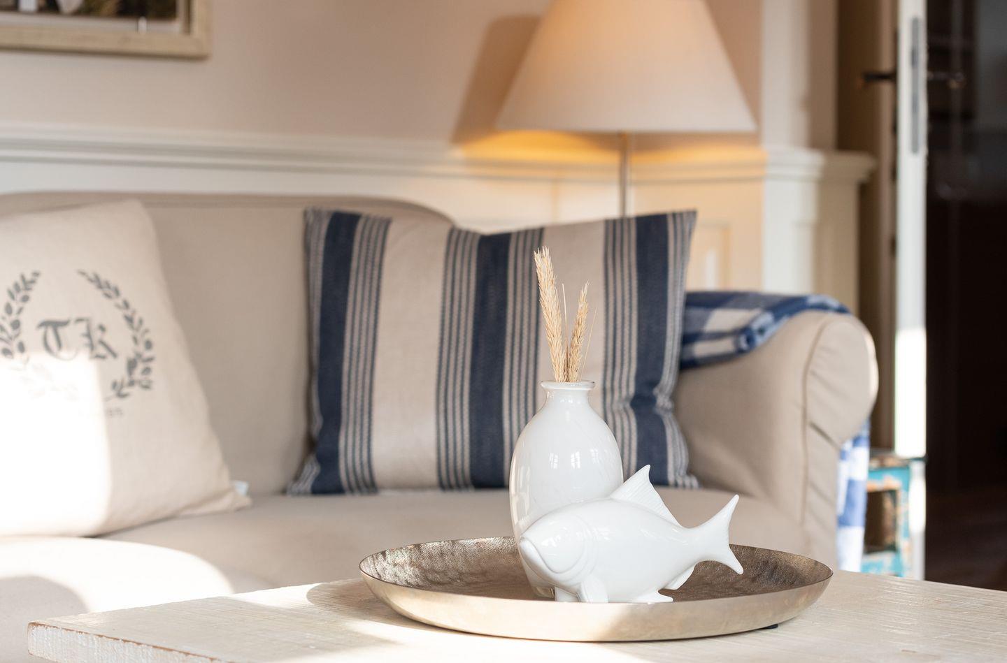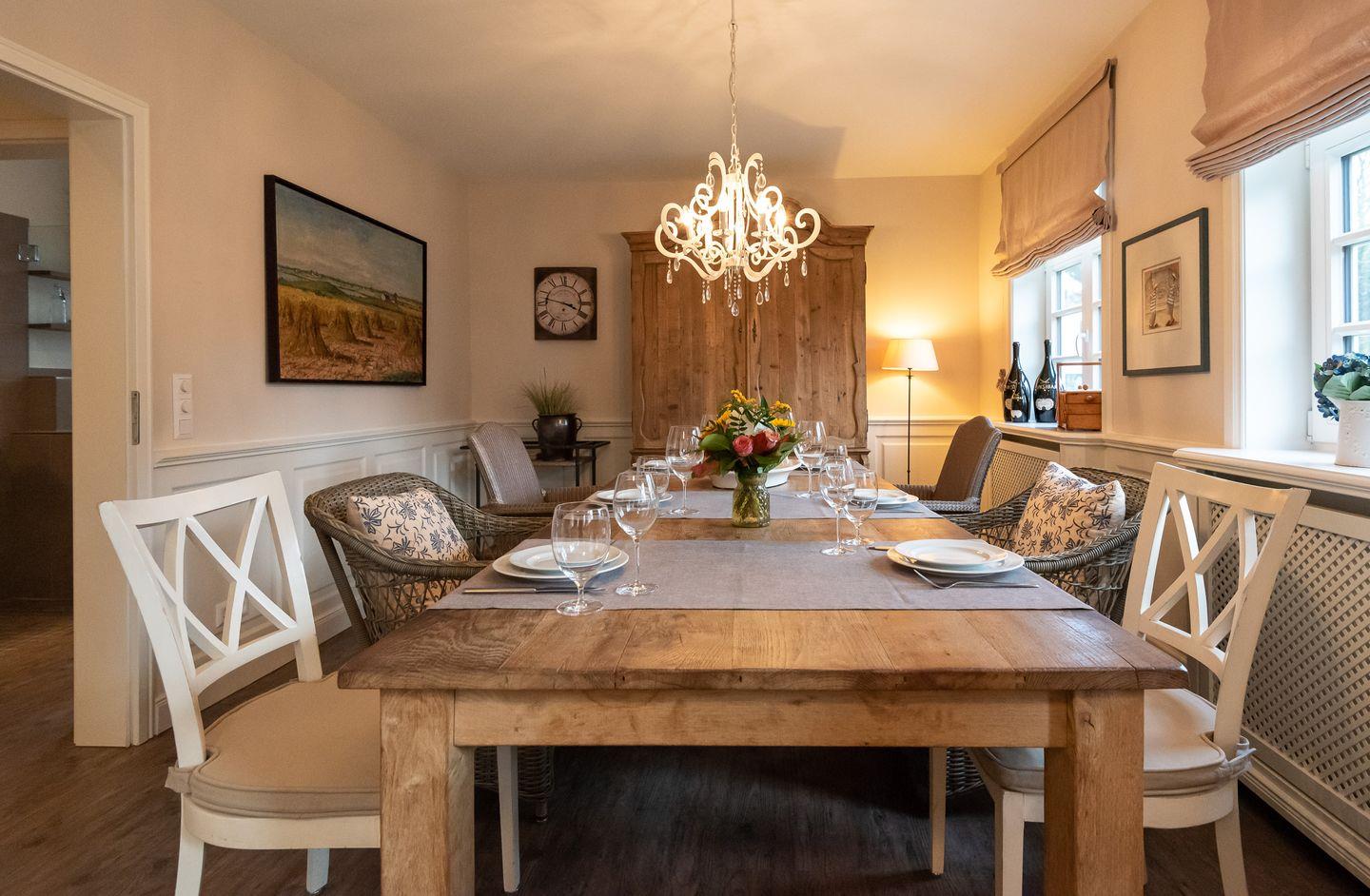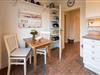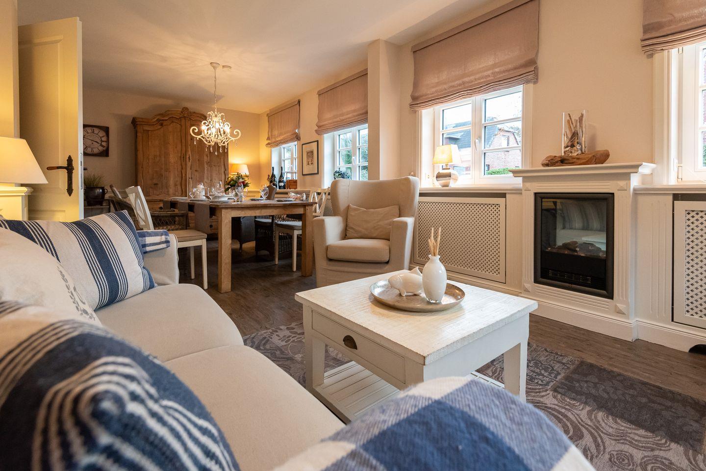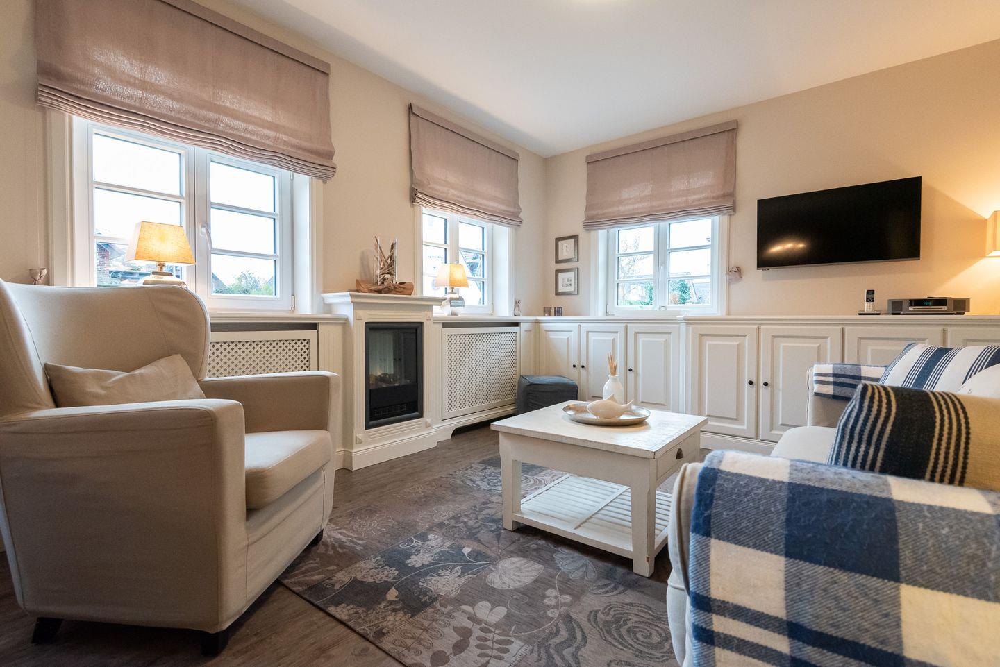 Küche: Gut ausgestattete Küche im Landhausstil mit einem weiteren kleinen Essbereich für zwei Personen. Von der Küche gelangen Sie auf die schöne Ost-Terrasse mit Gartenmöbeln. Zusätzlich steht Ihnen auf dem Grundstück ein weiterer Außenbereich zur exklusiven Nutzung mit gemauertem Holzkohlegrill, Strandkorb und Gartenliegen zur Verfügung.