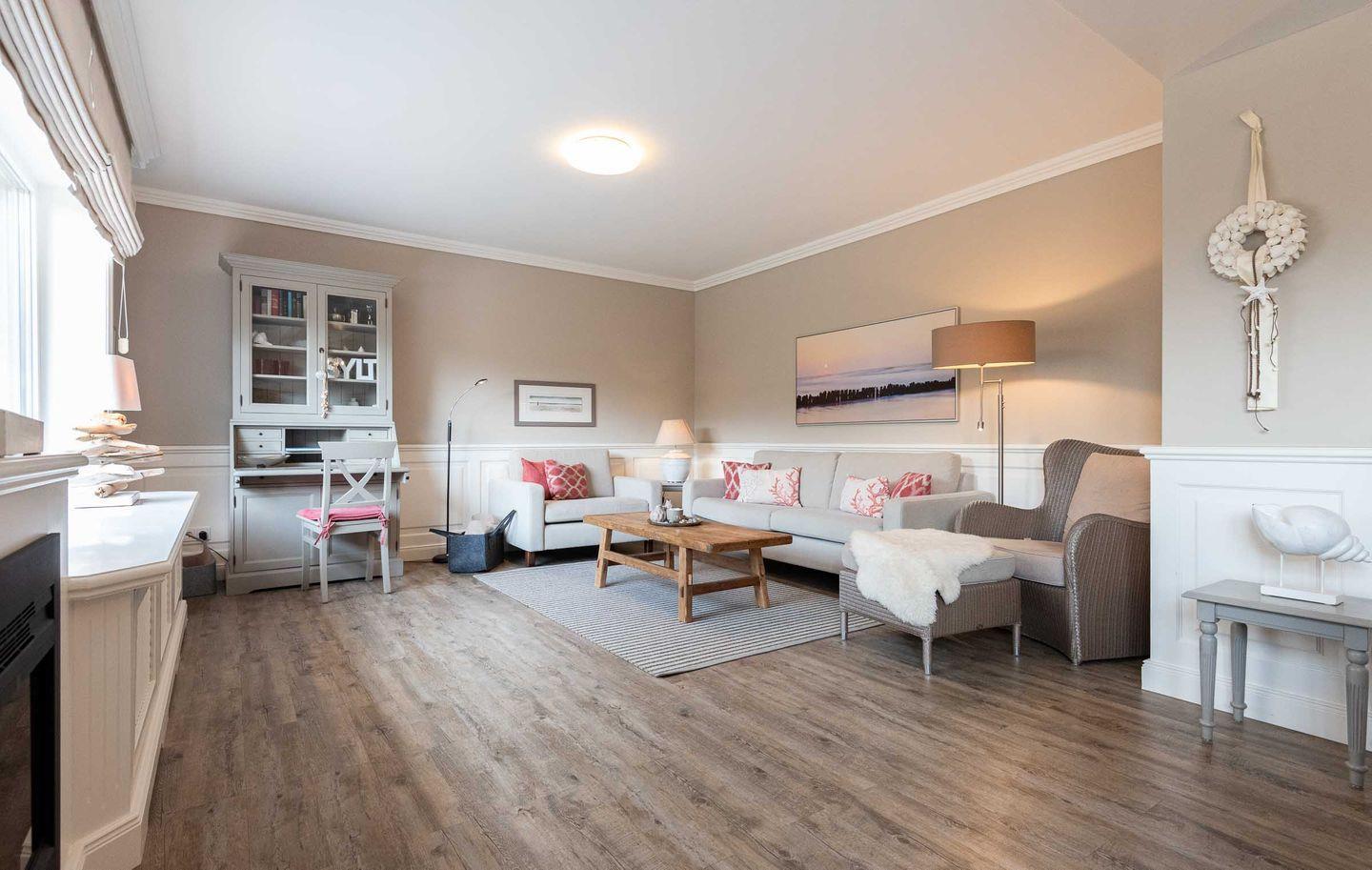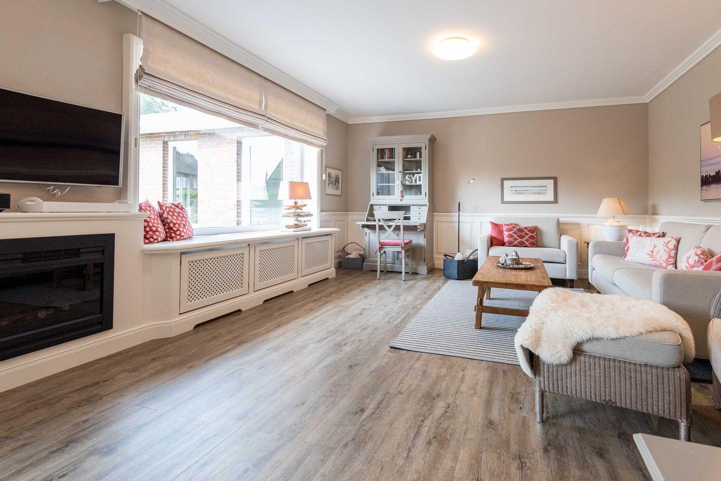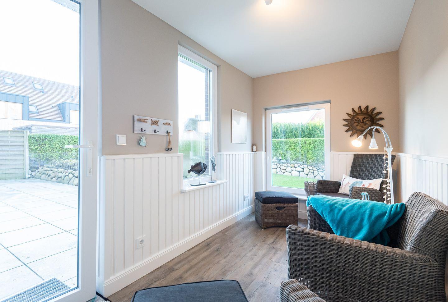 Wohn-/Essbereich: Der helle Wohnbereich lädt mit gemütlichen Polstermöbeln, TV, elektrischem Kamin sowie einem kleinen Sekretär, der auch mobiles Arbeiten im Urlaub ermöglicht, zum Verweilen ein. Der großzügige Essbereich für bis zu 4 Personen findet ebenfalls Platz im Wohnbereich, wo von aus Sie Zugang auf die schöne West-Terrasse mit Gartenmöbeln, Strandkorb und Elektrogrill haben. Ein kleiner und gemütlicher Wintergarten mit separatem Eingang grenzt direkt an die Terrasse und bietet sich für gemütliche Lesestunden mit Blick in den grünen Garten an.