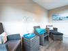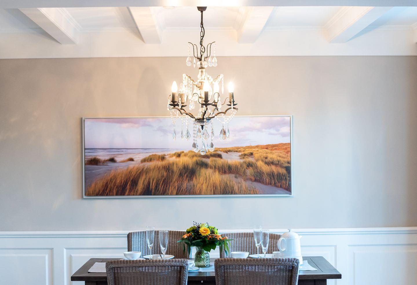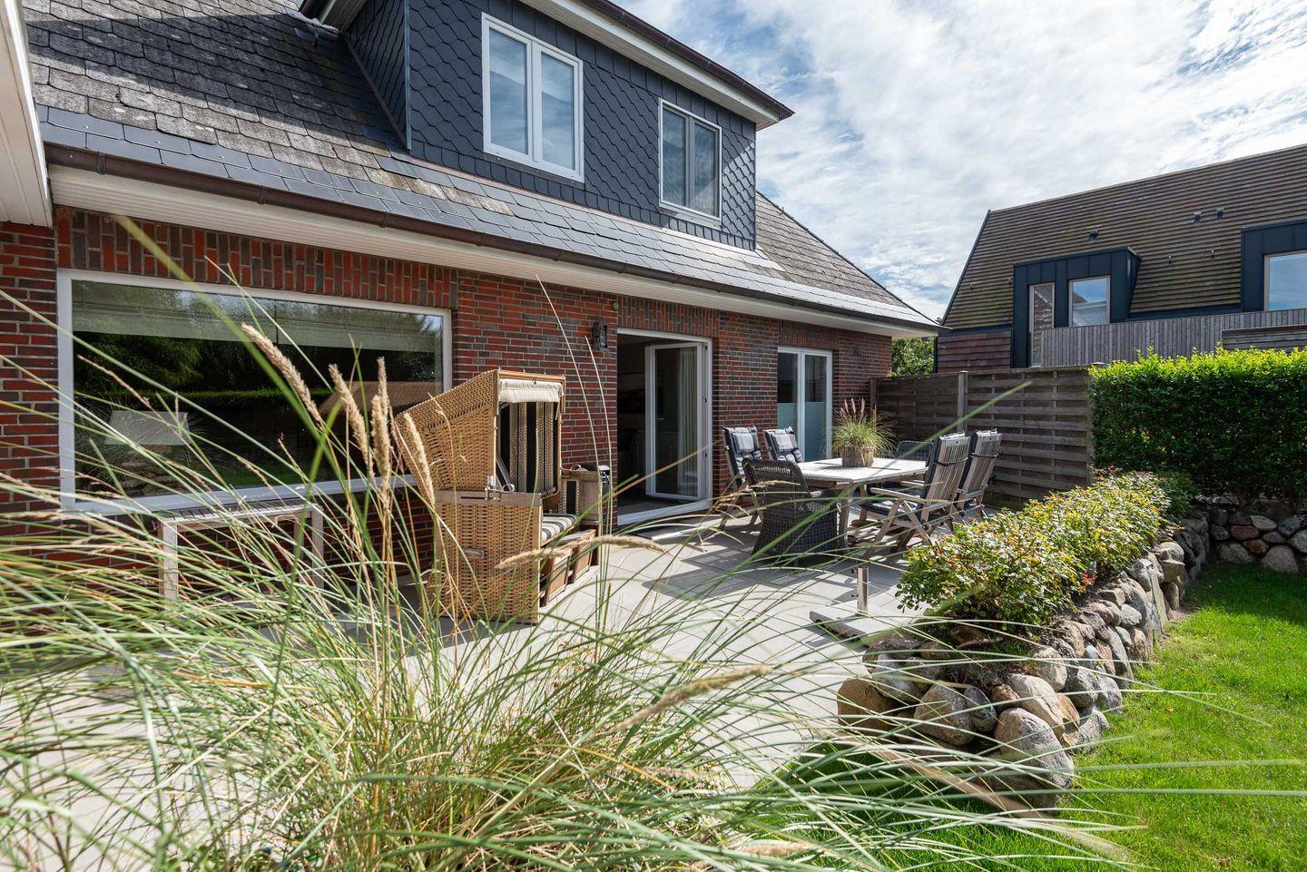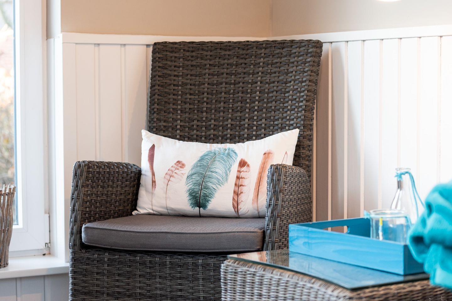 Wohn-/Essbereich: Der helle Wohnbereich lädt mit gemütlichen Polstermöbeln, TV, elektrischem Kamin sowie einem kleinen Sekretär, der auch mobiles Arbeiten im Urlaub ermöglicht, zum Verweilen ein. Der großzügige Essbereich für bis zu 4 Personen findet ebenfalls Platz im Wohnbereich, wo von aus Sie Zugang auf die schöne West-Terrasse mit Gartenmöbeln, Strandkorb und Elektrogrill haben. Ein kleiner und gemütlicher Wintergarten mit separatem Eingang grenzt direkt an die Terrasse und bietet sich für gemütliche Lesestunden mit Blick in den grünen Garten an.