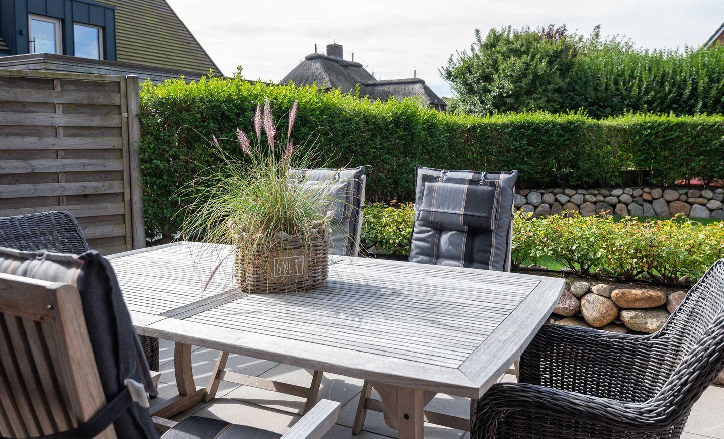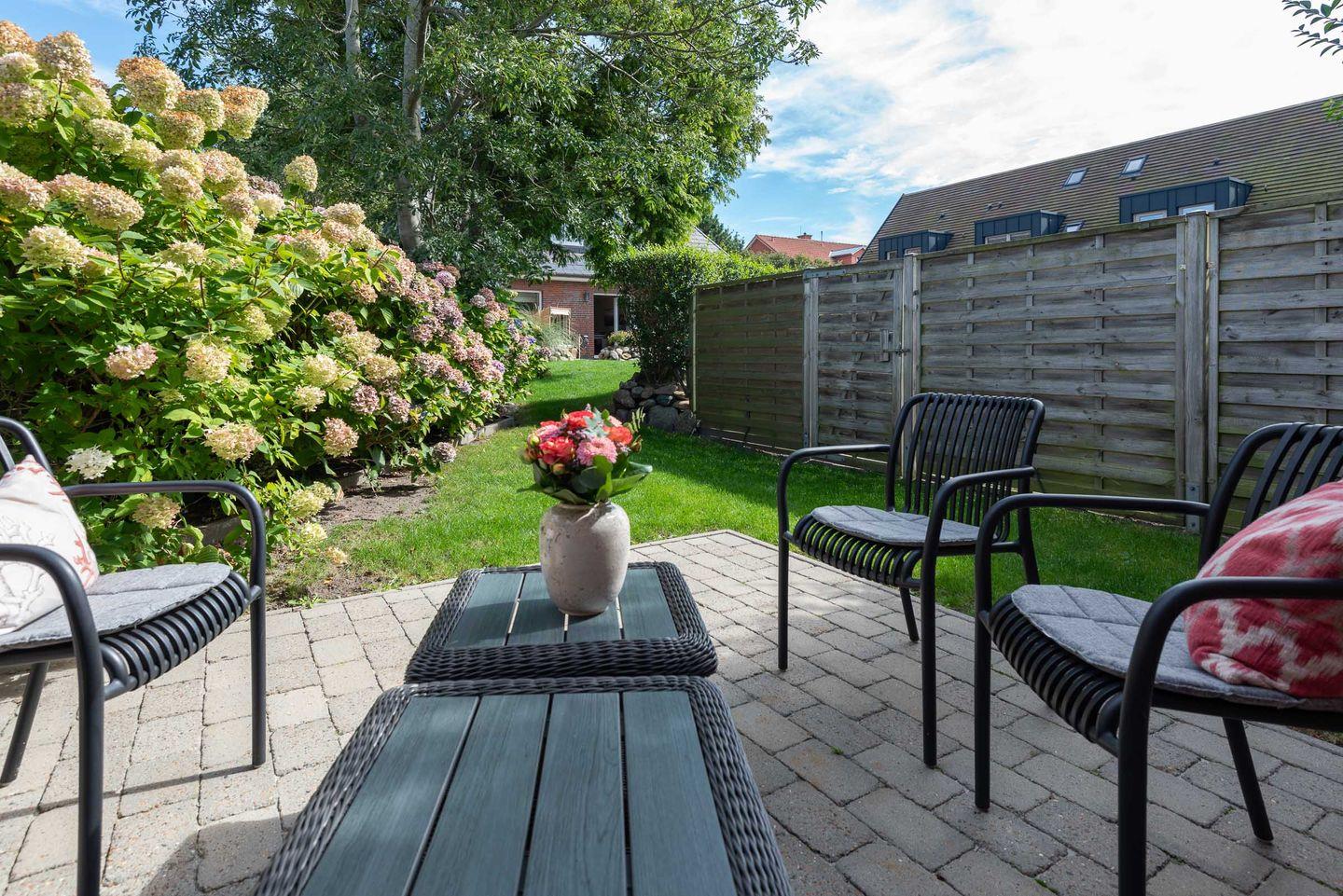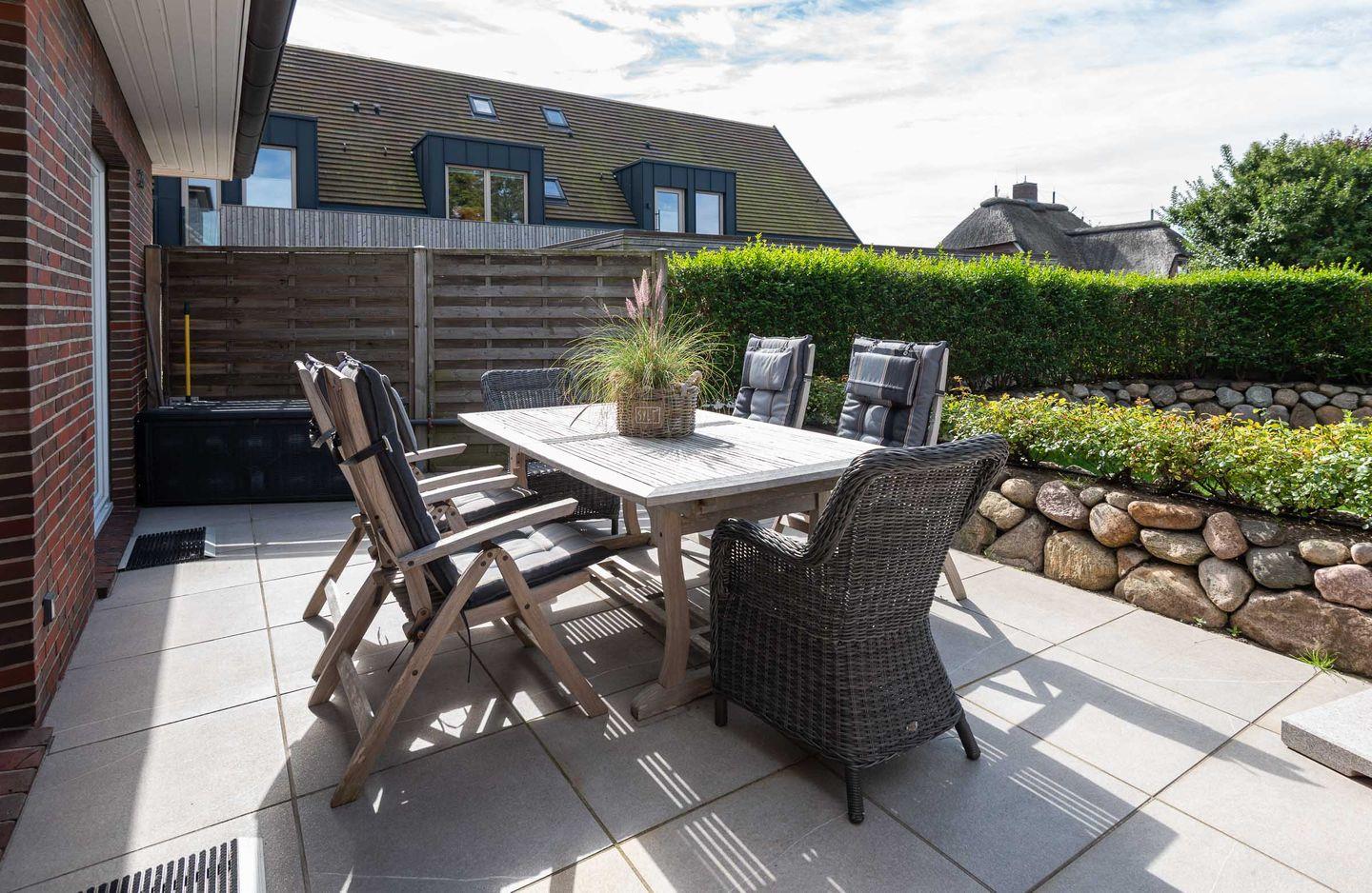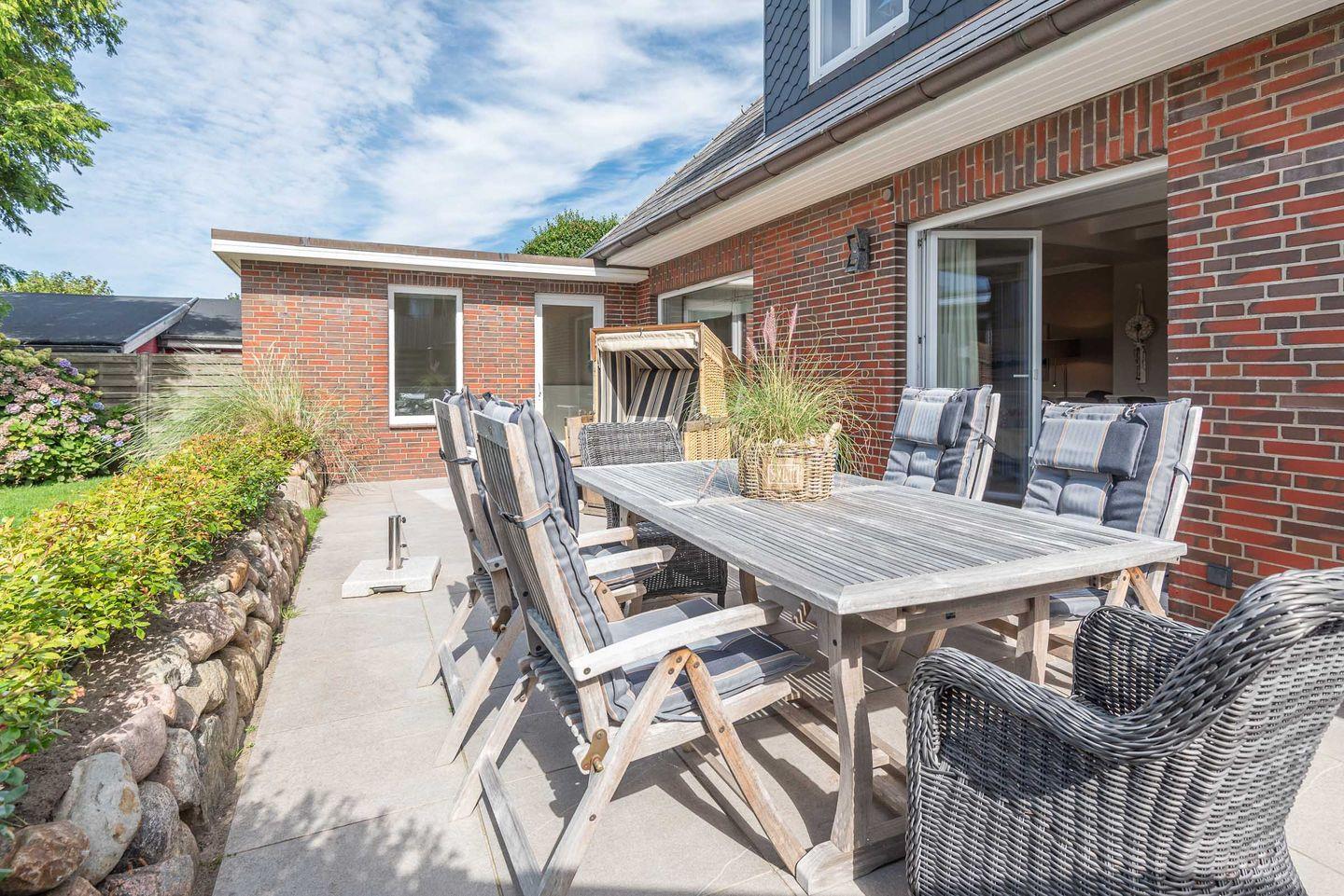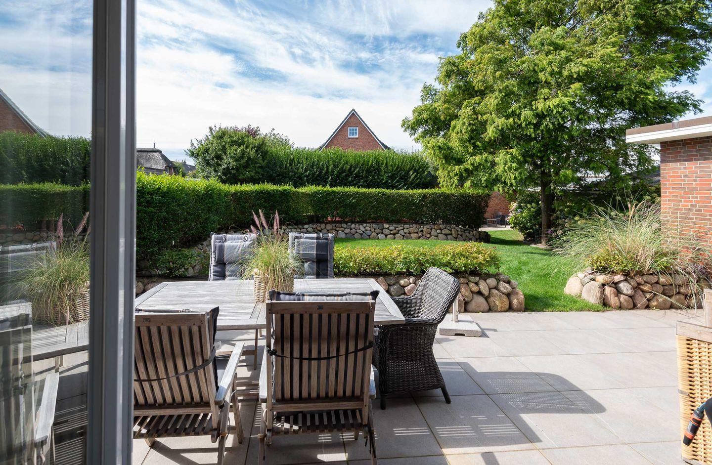 Die Ferienwohnung befindet sich im Erdgeschoss vom Sönhüs auf einem ca. 860 m² großen und eingewachsenen Grundstück.
