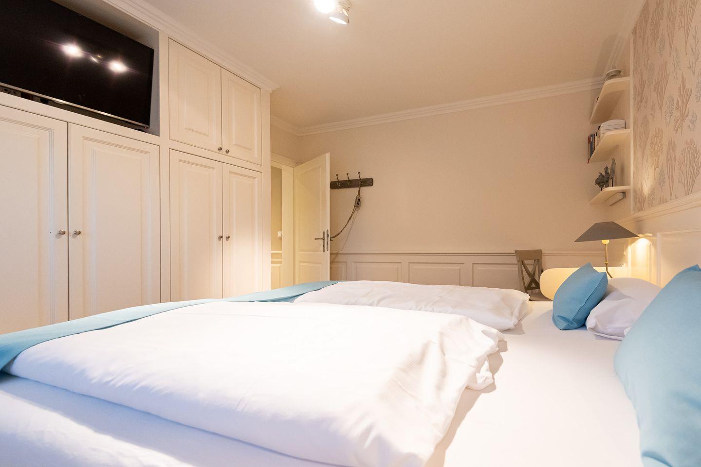 Schlafzimmer 2: Gemütliches Doppelbett, Einbauschränke und TV.