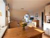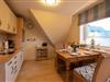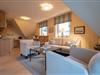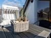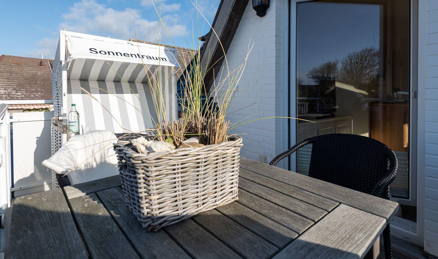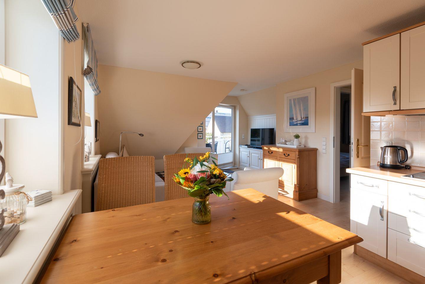 Koch-/Wohn-/Essbereich: Heller Wohnbereich mit gemütlichen Polstermöbeln sowie einem gemütlichen Essbereich für 4 Personen, welche perfekt an die offene und gut ausgestattete Küche angrenzt. Vom Wohnbereich gelangen Sie auf den Südwest-Balkon mit Balkonmöbeln und Strandkorb.