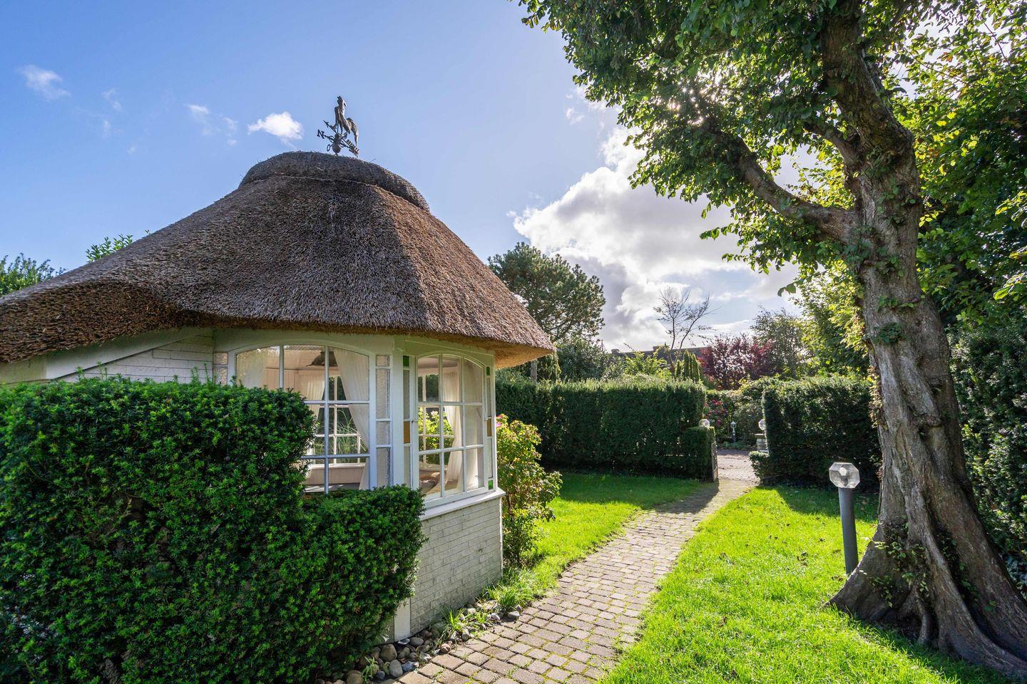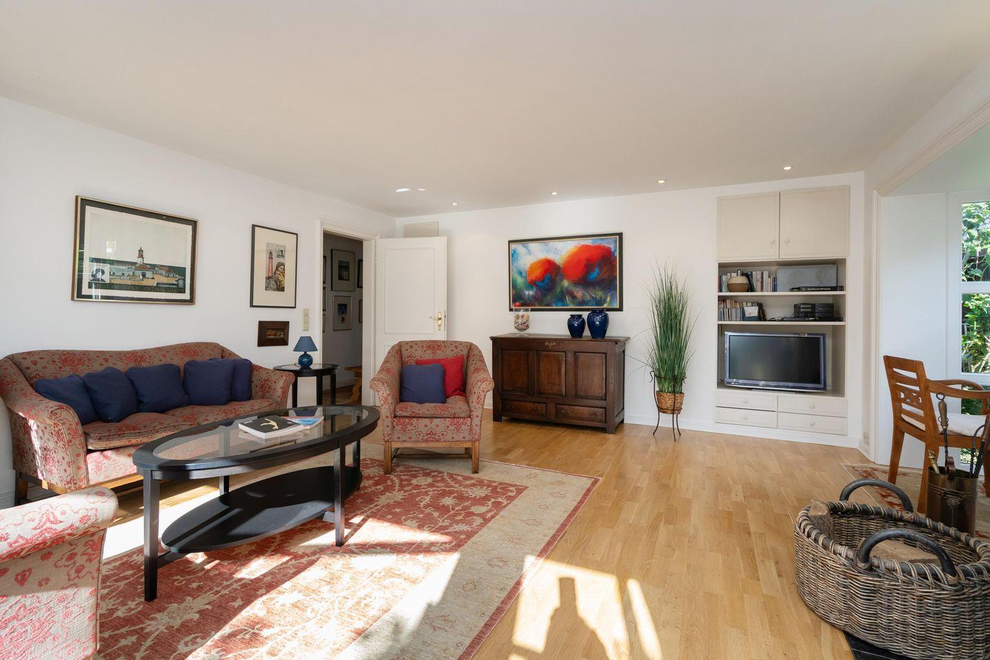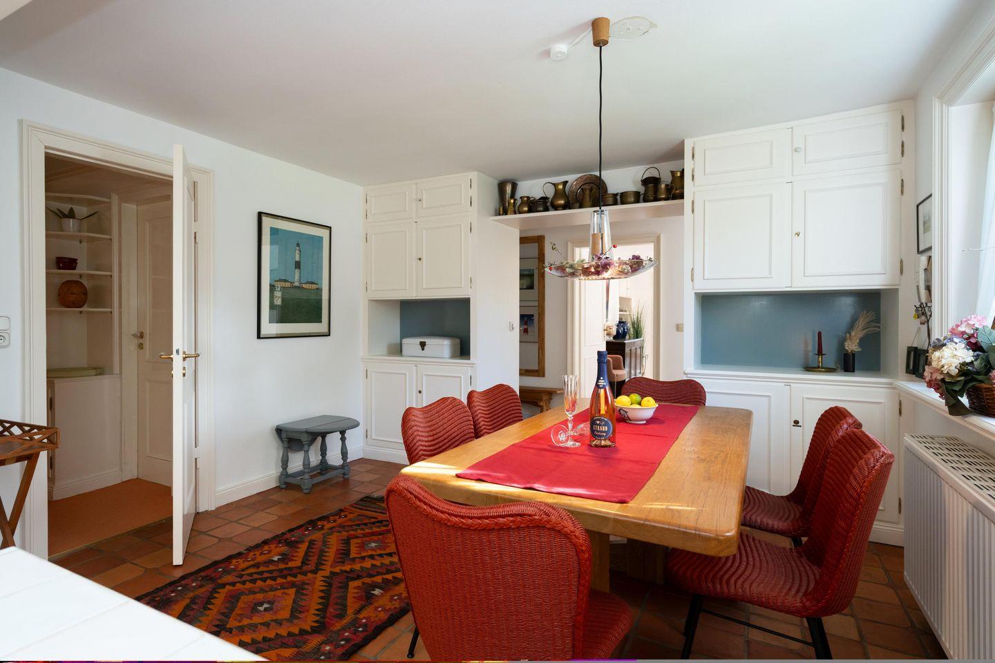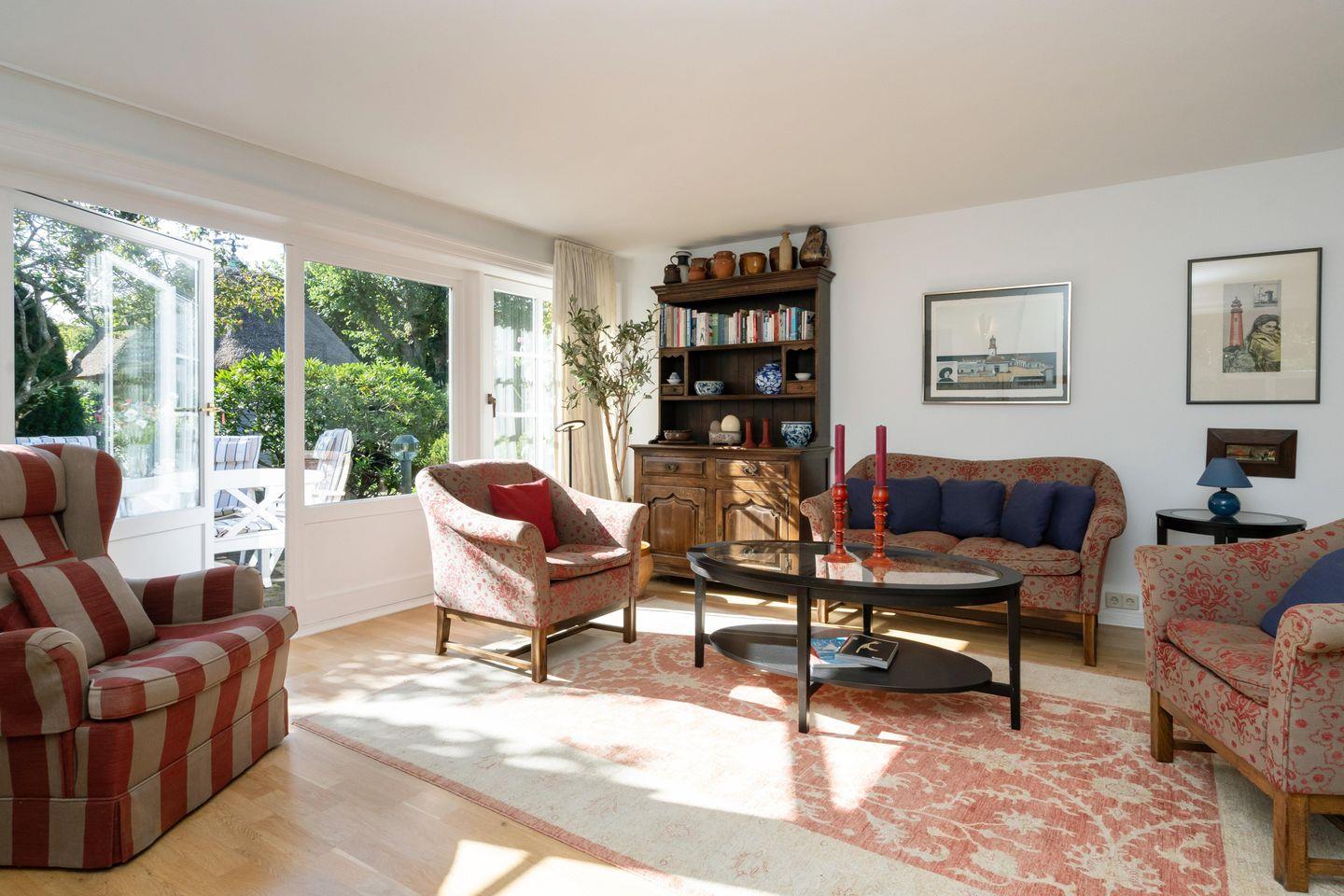 Das freistehende, ebenerdige Ferienhaus "Hideaway" bietet auf ca. 100 m² ein stilvolles und gemütliches Ambiente für bis zu 4 Personen. Ruhig gelegen im idyllischen Alt-Westerland, ist es mit seinem großzügigen, eingezäunten Garten der perfekte Ort für erholsame Tage auf Sylt. Das helle Wohnzimmer lädt mit einem bequemen Sofa, Sesseln, einem kleinen Schreibtisch sowie TV zu Entspannen ein. Von hier aus gelangen Sie direkt auf die möblierte Südterrasse und in den liebevoll angelegten Garten mit reetgedecktem Pavillon – ideal, um die Ruhe und das friesische Flair in vollen Zügen zu genießen. Im angrenzenden Esszimmer finden bis zu 6 Personen an einem rustikalen Holztisch Platz – perfekt für gemeinsame Mahlzeiten in gemütlicher Runde. Die offene Landhausküche ist komplett ausgestattet, inkl. Geschirrspüler und modernen Annehmlichkeiten, um Sie auch kulinarisch bestens zu versorgen. Das Hauptschlafzimmer ist mit einem elektrisch verstellbaren Doppelbett (2x 90x200 cm) und einem geräumigen Einbauschrank ausgestattet. Ein eigenes Tageslichtbad en suite mit Dusche und WC rundet den Komfort ab. Das zweite Schlafzimmer verfügt über zwei Einzelbetten (je 90x200 cm) und einen Kleiderschrank. Auch hier steht ein eigenes Tageslichtbad mit Badewanne, separater Dusche und WC zur Verfügung. Ein einladender Flur mit Garderobe im Eingangsbereich sowie ein zusätzliches Gäste-WC sorgen für noch mehr Bequemlichkeit während Ihres Aufenthaltes. WLAN (ohne Gewähr) sowie zwei PKW-Stellplätze sind vorhanden. Ein Hund ist herzlich willkommen.