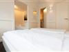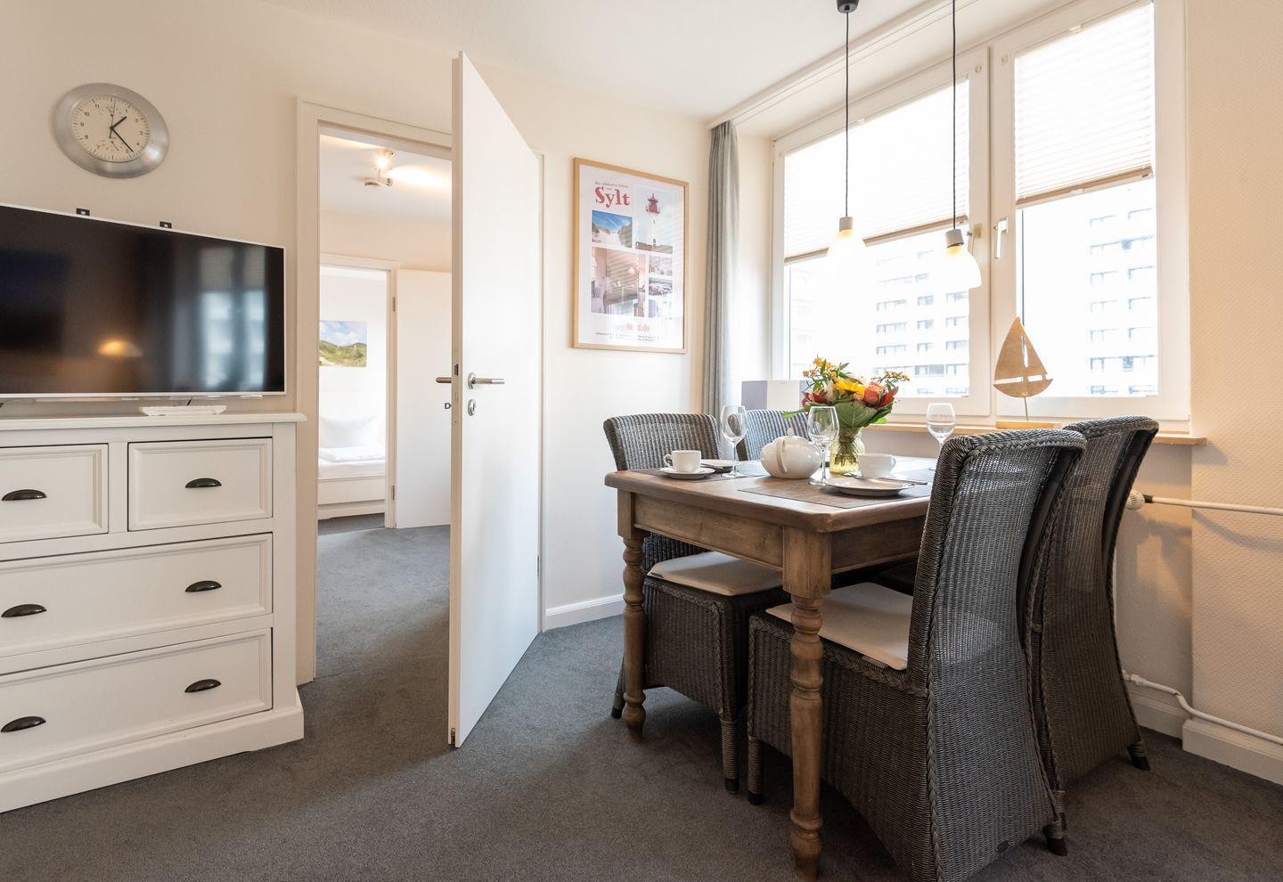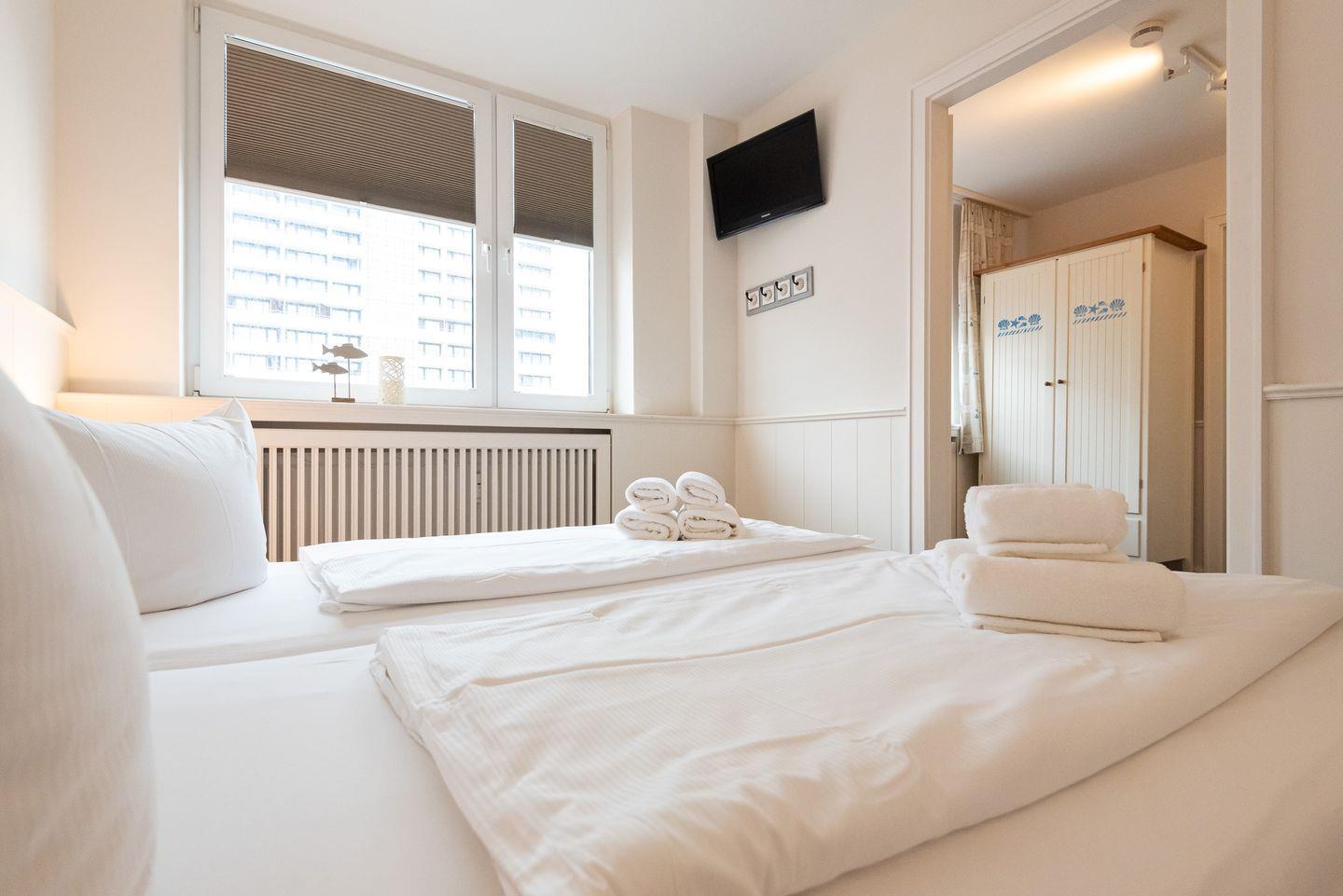 Das gemütlich eingerichtete 3-Zimmer-App. befindet sich in der 4. Etage eines gepflegten Hauses und bietet auf ca. 43 m² für bis zu drei Personen. Durch die gegenüberliegenden Häuserblöcke lässt sich vom Fenster aus ein kleiner Meerblick erhaschen ? ideal für entspannte Urlaubstage in maritimer Atmosphäre. Der zentrale Vorflur führt direkt in das helle Wohnzimmer, die separate Küche sowie in das Badezimmer mit Dusche und WC. Im Wohnbereich laden eine bequeme Sitzgarnitur (Zweisitzer), ein Sessel sowie ein Esstisch zum Verweilen ein. Für Unterhaltung sogen ein Flachbild-TV, ein Radio sowie WLAN. Die gut ausgestattete Küche verfügt über einen Geschirrspüler, einen Herd, eine Mikrowelle und einen Kühlschrank mit Gefrierfach. Eine Kaffeemaschine, ein Wasserkocher und ein Toaster gehören ebenfalls zur Grundausstattung. Beide Schlafzimmer sind vom Wohnzimmer aus zugänglich. Das erste ist mit einem Einzelbett (90x190 cm) eingerichtet, während das zweite ? dahinter liegende ? Schlafzimmer über ein Doppelbett (2x 90x200 cm), einen eigenen Flachbild-TV sowie einen begehbaren Kleiderschrank verfügt. Dieses Zimmer bietet zudem einen zweiten Zugang zum Badezimmer. Im Badezimmer finden Sie eine Dusche, ein WC sowie einen Waschtisch. Haustiere sind herzlich willkommen. Ein Fahrstuhl ist im Haus vorhanden und über eine halbe Etage zu Fuß erreichbar.