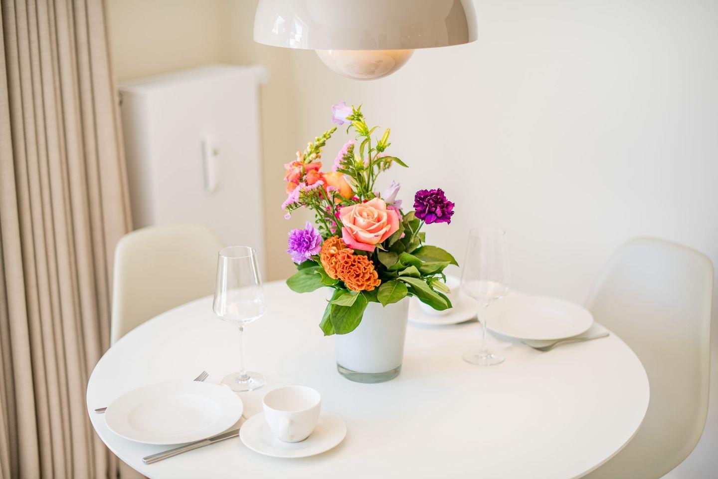 Wohn-/Koch-/Essbereich: Geräumiger Wohnraum mit gemütlichem Beleuchtungskonzept, Sofa, TV und einer Kommode. Bei dem Sofa handelt es sich um ein Schlafsofa, welches in ausgezogenem Zustand eine Liegefläche von 1,60 m x 2,00 m hat und einen Schlafplatz für eine weitere Personen bietet. Der runde Esstisch mit stylischen Esstischstühlen lädt zu geselligen Mahlzeiten ein. Die angrenzende und helle Einbauküche ist sehr gut ausgestattet.