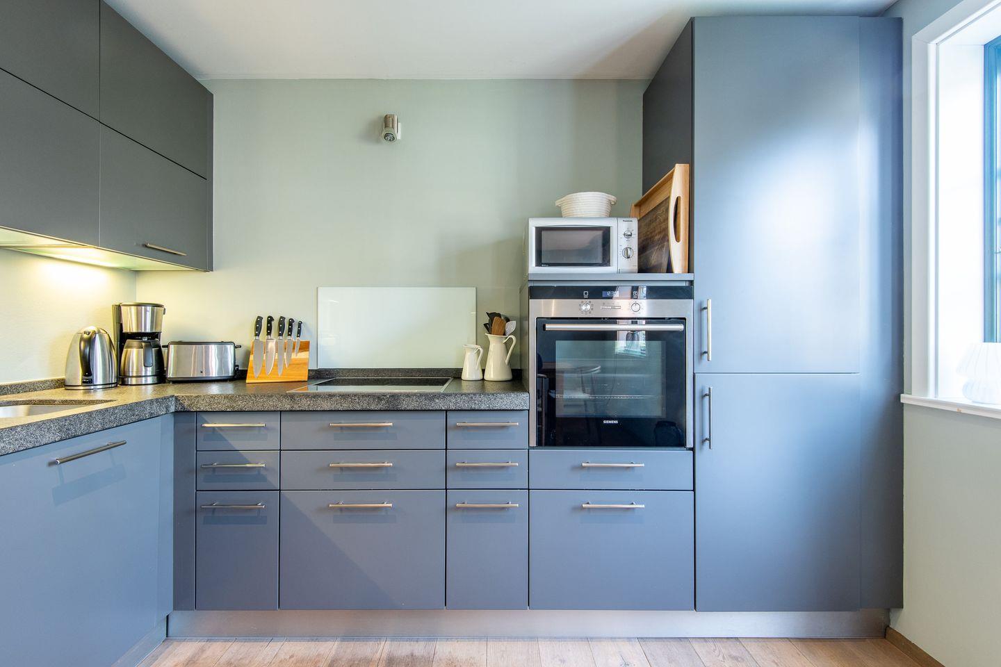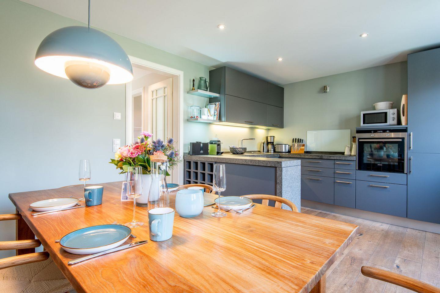 Die moderne Küche ist mit einem Induktionsherd, einer Filterkaffeemaschine, sowie eine Nespresso-Kapselmaschine und weiteren hochwertigen Geräten ausgestattet. Hier finden Sie alles, was Sie für die Zubereitung köstlicher Mahlzeiten benötigen. Ein großer Esstisch für bis zu 6 Personen sorgt für gesellige Stunden beim Essen oder Spielen. Von hier aus gelangen Sie direkt auf die sonnige Terrasse, wo Sie im Freien den Tag im Strandkorb ausklingen lassen können.