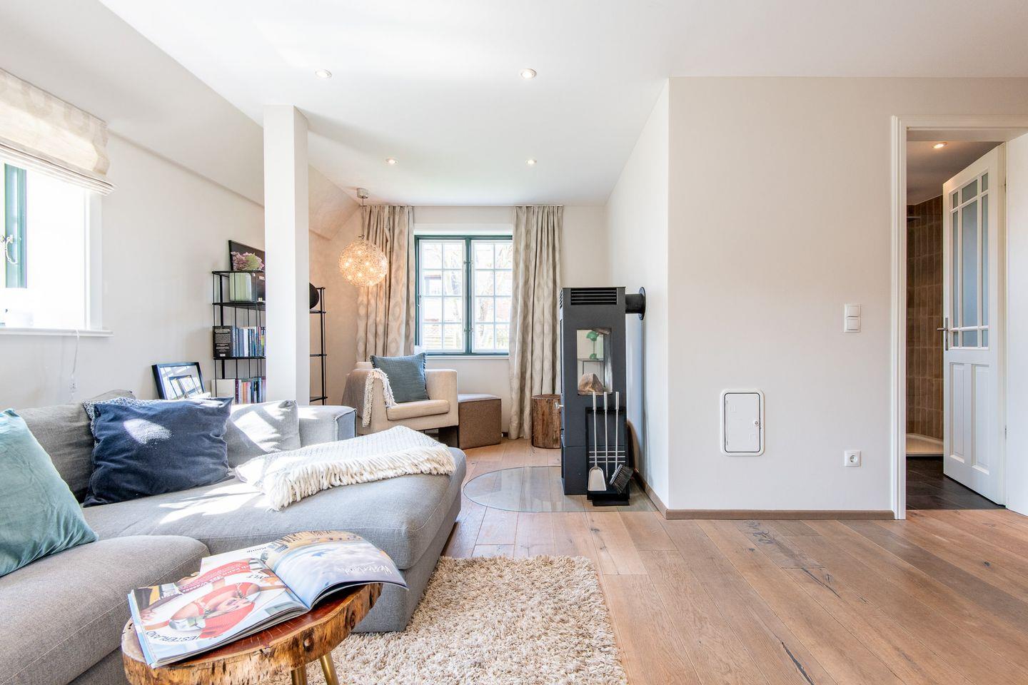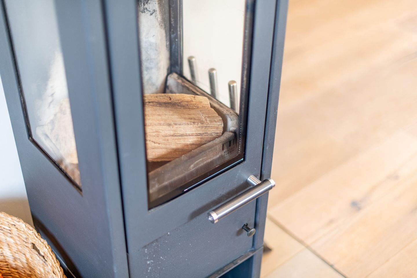 Das helle und gemütliche Wohnzimmer ist mit einem gemütlichen Sofa und einen wohlig wärmenden Holz-Kamin ausgestattet und lädt zu entspannten Abenden ein.