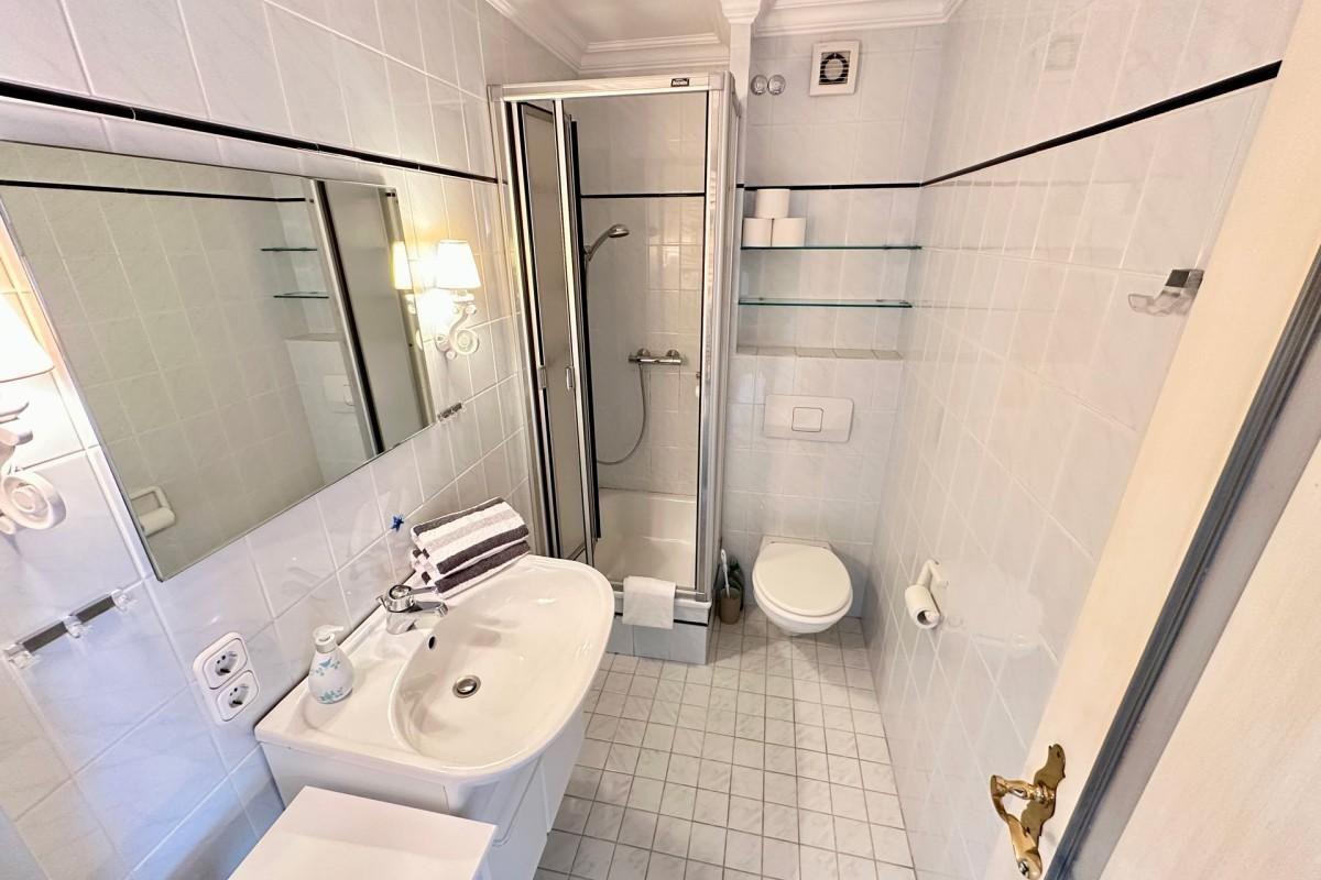 Badezimmer ist mit einer Dusche, WC und einem Waschtisch ausgestattet – ideal,