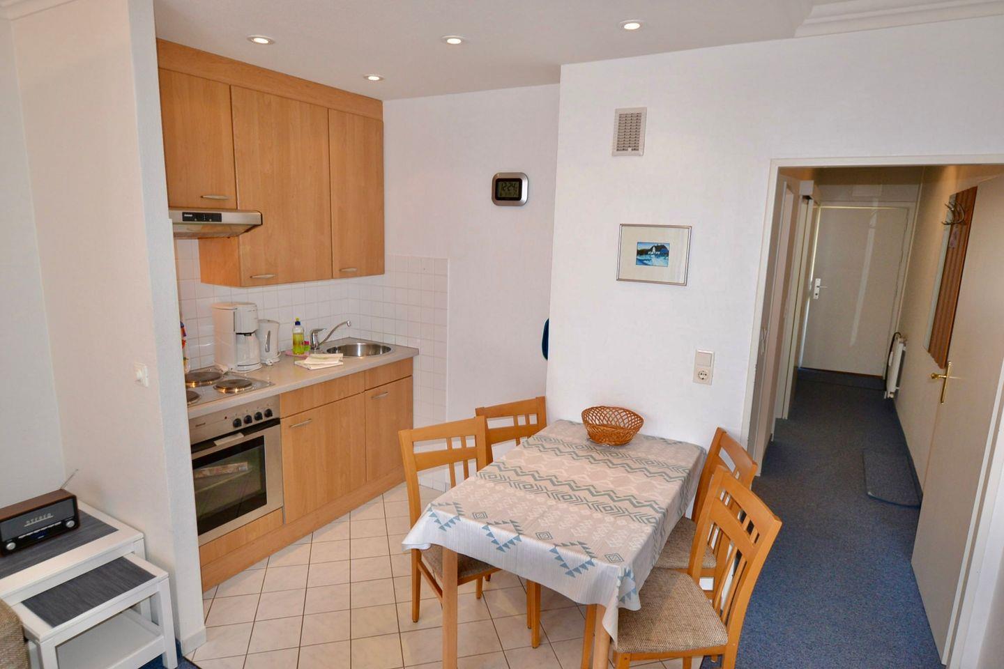 einen E-Herd mit 4-Plattenkochfeld, Kühlschrank und eine gemütliche Essecke für