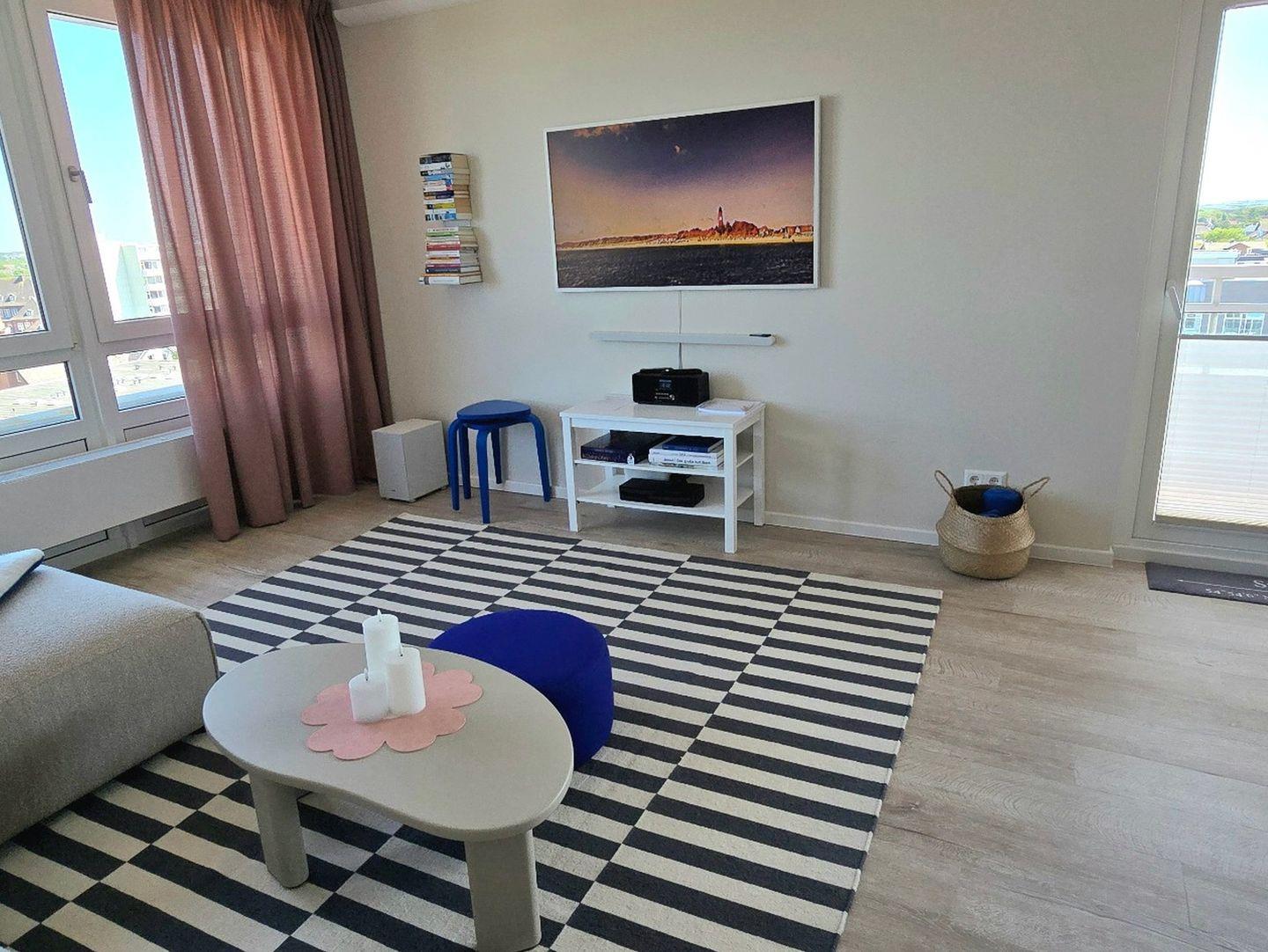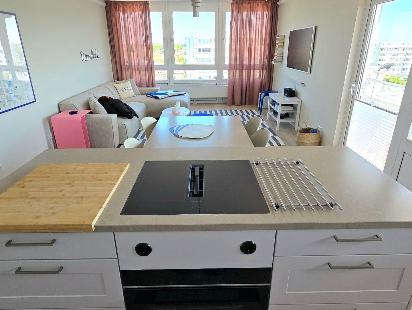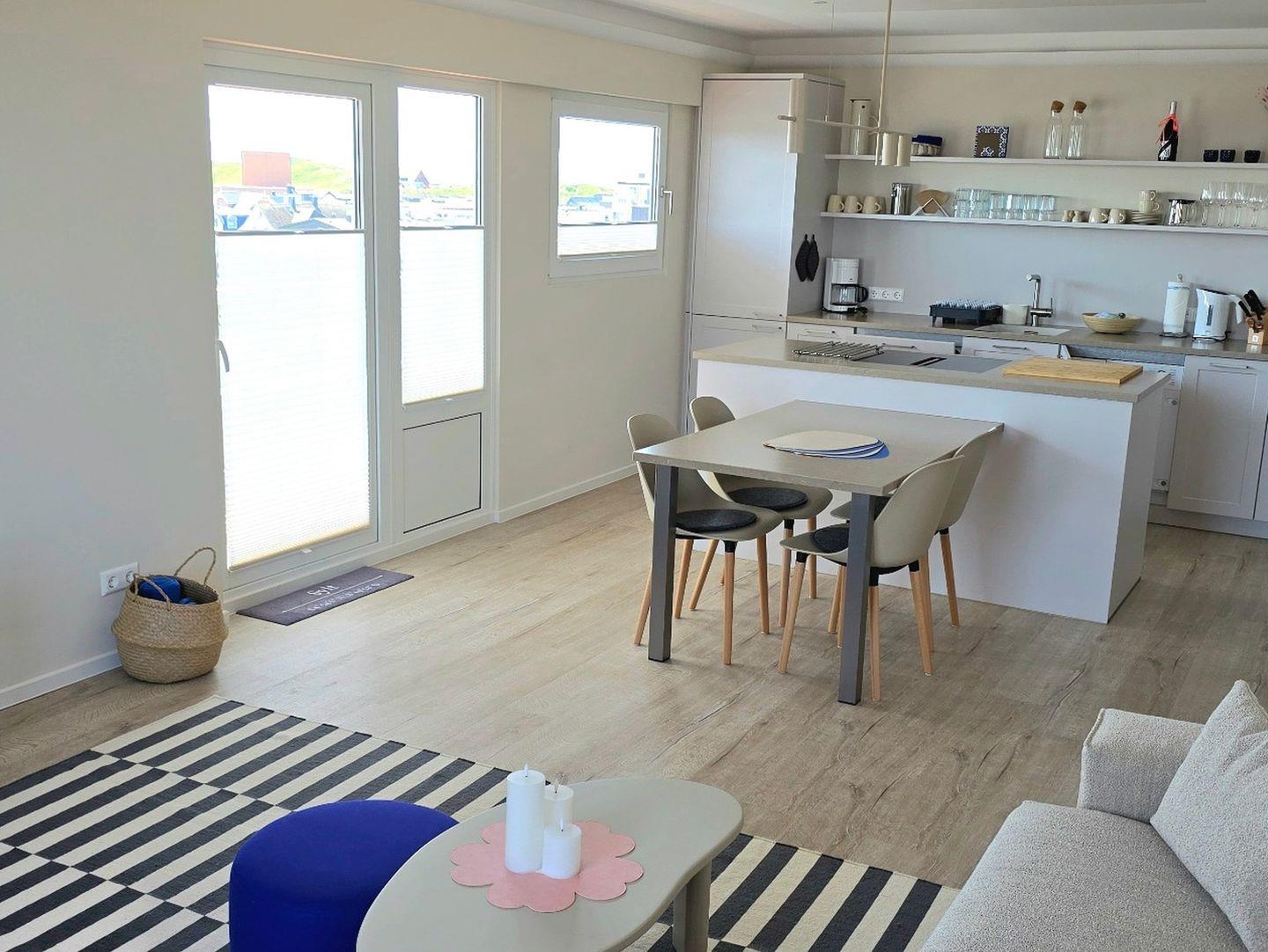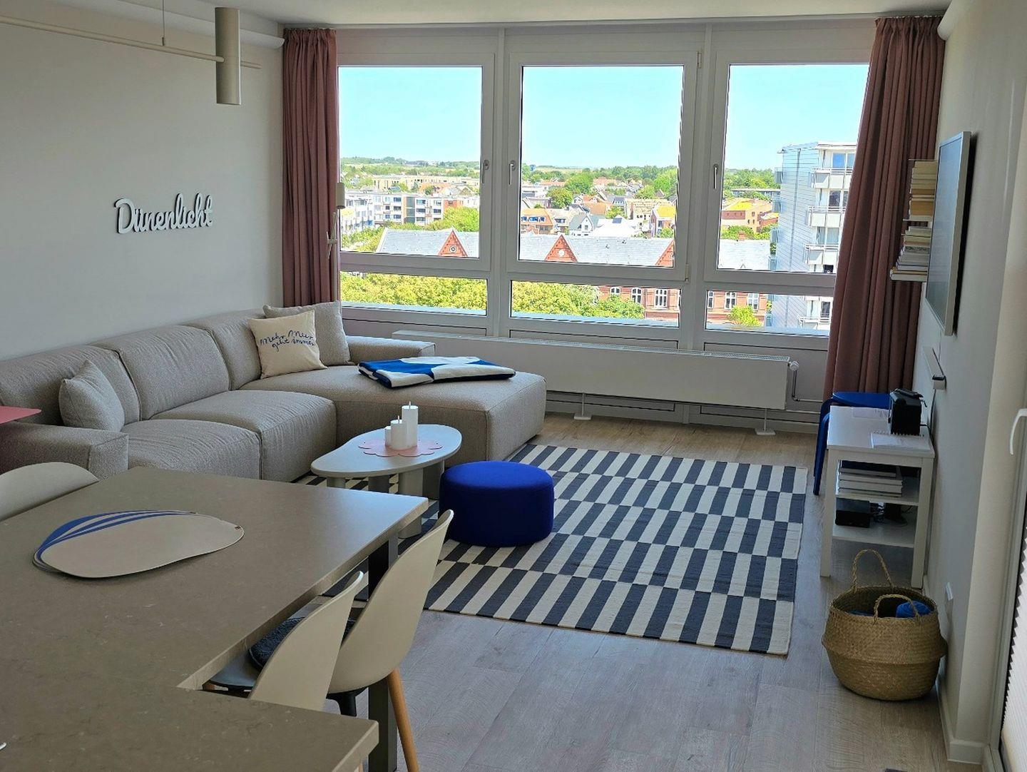 Willkommen im Apartment Dünenlicht – Ihre stilvolle Auszeit im Herzen von Westerland. Die frisch renovierte 3-Zimmer-Wohnung (94?m²) im 5. Stock mit Aufzug bietet bis zu vier Gästen viel Platz, Komfort, Ruhe und eine herrliche Aussicht über Sylt. Genießen Sie entspannte Stunden auf dem sonnigen, überdachten Südbalkon oder erkunden Sie Strand, Stadtzentrum, Cafés und Restaurants – alles in wenigen Minuten bequem zu Fuß erreichbar. Die Nichtraucherwohnung verfügt über zwei separate Schlafzimmer, ein modernes Bad mit Dusche und Badewanne sowie ein zusätzliches Gäste-WC. Die offene Küche ist sehr hochwertig ausgestattet (Induktionsherd, Backofen, Mikrowelle, Gefrierschrank, Toaster, Spülmaschine) und das Wohnzimmer lädt mit großem TV, Esstisch und gemütlichem Sofa zum Verweilen ein. Weitere Extras: schnelles WLAN, Magenta TV, Waschtrockner, Boxspringbett, Tiefgaragenstellplatz mit Platz für Fahrräder. Ein ideales Apartment auf Sylt für Paare oder Freunde, zentral, komfortabel, barrierearm.