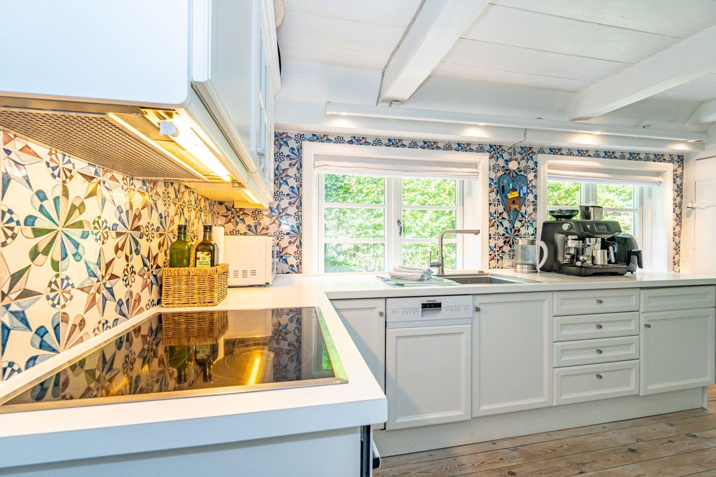Die geschlossene Küche ist bestens ausgestattet und lässt keine Wünsche offen: Ceranherd, Backofen, Mikrowelle, Spülmaschine, Kühlschrank, Kaffeemaschine, Wasserkocher, Küchenutensilien sowie Geschirr und Besteck machen auch längere Aufenthalte angenehm und komfortabel. Ein Abfalleimer ist selbstverständlich vorhanden.