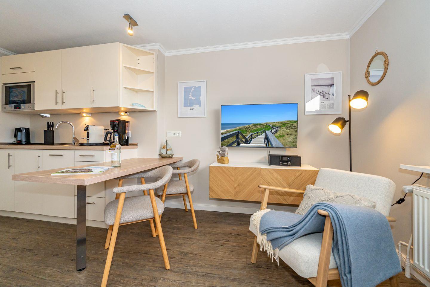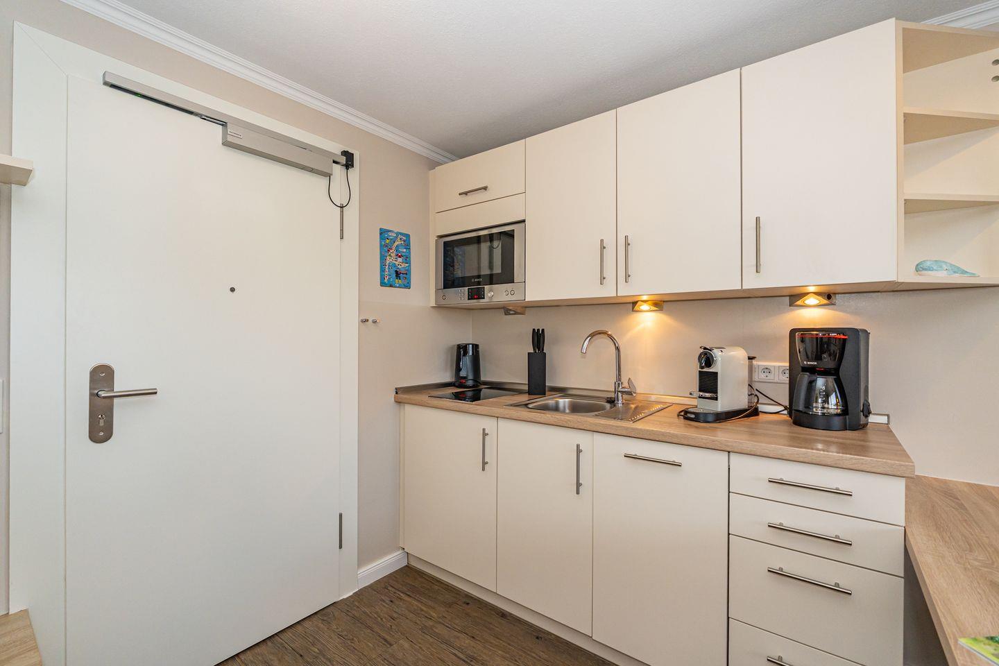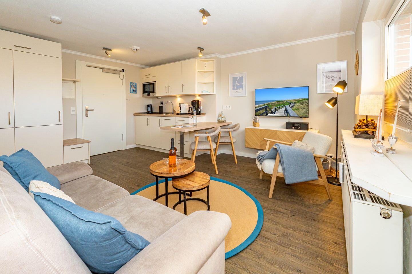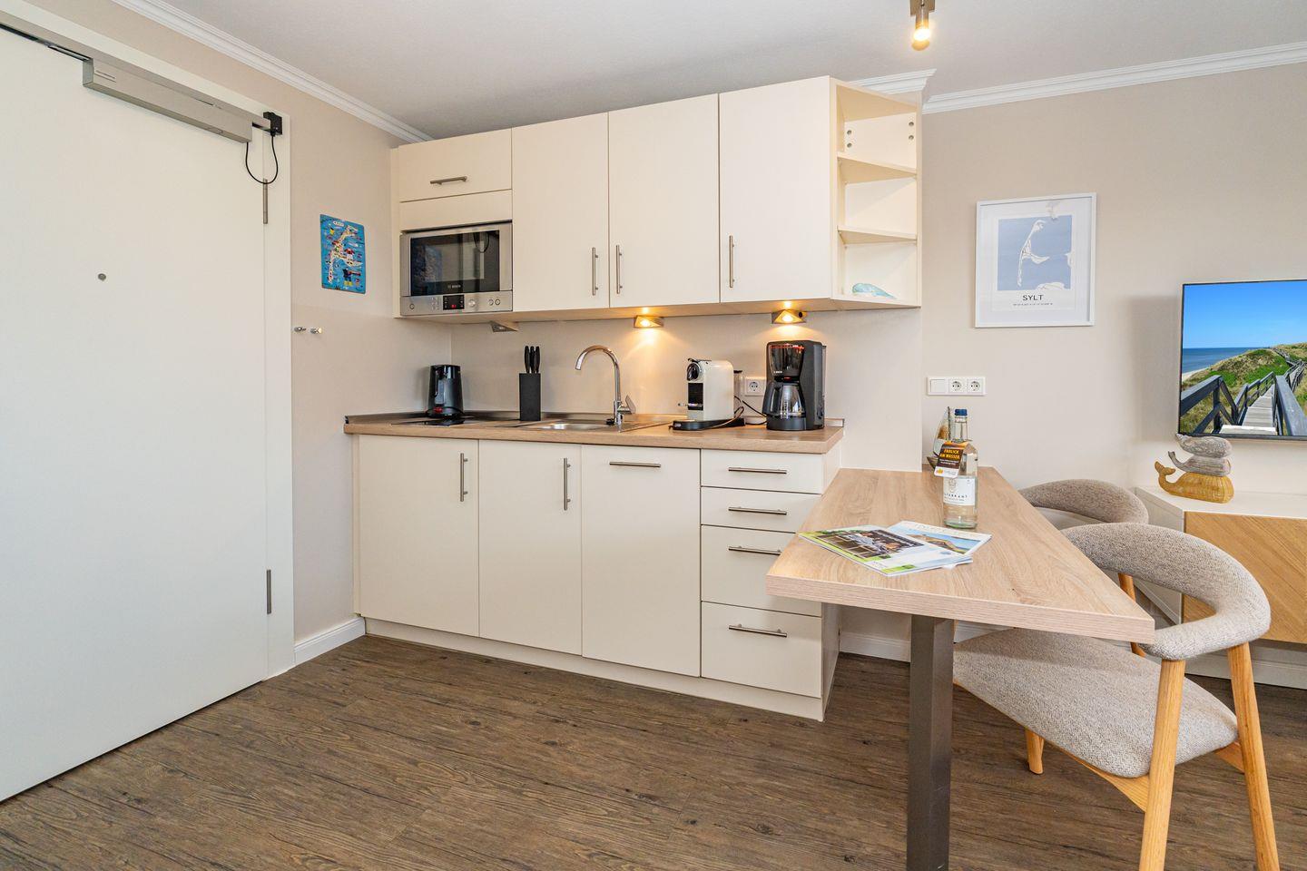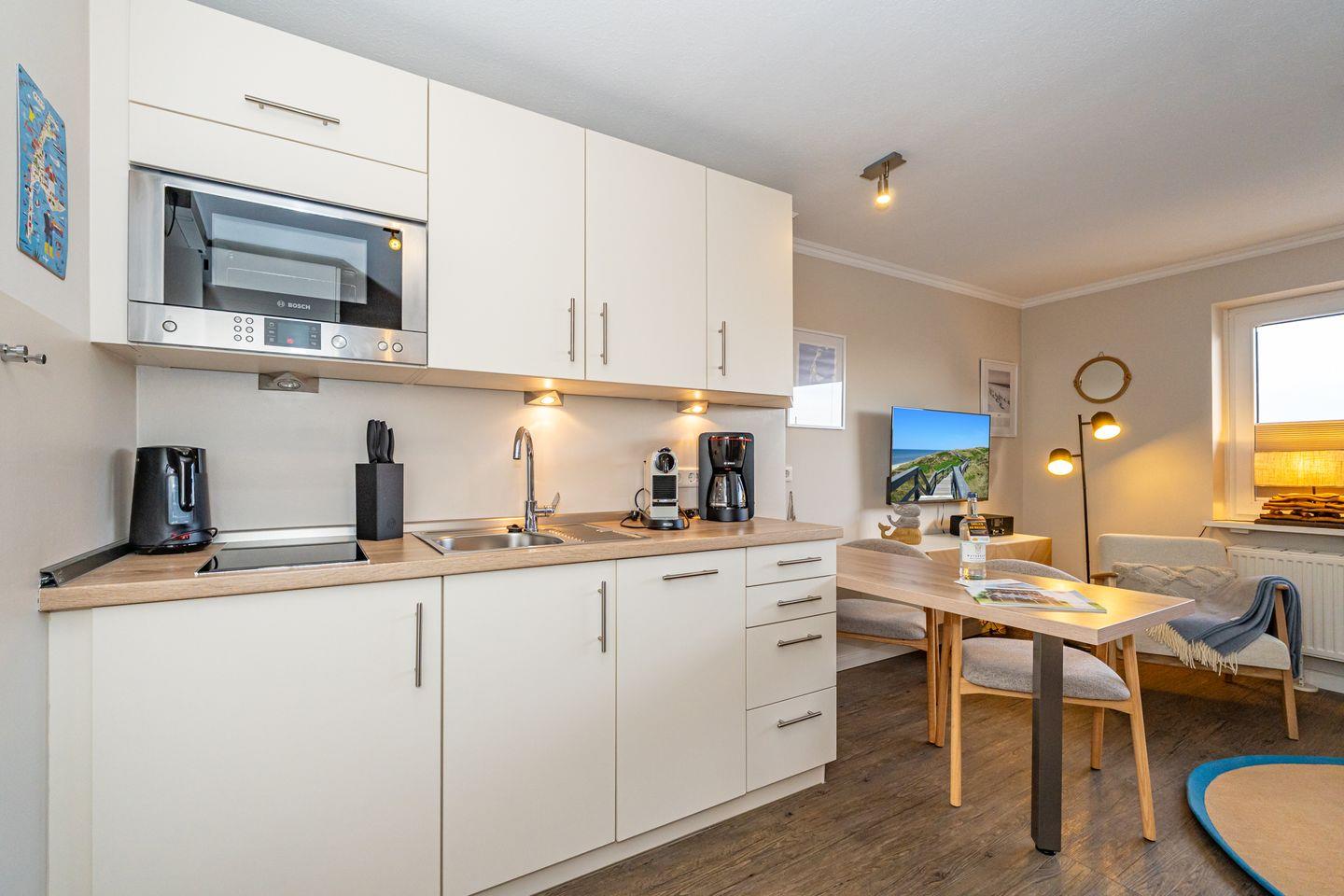 Der offene Wohn- und Schlafbereich ist modern und praktisch gestaltet und verfügt über ein bequemes Bett, ein Sofa sowie einen Zugang zu einem möblierten Balkon (saisonal). Hier können Sie die frische Nordseeluft genießen oder in einem eigenen Strandkorb auf dem Balkon entspannen. Die offene Küche fügt sich harmonisch in das Wohnkonzept ein und ist umfassend ausgestattet: Ihnen stehen ein Kühlschrank, eine Mikrowelle, eine Spülmaschine sowie ein 2-Platten-Herd zur Verfügung. Ergänzend stehen eine Nespresso-Espressomaschine, eine klassische Kaffeemaschine, ein Wasserkocher und ein Toaster bereit. Somit sind Sie bestens ausgestattet, um sich auch im Urlaub unkompliziert selbst zu versorgen.