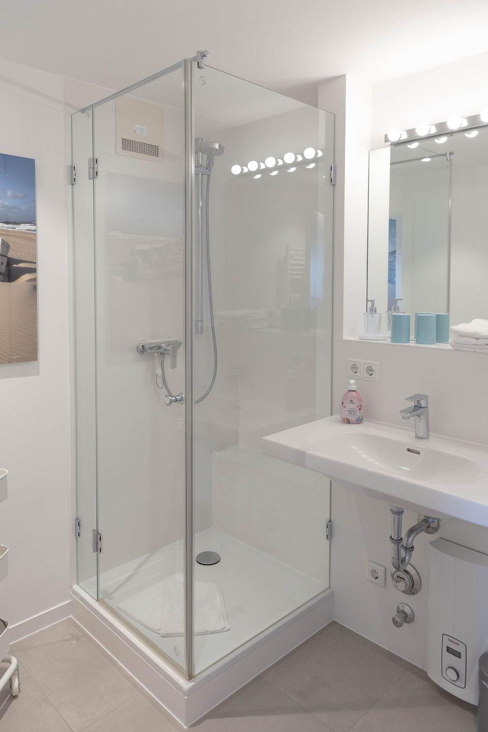 Das Badezimmer verfügt über eine moderne Dusche, ein Waschbecken mit Spiegel und warmes Wasser, um Ihnen den Aufenthalt so angenehm wie möglich zu gestalten. Die Wohnung ist als Nichtraucher-Unterkunft ausgewiesen.