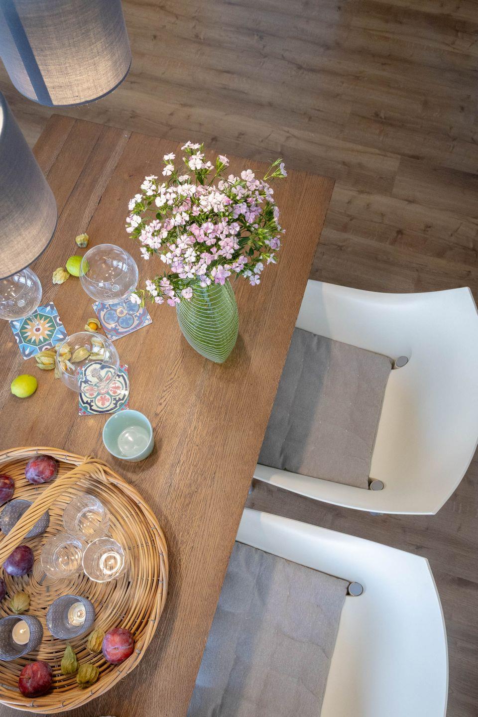 Der Wohnbereich überzeugt mit einer einladenden Sofaecke und einem Essbereich, der zum Verweilen einlädt. Der moderne Vinylboden im Wohnzimmer sorgt für eine angenehme Atmosphäre und ist pflegeleicht. Das Schlafzimmer ist mit einem Teppichboden ausgestattet und bietet erholsame Ruhe. Insgesamt gibt es drei Räume – ein Wohnzimmer, ein Schlafzimmer und einen weiteren Bereich, der flexibel genutzt werden kann. Die Ferienwohnung bietet damit ausreichend Platz für bis zu vier Schlafmöglichkeiten, wobei zwei Zustellbetten verfügbar sind.