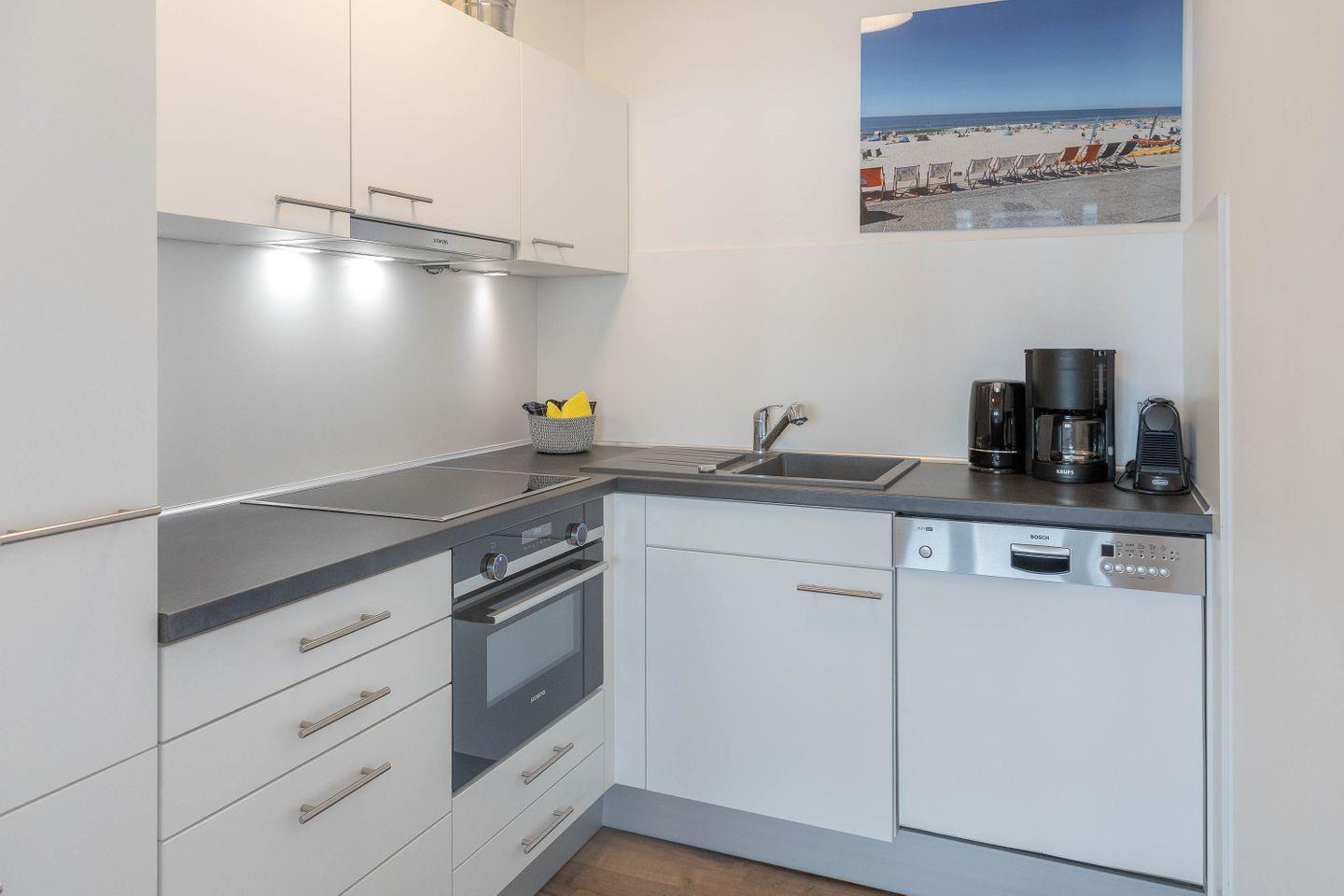 Die offen zum Wohnzimmer gestaltete Küche ist voll ausgestattet: Neben einem Herd, einem Backofen und einer Mikrowelle stehen Ihnen auch eine Spülmaschine, ein Kühlschrank mit Gefrierfach, eine Kaffeemaschine, ein Wasserkocher und ein Toaster zur Verfügung. Für das leibliche Wohl sind zudem Geschirr und Besteck, Geschirrhandtücher und alle notwendigen Küchenutensilien vorhanden, sodass auch ausgedehnte Mahlzeiten bequem zubereitet werden können.