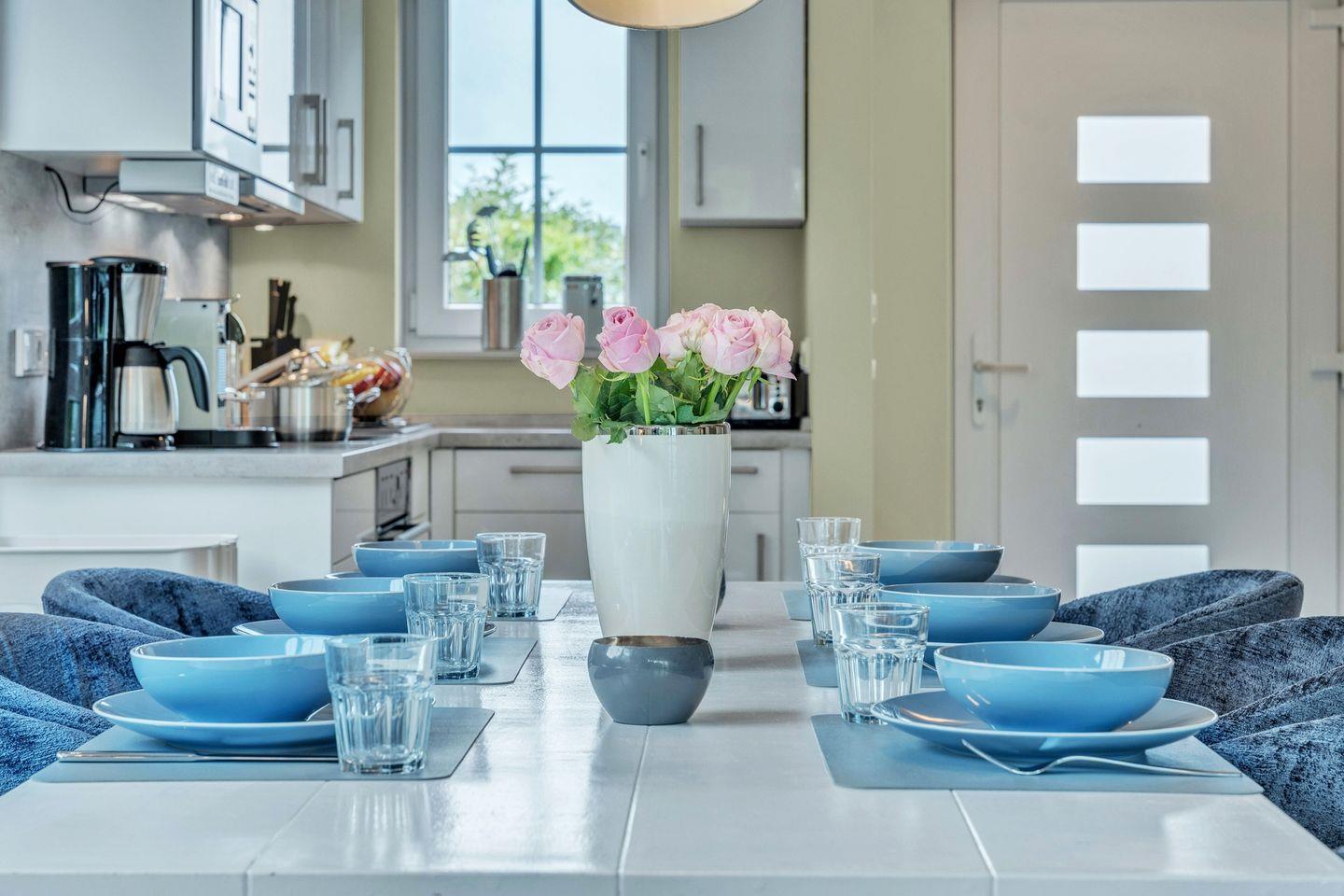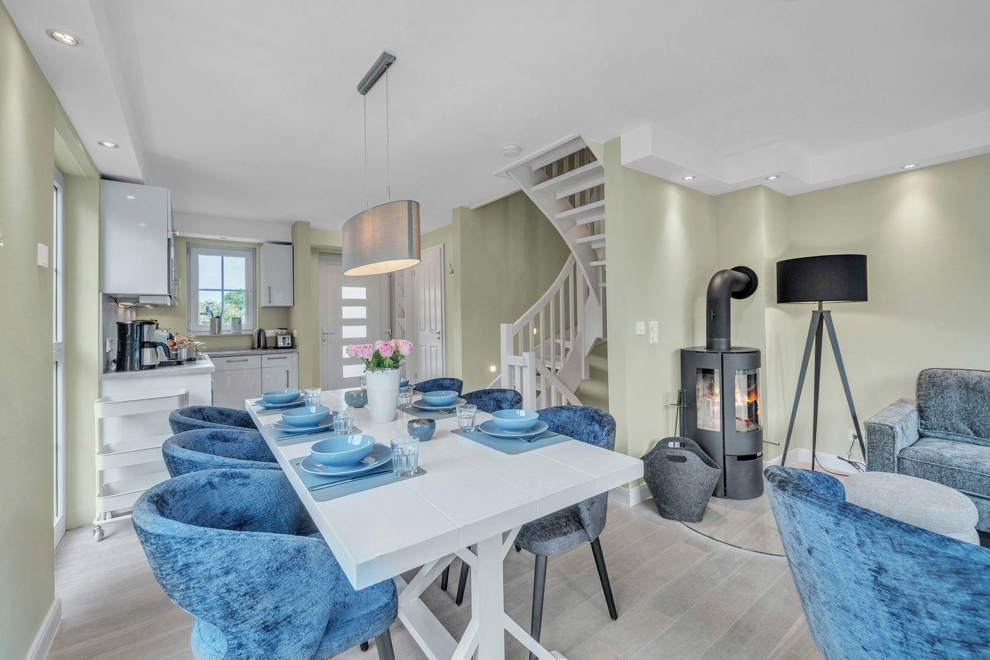 Dieses hochwertige Feriendomizil bietet Platz für bis zu 8 Personen (Empfehlung: Maximal 4 Erwachsene und 4 Kinder). Das Haus ist in einem hellen, modernen Design eingerichtet. Sie erwartet ein modernes Wohlfühl-Ambiente mit hellem Landhausdielenparkett, Flachbildfernsehern in allen Schlafzimmern, 3 wunderschönen Bädern aus Naturstein - zusätzlich eine Sauna sowie eine Whirlbadewanne. Nicht zu vergessen der Kaminofen, welcher gemütliche Abende im Wohnzimmer garantiert. Das Haus teilt sich wie folgt auf: Im Untergeschoss haben Sie ein großes Schlafzimmer mit Doppelbett (180x200xm), ein Badezimmer, sowie die Sauna. Im Erdgeschoss haben Sie ein Badezimmer mit Dusche, die große Küche, den Essbreich, sowie das Wohnzimmer. im 1. OG finden Sie ein großes Schlafzimmer mit einem Doppelbett (180x200cm), ein kleineres Schlafzimmer mit einem Kojenbett (140x200cm), sowie ein Badezimmer mit Dusche. Im Dachgeschoss finden Sie das vierte Schlafzimmer mit 2 Einzelbetten. Dies würden wir aufgrund der Dachgeschrägen für Kinder empfehlen. Außerdem handelt es sich um eine offene Galerie. WLAN vorhanden (ohne Gewähr)