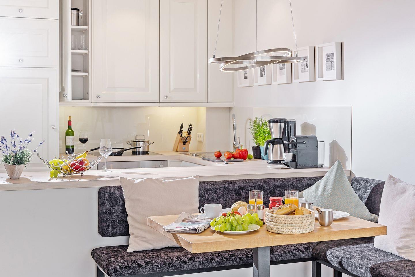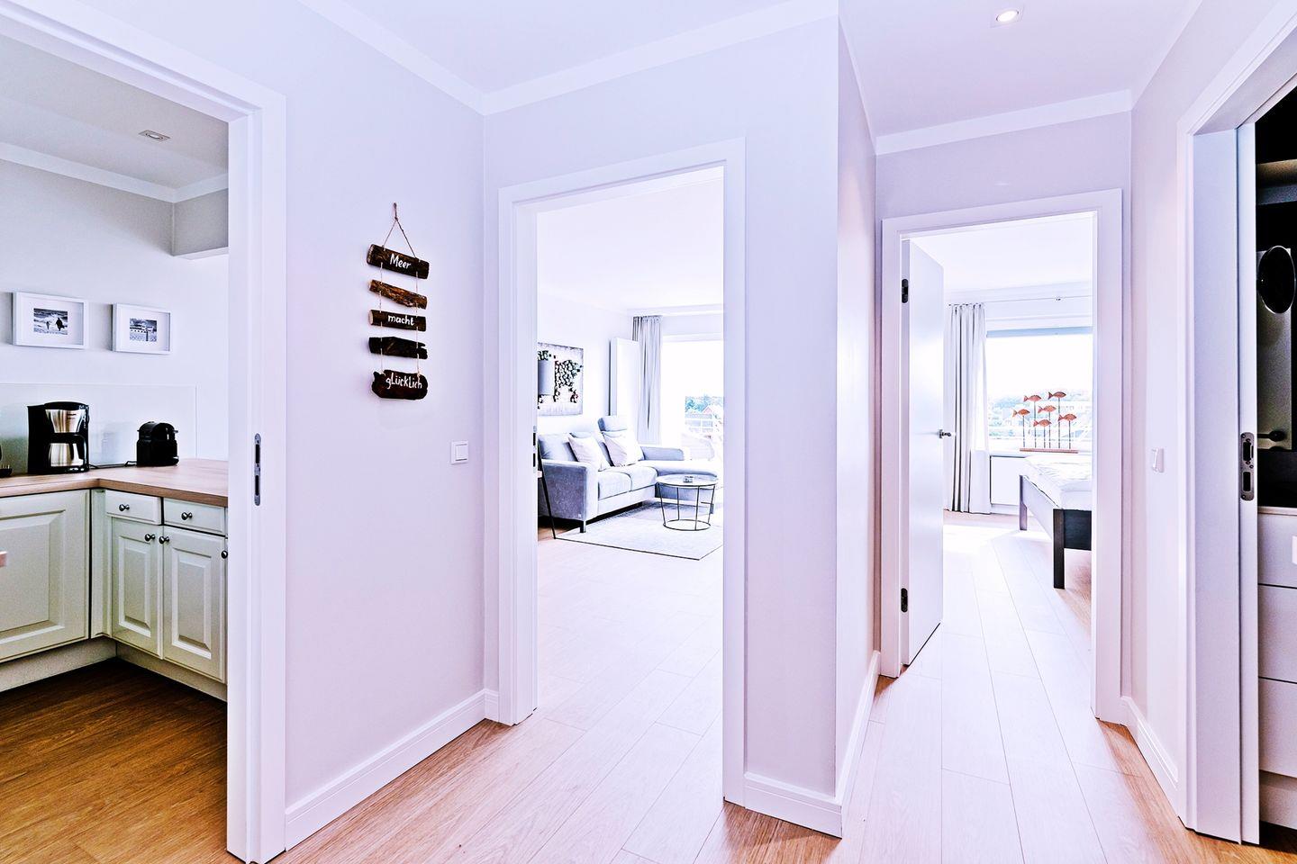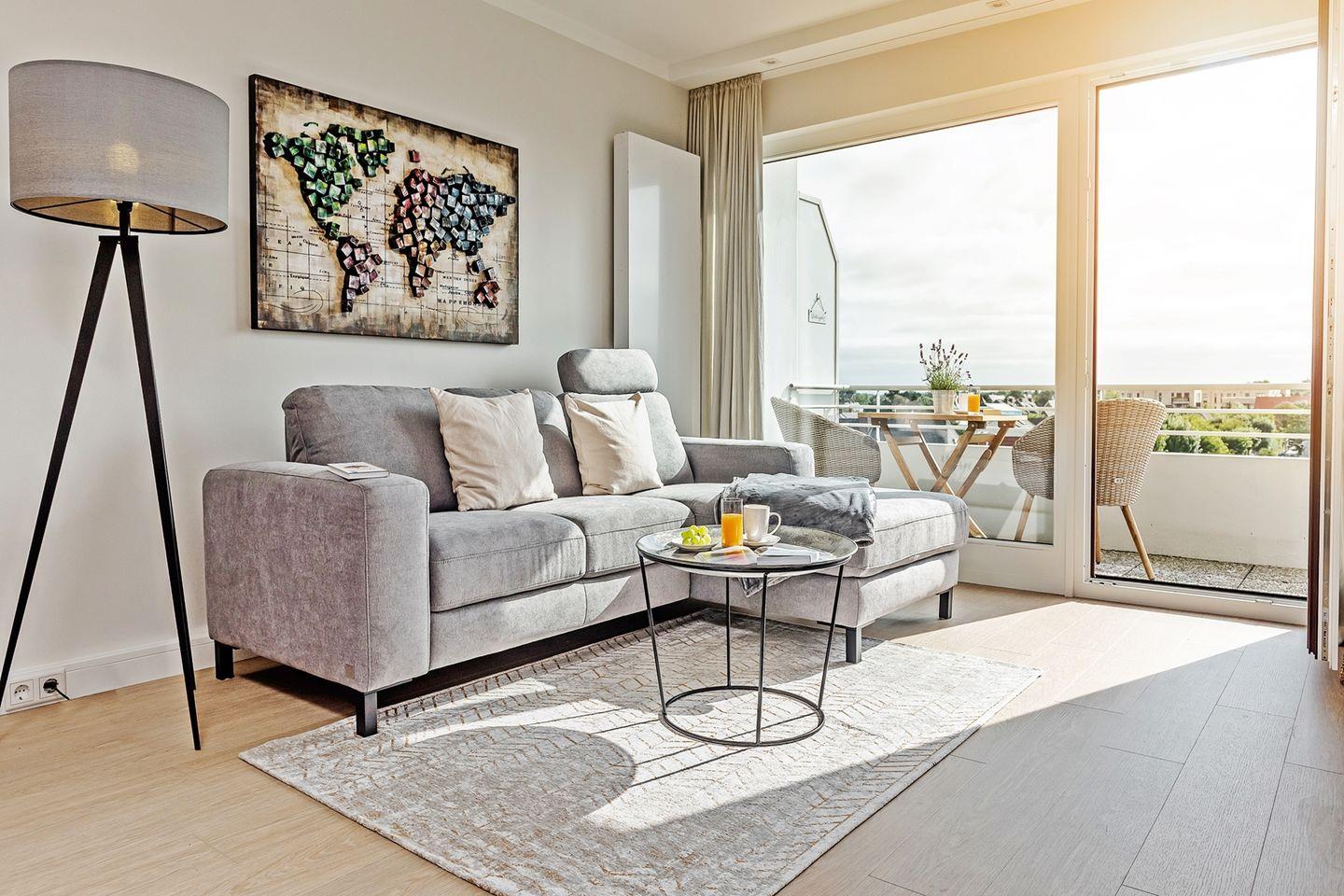 Im obersten Stockwerk eines gepflegten Appartementhauses finden Sie diese bezaubernde, ca. 54 m² große Eckwohnung für 2 Personen. Das helle Domizil unterteilt sich in eine großzügige Diele mit Garderobe, ein schönes Duschbad, eine Abstellkammer mit Waschtrockner, ein freundliches Schlafzimmer mit viel Schrankraum, ein stylisches und sehr gemütliches Wohnzimmer mit separierter, voll ausgestatteter Küche und einen großen, fast 9 m langen Balkon mit bequemen Balkonmöbeln. Ihr Lieblingsplatz! WLAN vorhanden (ohne Gewähr)