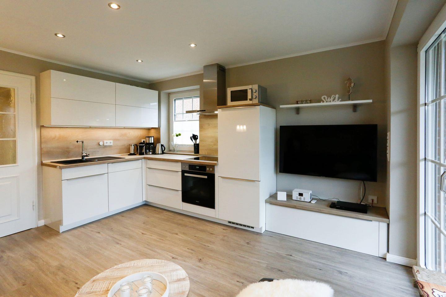 voll ausgestattete neue Küche mit Ceranfeld, Backofen, Kühl-Gefrierkombination, Nespresso-Maschine und Kaffemaschine, Milchaufschäumer, Wasserkocher etc.