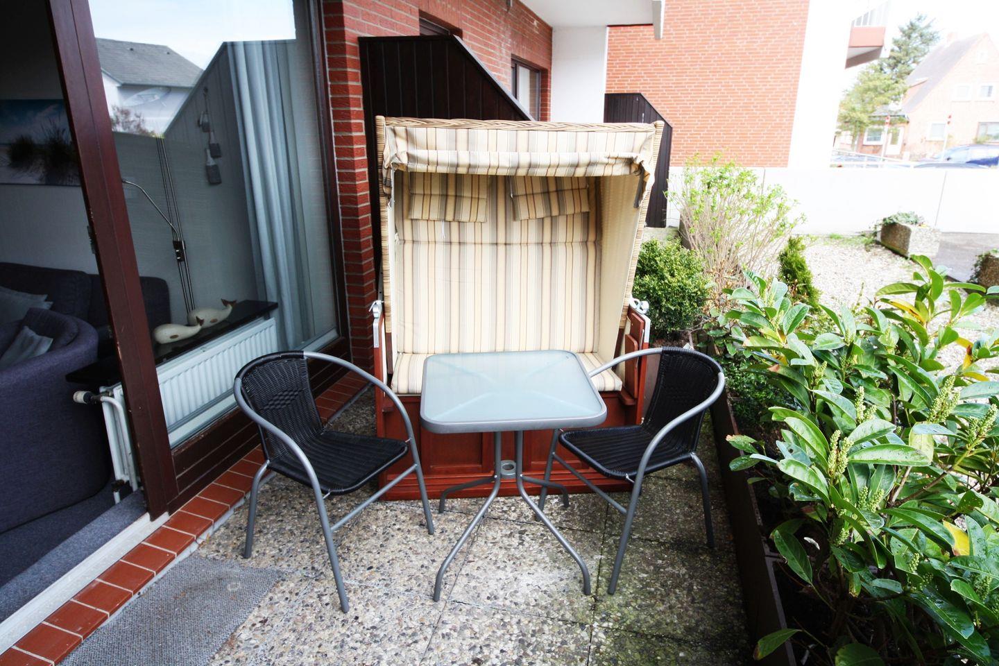 Die Unterkunft liegt im EG und hat eine möblierte Terrasse nach Osten. Das 1-Zimmer Appartement hat nun auch noch einen wunderschön wohnlichen Fliesenbelag durchgängig erhalten.